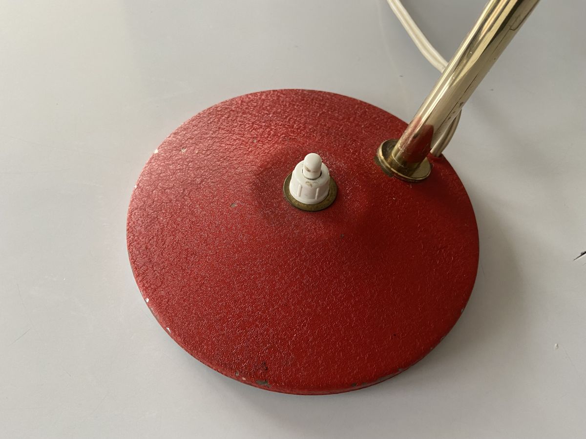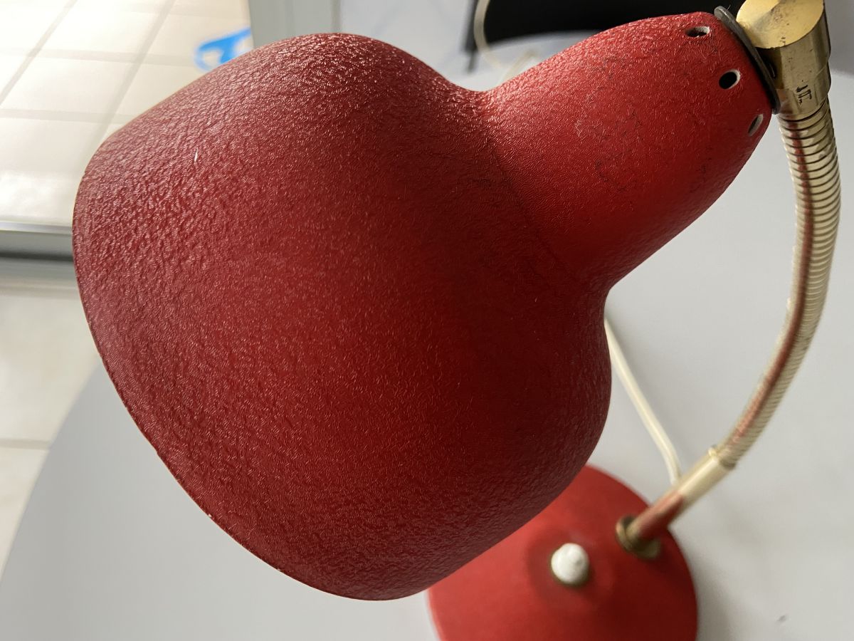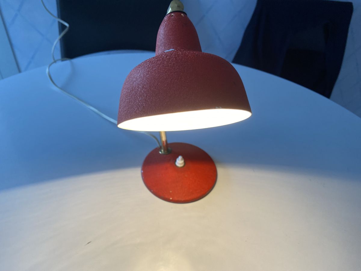 Petite lampe de bureau des années 60 en métal sablé rouge, quelques marques du temps (voir photos), hauteur 30cm, diamètre abat-jour 12cm, diamètre socle 13cm, bon état.