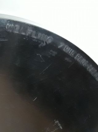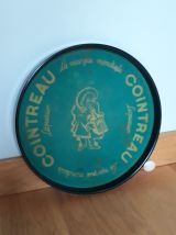 Plateau rond en plastique dur noir (bakélite?), habillé d'une feutrine verte publicitaire pour la marque de liqueur Cointreau. Il me semble qu'à l'origine c'est un plateau pour faire le service dans les bars et cafés, la feutrine absorbant les débordements des verres et les empêchant de glisser, mais je sais aussi que c'était souvent utilisé comme plateau pour jouer aux dés dans ces mêmes bars, la feutrine réduisant alors les bruits de lancés ! A l'arrière on peut lire « Welfling 7 rue Paul-Lelong Paris » . Il est en bon état structurel : pas de fissure, pas d'éclats, mais il présente des rayures et marques sur le plastique et le tapis est taché. Il mesure 30 cm de diamètre, 3 cm de hauteur au niveau du rebord et pèse 560 g.