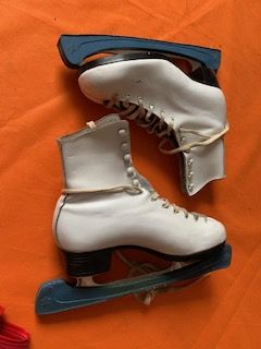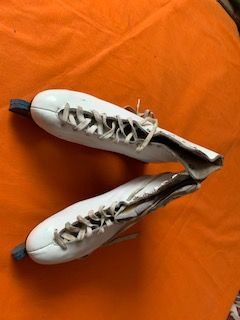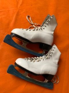 Patins à glace femme, cuir blanc, pointure 39. Marque Ours années 1980, modèle Chamonix. Livrés avec lacets et protège-lame.