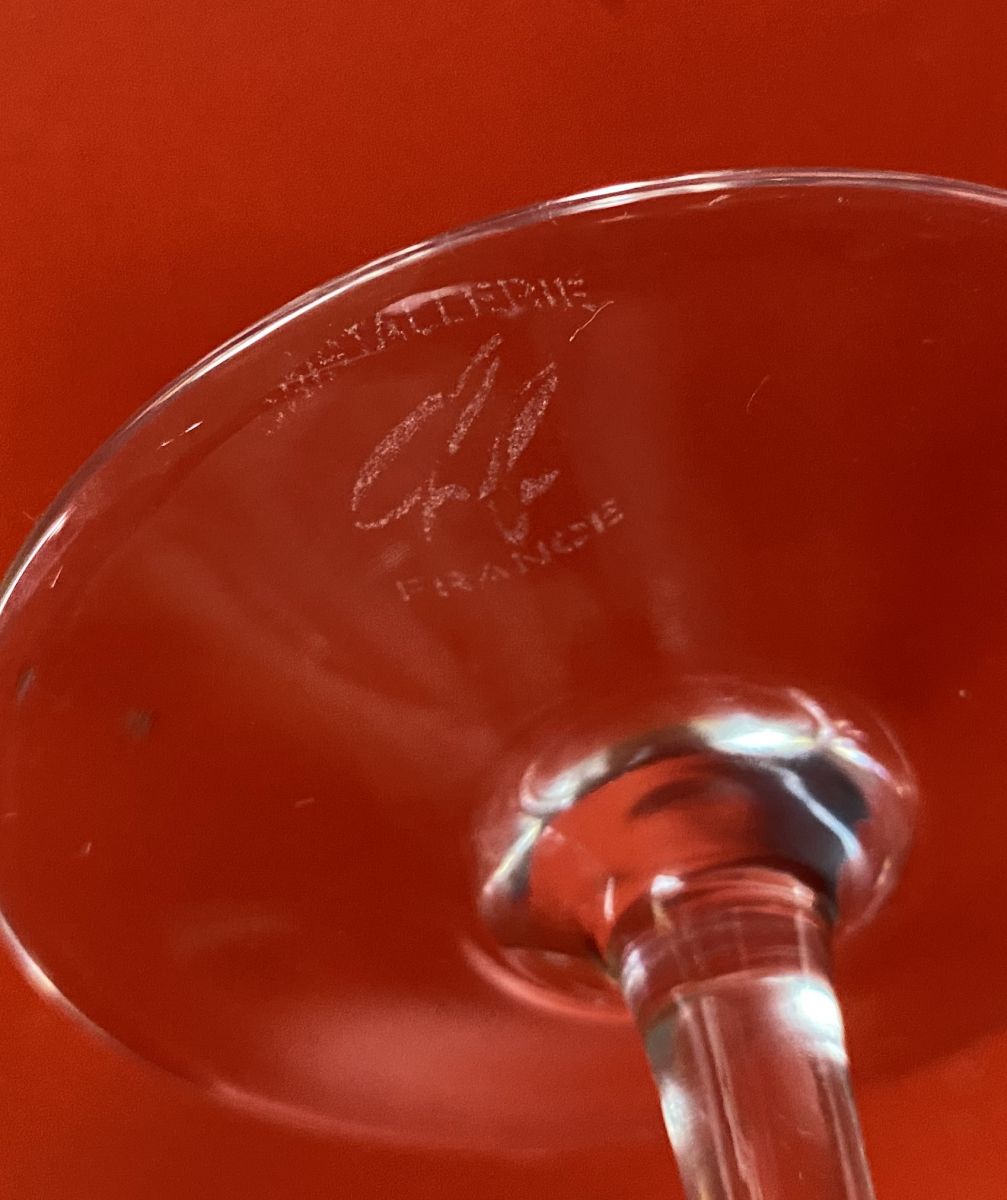 Chaque verre est signée Cristallerie de France sur le pied (voir photo). Etat comme neuf (les traits rouges sur les photos sont les reflets de la lumière).