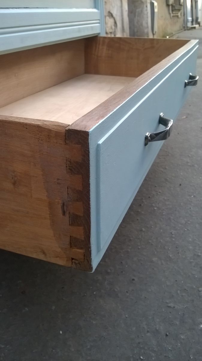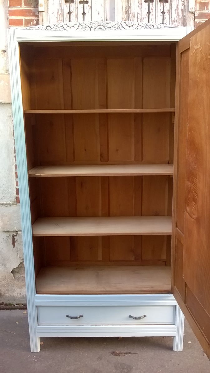 Armoire parisienne année 30. Elles a été entièrement poncer et repeinte en bleu vert. Intérieur aménagée de 3 étagères, un grand tiroir en bas de la porte. La serrure a été changé. Quelque marque du a sons âges, reste en b elle état et stable.