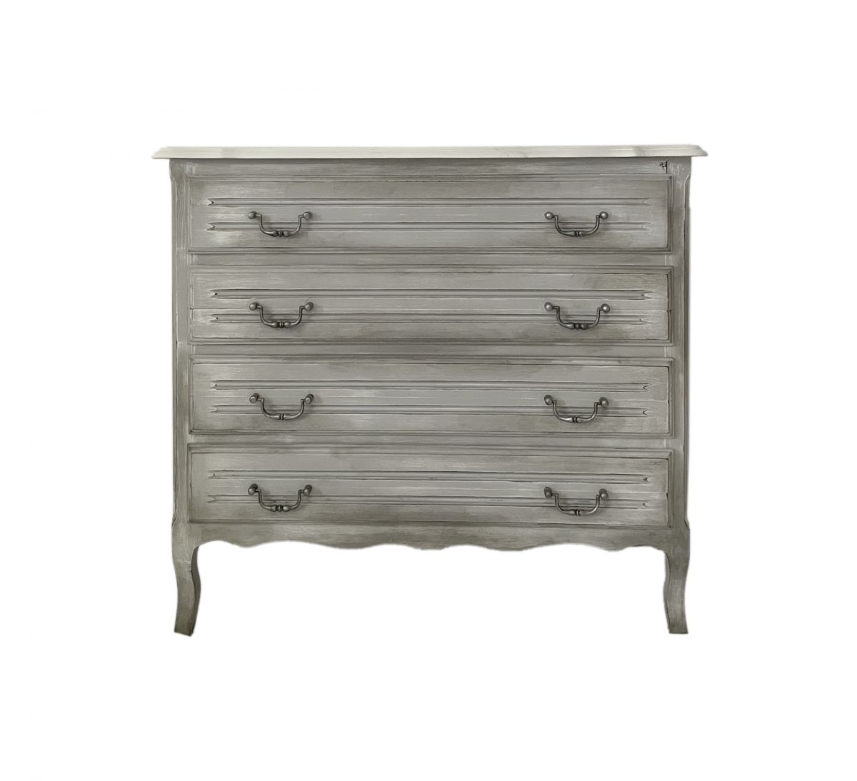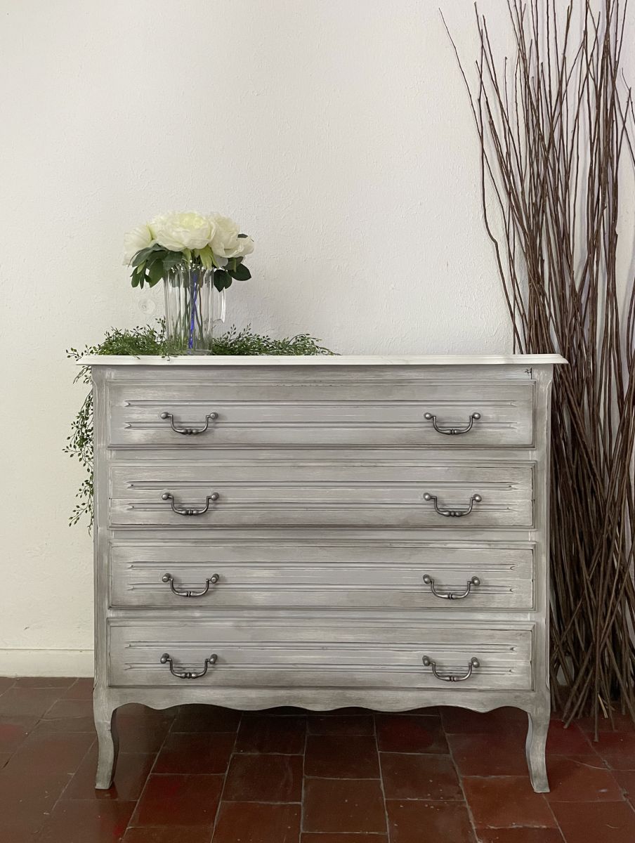 Une commode en bois massif refaite avec des peintures à la craie Paris Grey, Old White et Graphite et de la cire claire et noire.