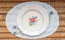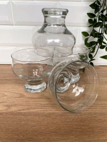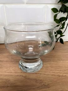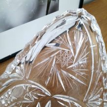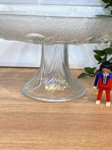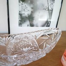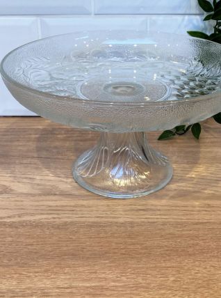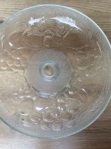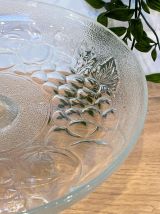Coupe à fruits en verre moulé sur piédouche , motifs de fraises, pommes, poires, raisins sur fond de verre clair et verre Kralika. Bel état, diamètre 26 cm, hauteur 14 cm. V681