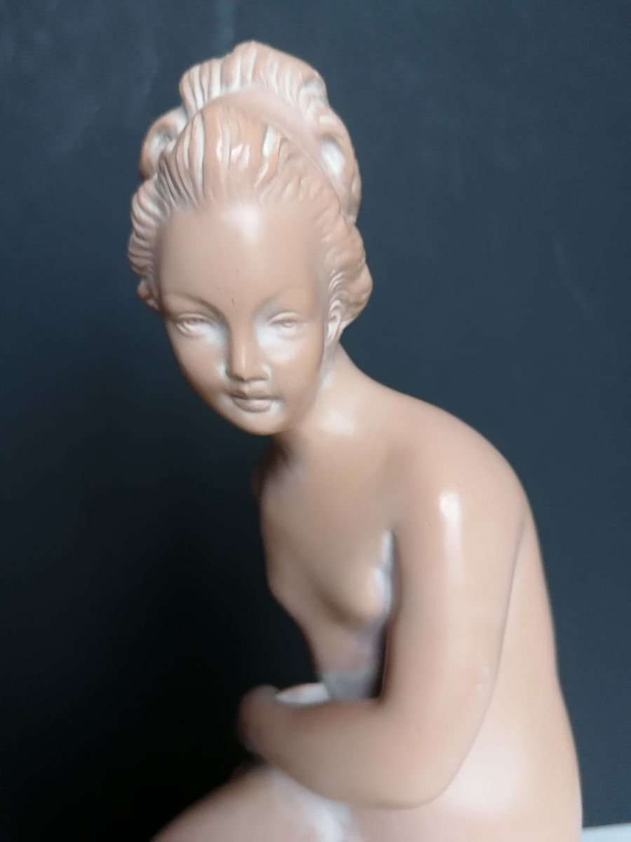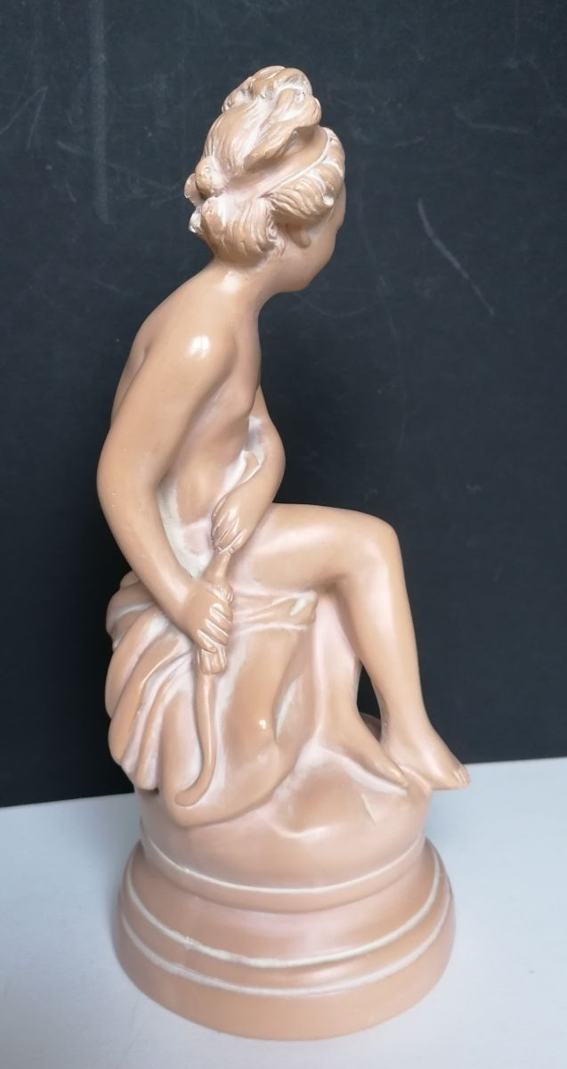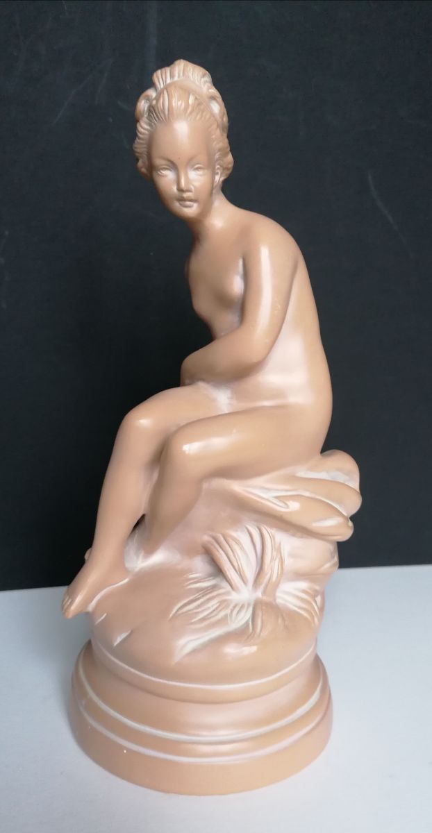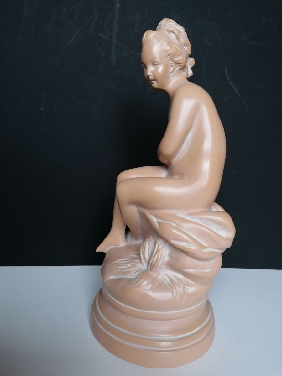 Jeune femme au bain. Sculpture en plâtre patinée terre cuite. De jolie taille et en parfait état.