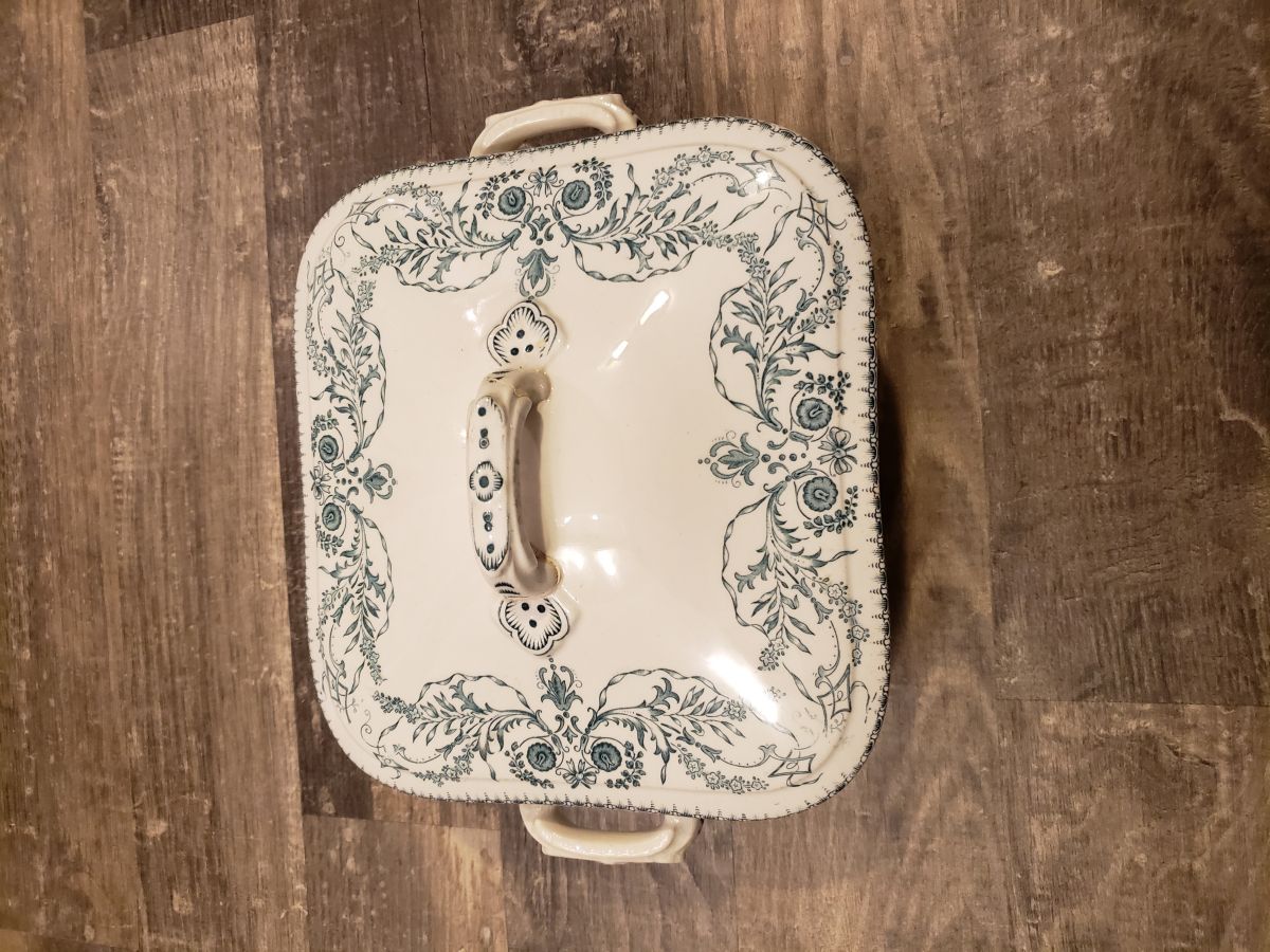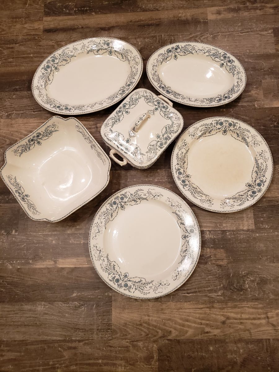 Ensemble de 6 plats en faïence fine de Boch Brères, décor "rubis", ca 1900. Décor dans les tons bleu-vert par transfert, sous émail, sur fond blanc crème: rinceaux et guirlandes fleuries finement détaillées. Estampillées "rubis / bf" (au tampon) Ensemble vintage dans son jus, présentant des traces du passage du temps, sans éclat, seule la poignée du plat carré avec couvercle a été recollé.