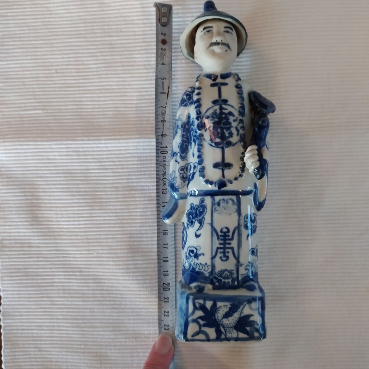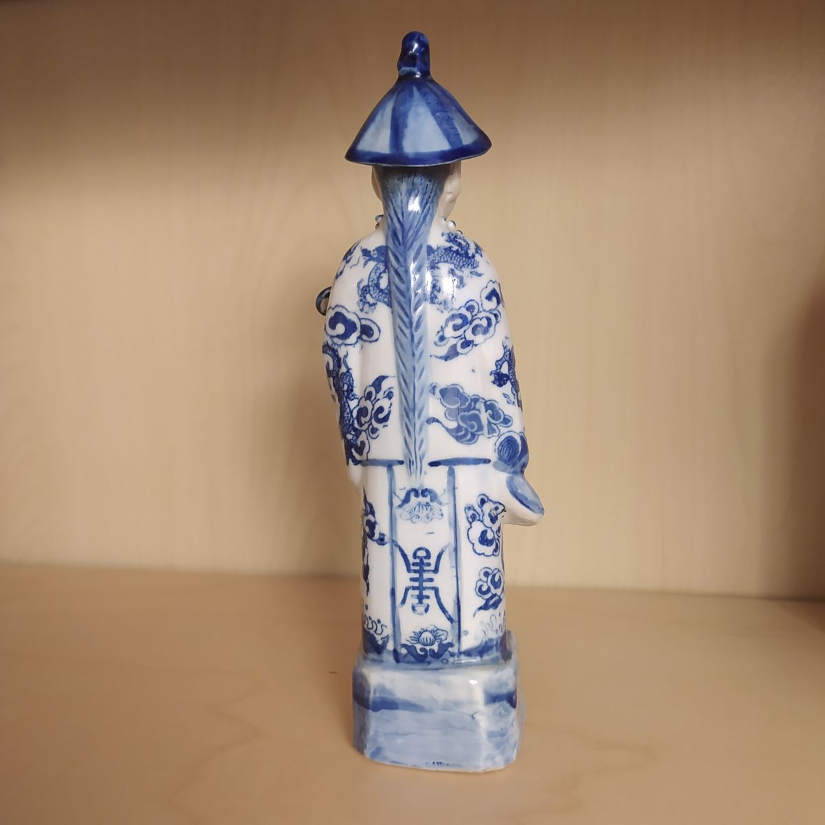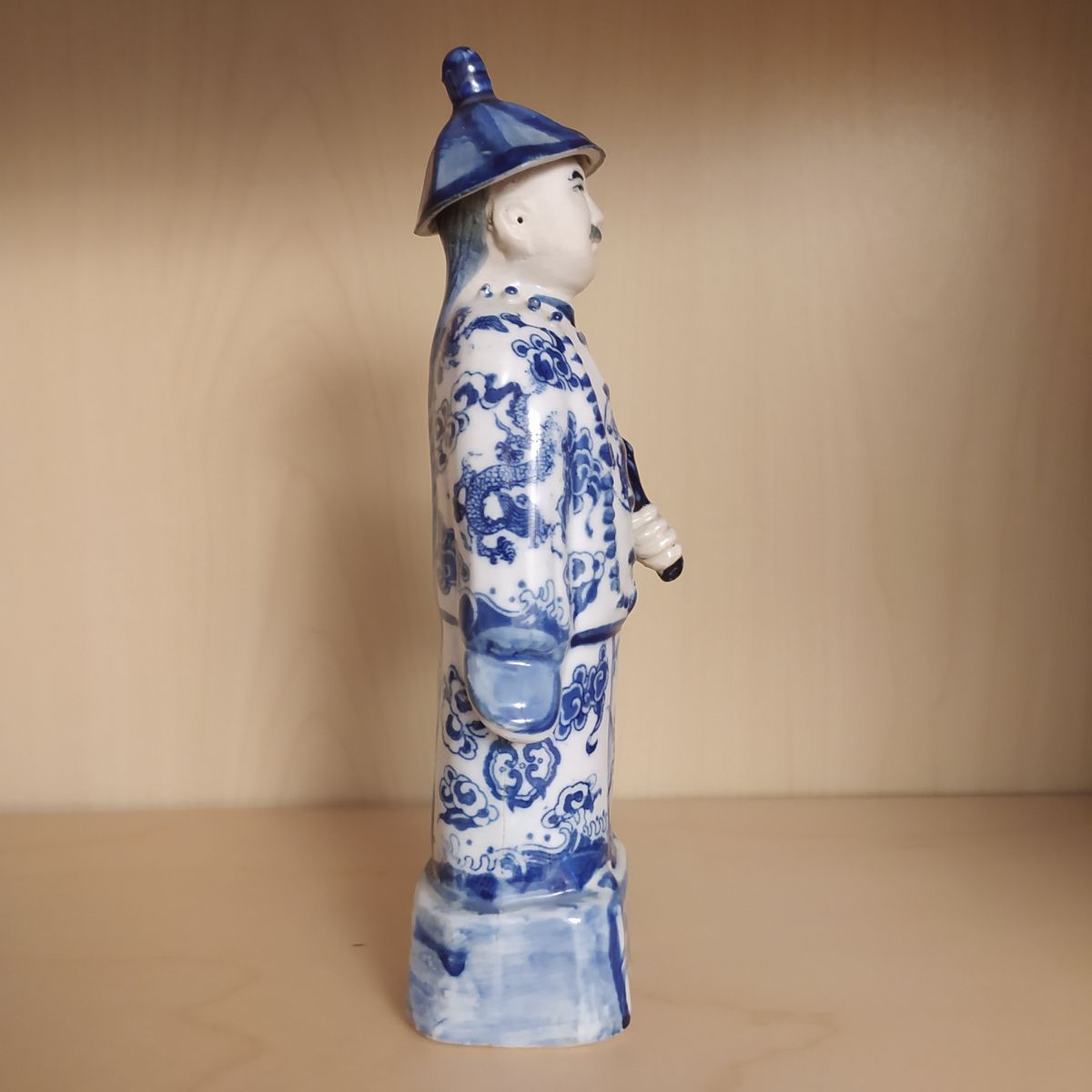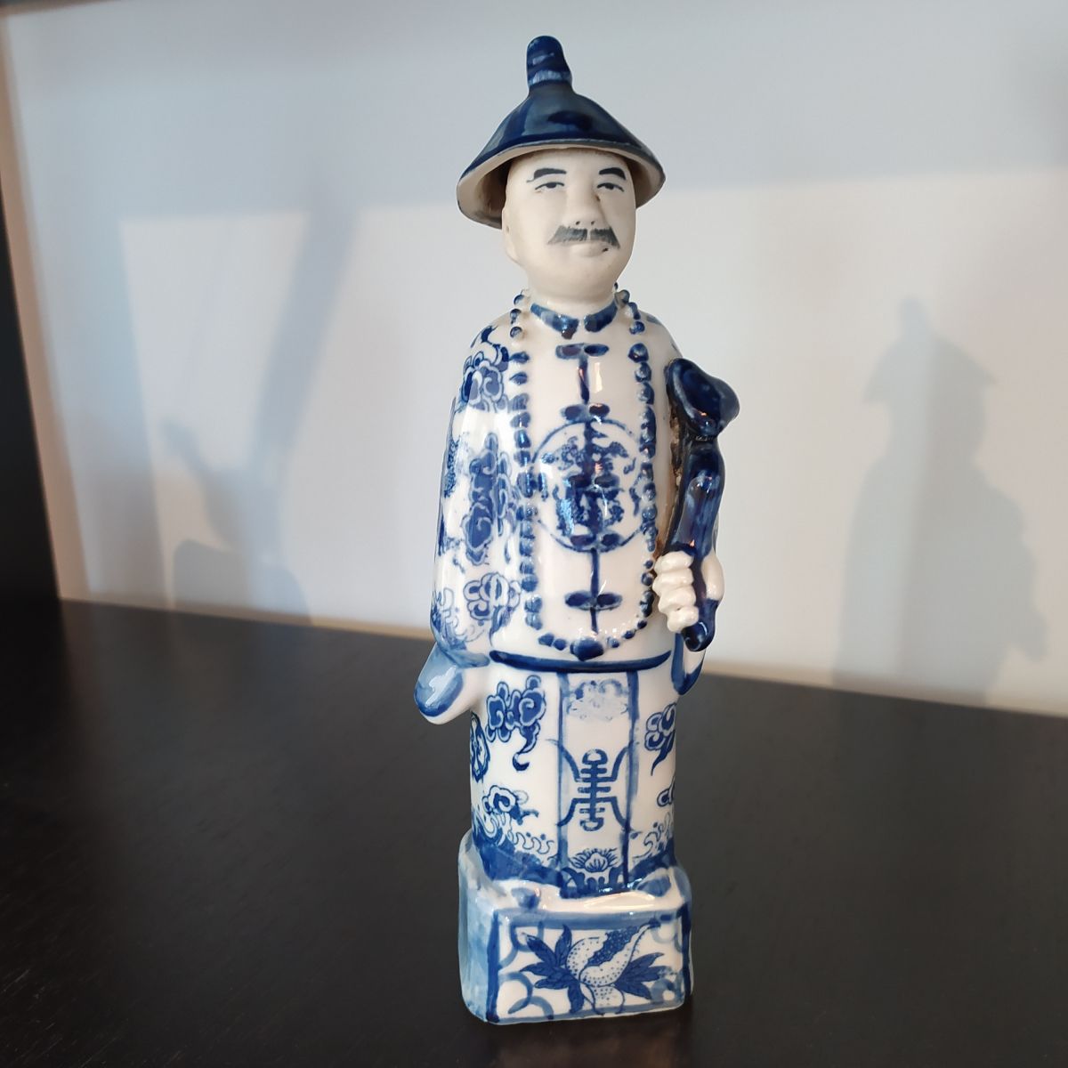 Statuette mandarin chinois en porcelaine blanc bleu