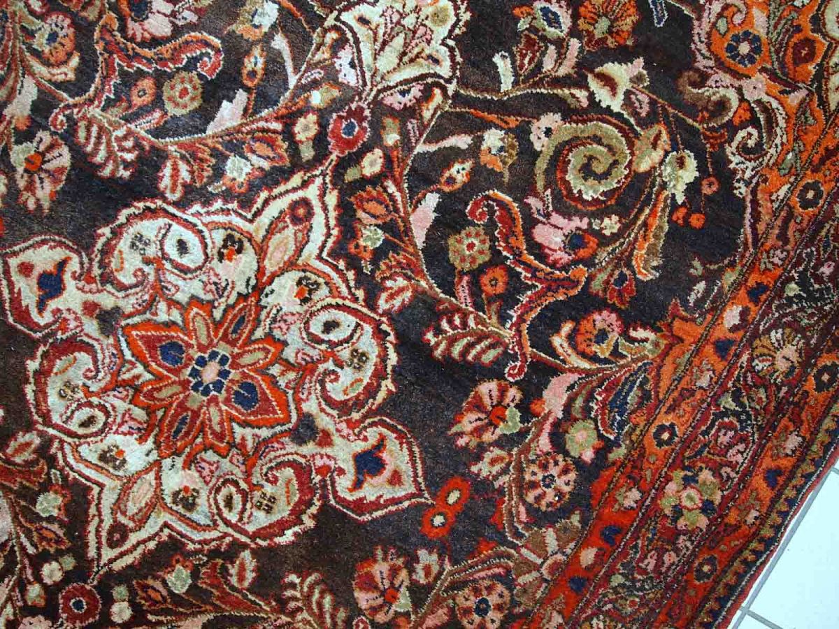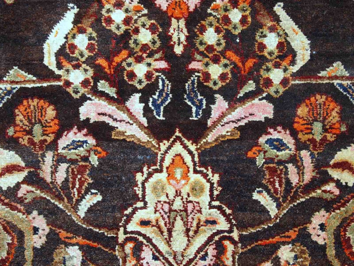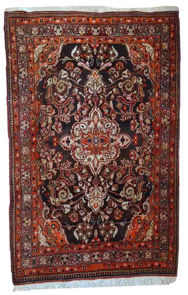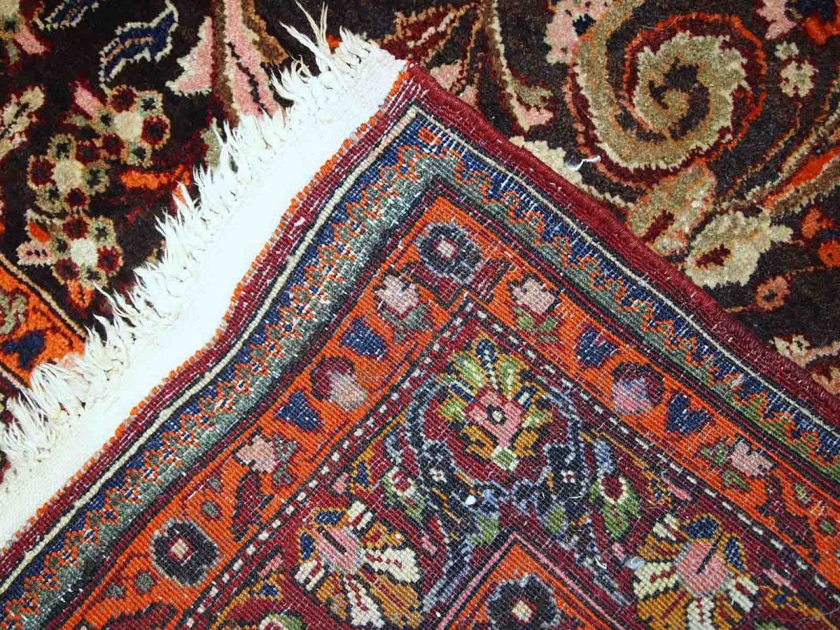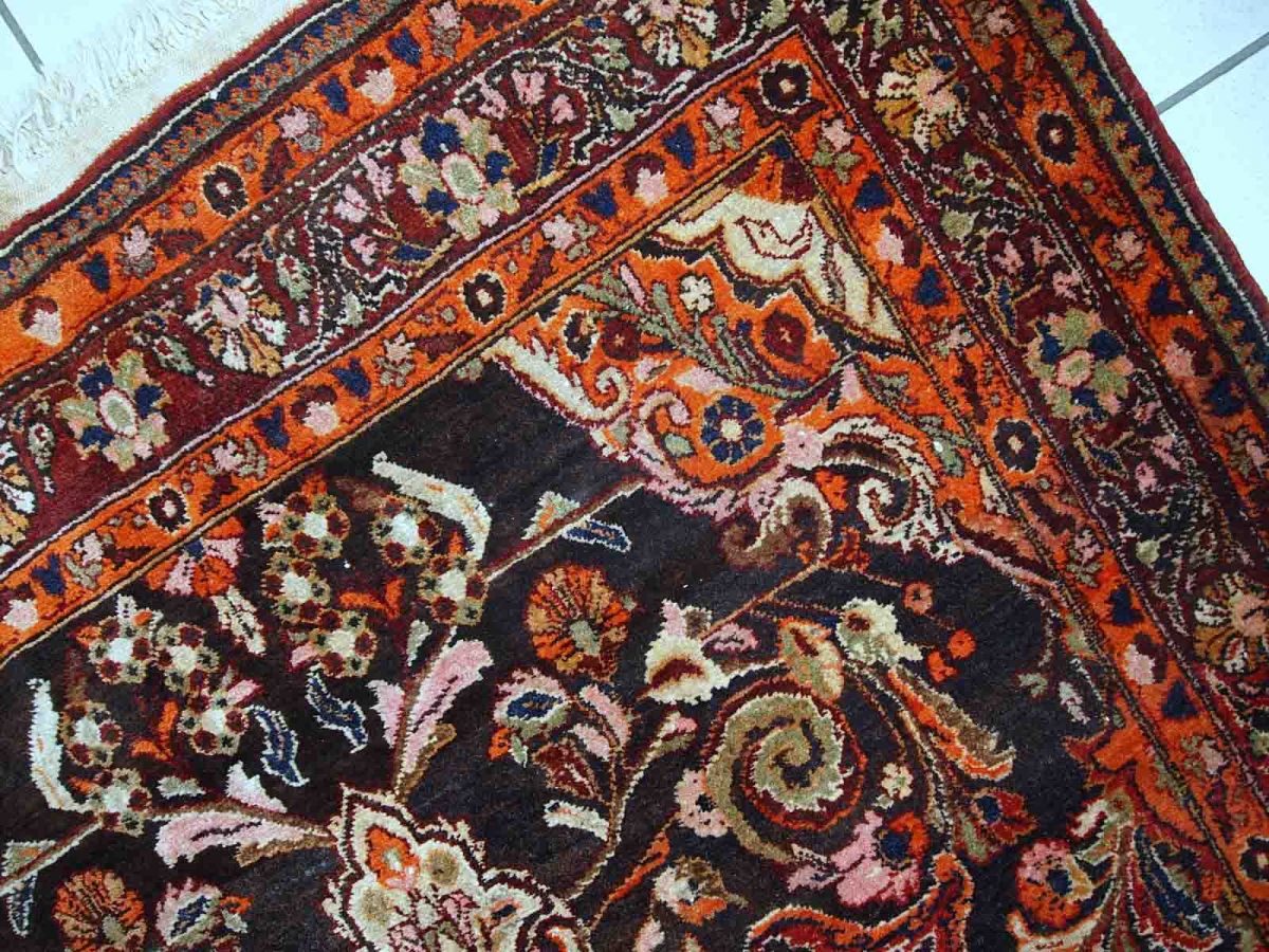 Vintage Tabriz rug in original good condition. It is in chocolate brown and orange wool with some olive and pink shades.