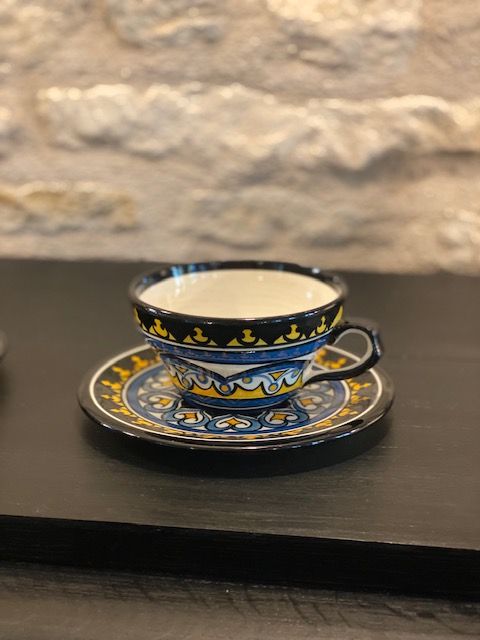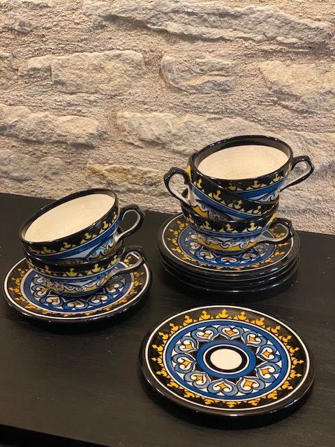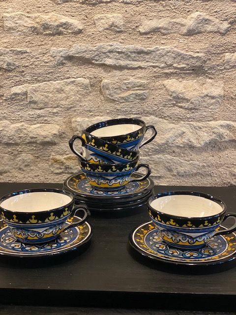 5 grandes tasses et sous-tasses en faïence peinte à la main, Saint Jean de Bretagne.