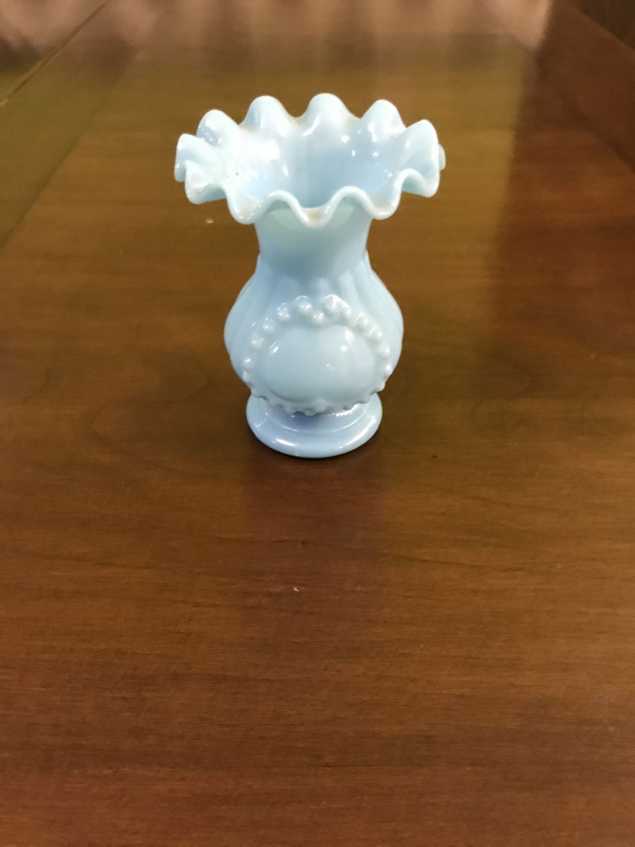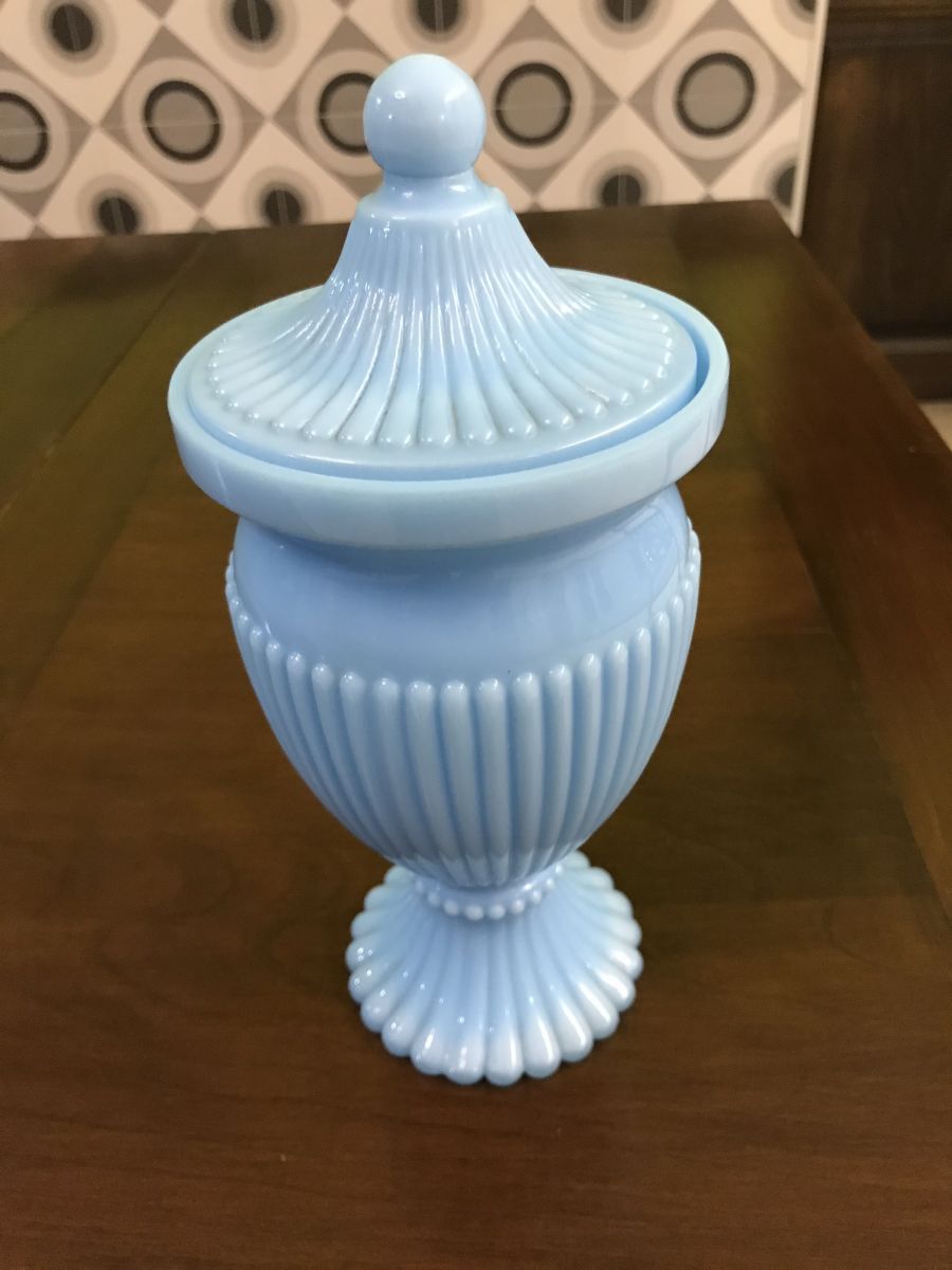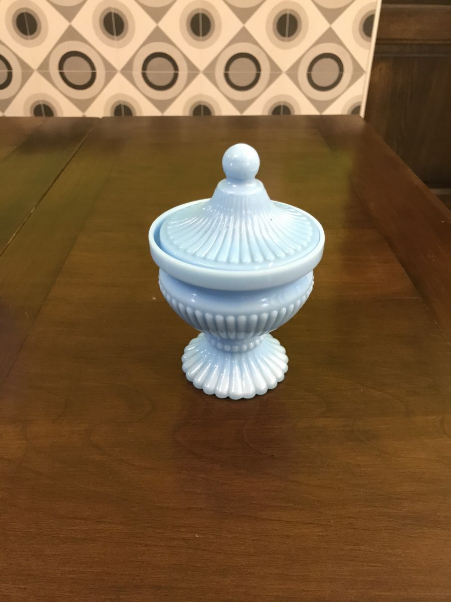 Trio d'opalines bleues. Deux pot à couvercle et un petit vase portant coeur sur le devant.