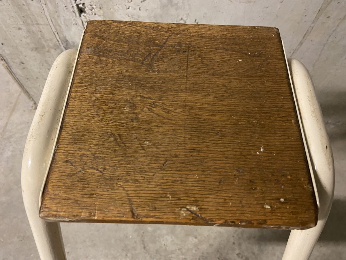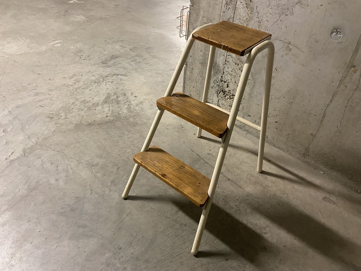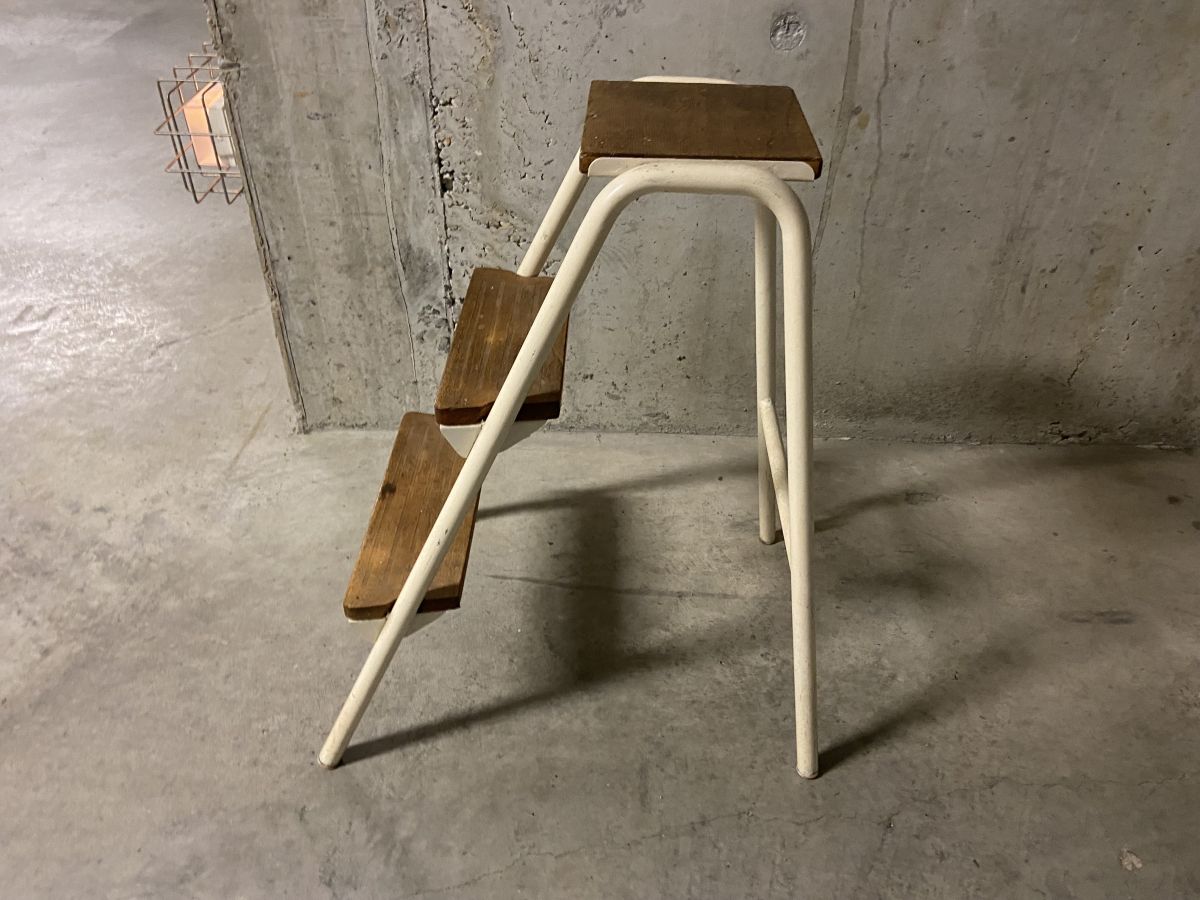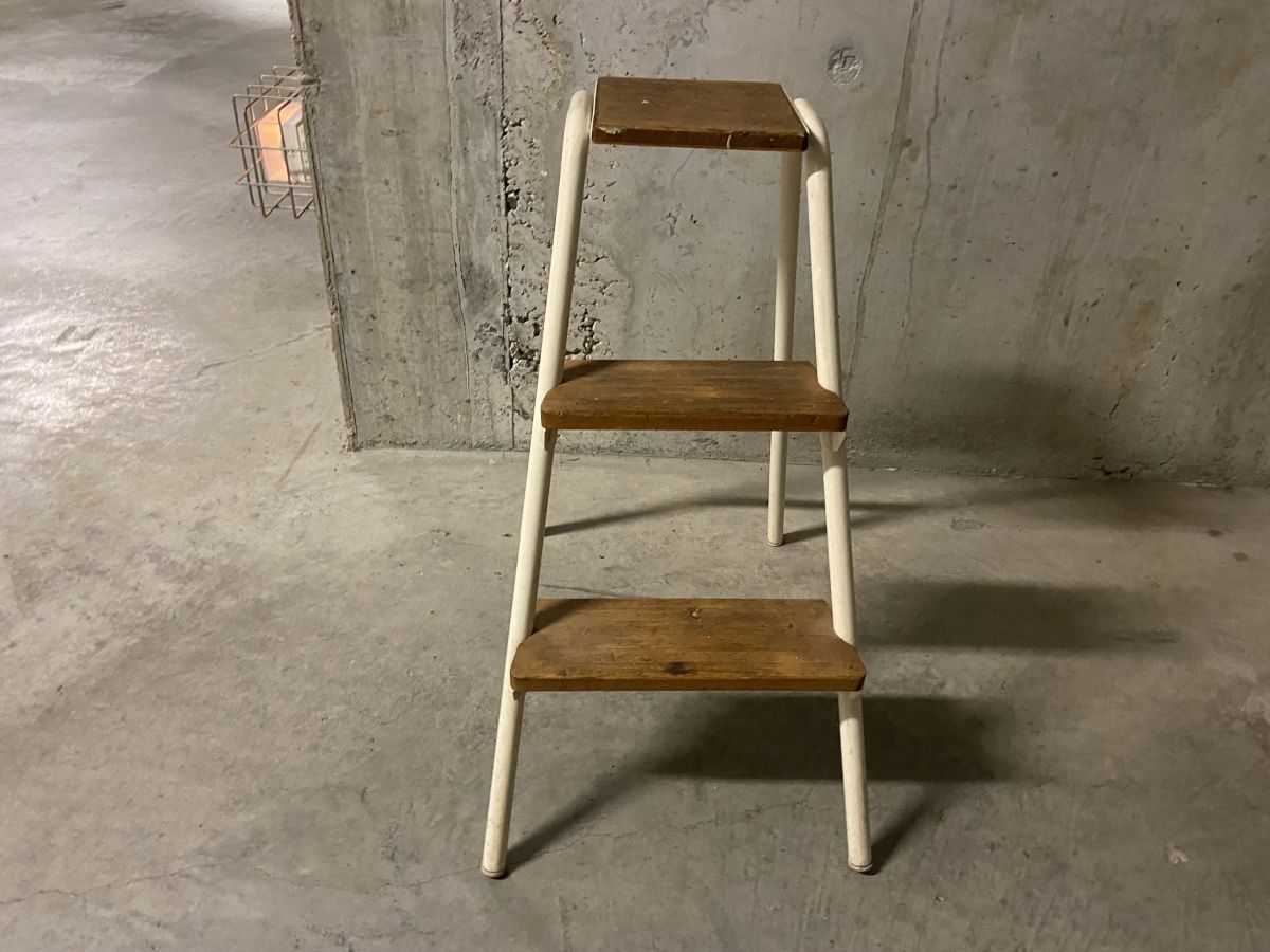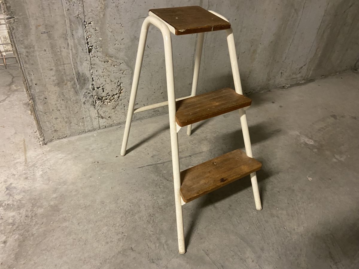 Escabeau d’atelier des années 60, quelques traces d’usage lui conférant tout son charme, structure tubulaire en métal crème, marches en bois, superbe patine, dimensions (cm) : L.39xH.65xP.53, bon état.