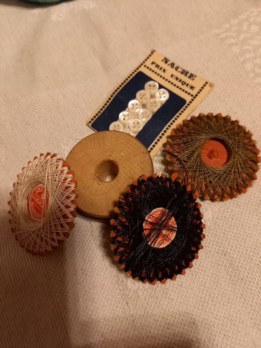 3 Bobines de fils1 bobine en bois de fil de nylon et 1 plaquette de petits boutons en nacre vintage