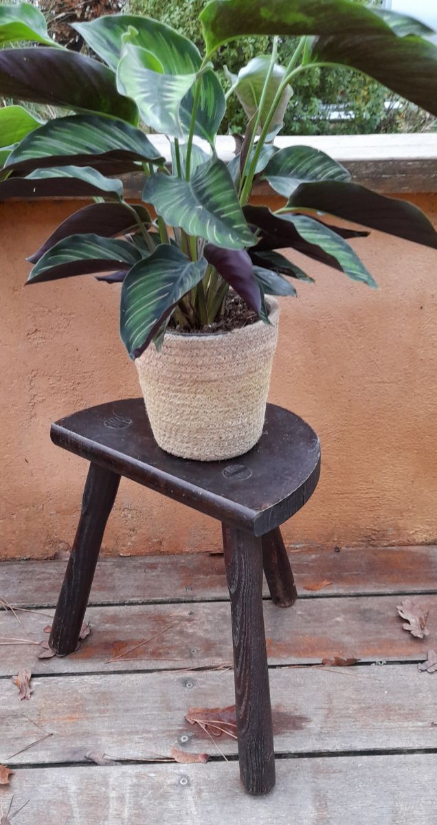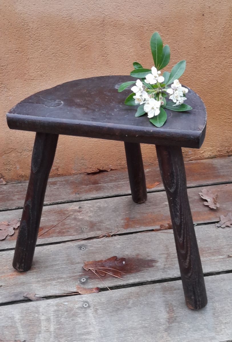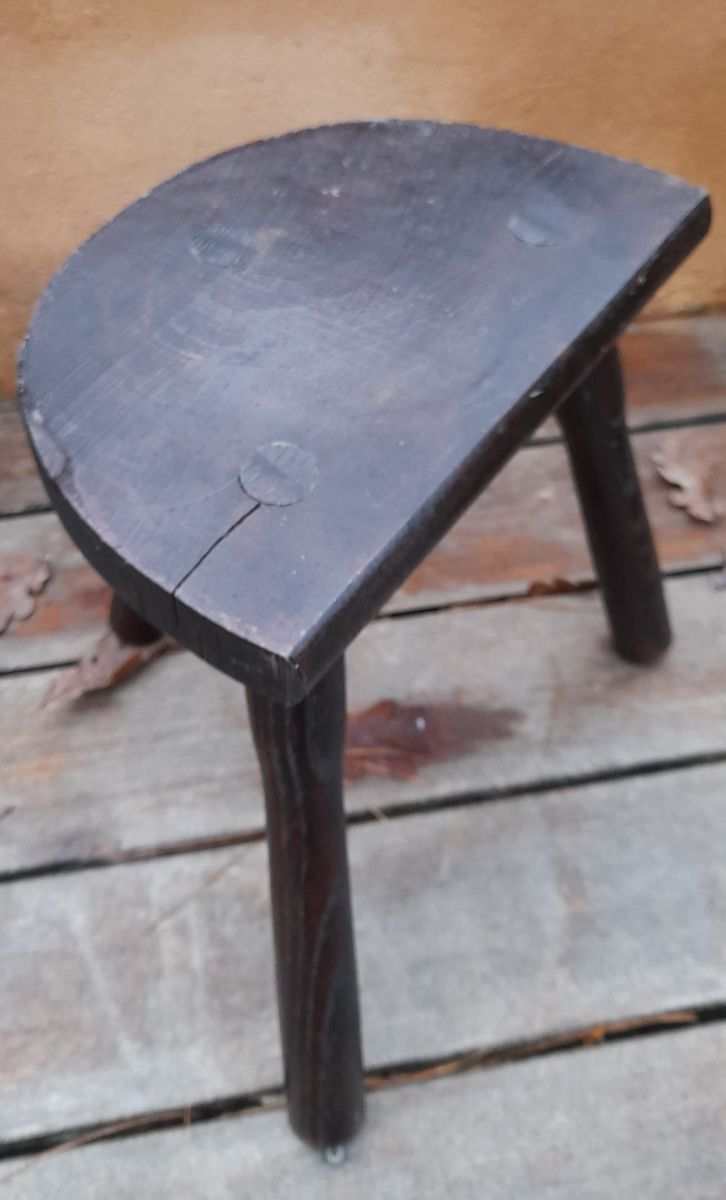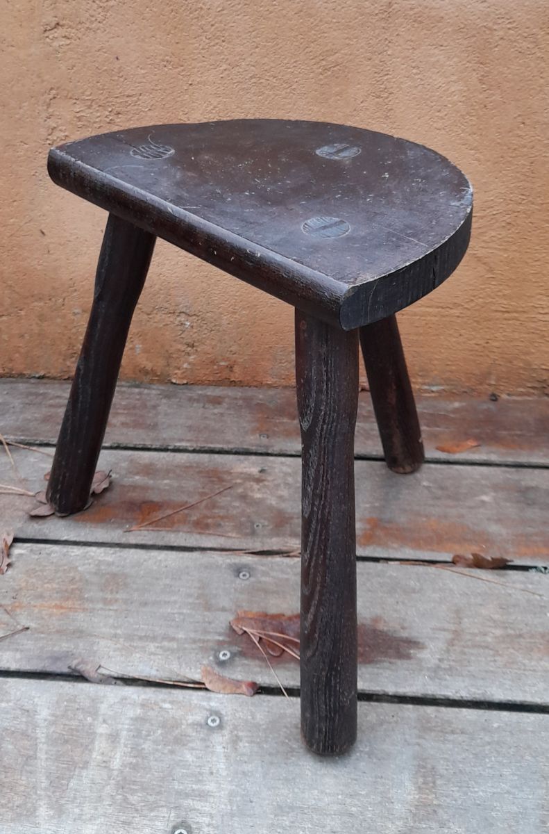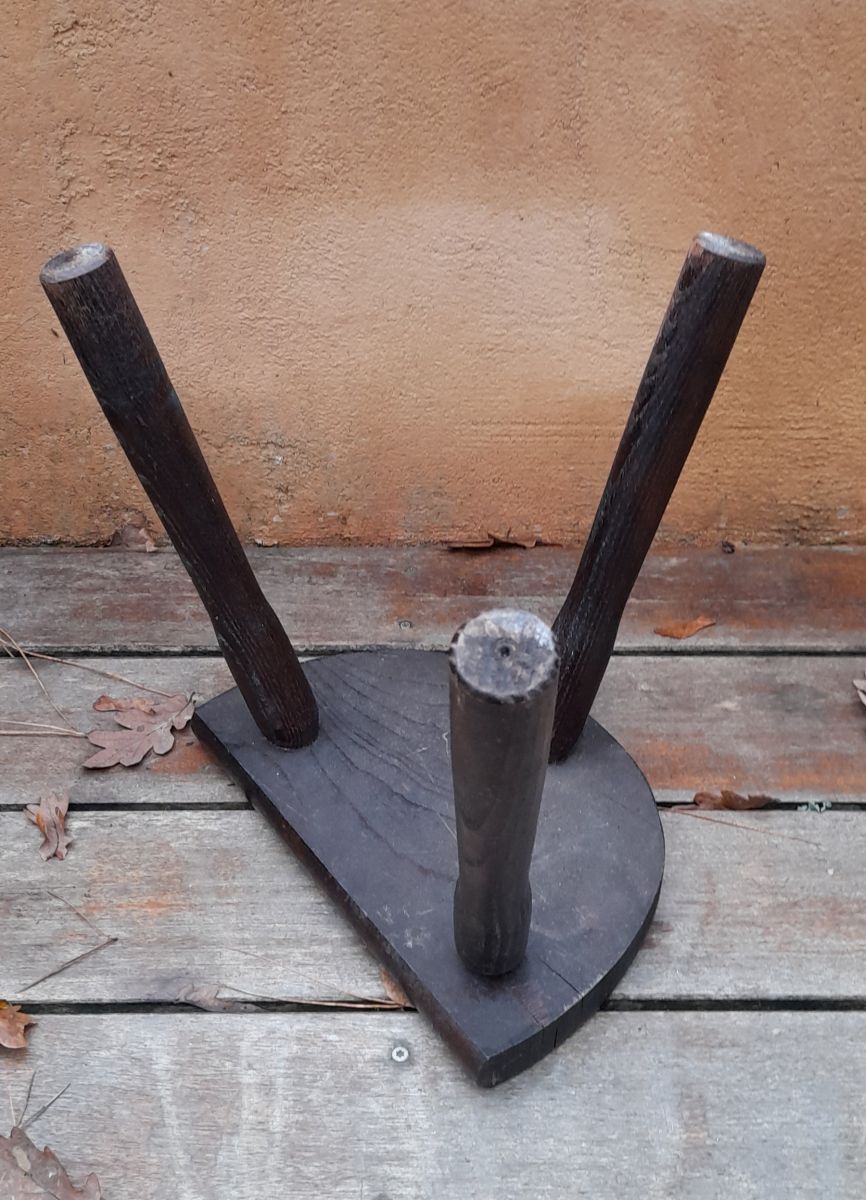 Tabouret de ferme rustique de nos campagnes qui servait autrefois à la traite. 3 pieds en bois massif teinté foncé. L'assise est en demi-cercle. Bien campé sur ses pieds, robuste, il peut servir de tabouret autour d'une table basse, de bout de canapé ou de porte plante. Article présentant des traces du temps mais en bon état, c'est brut c'est authentique et très décoratif. Dans son jus.