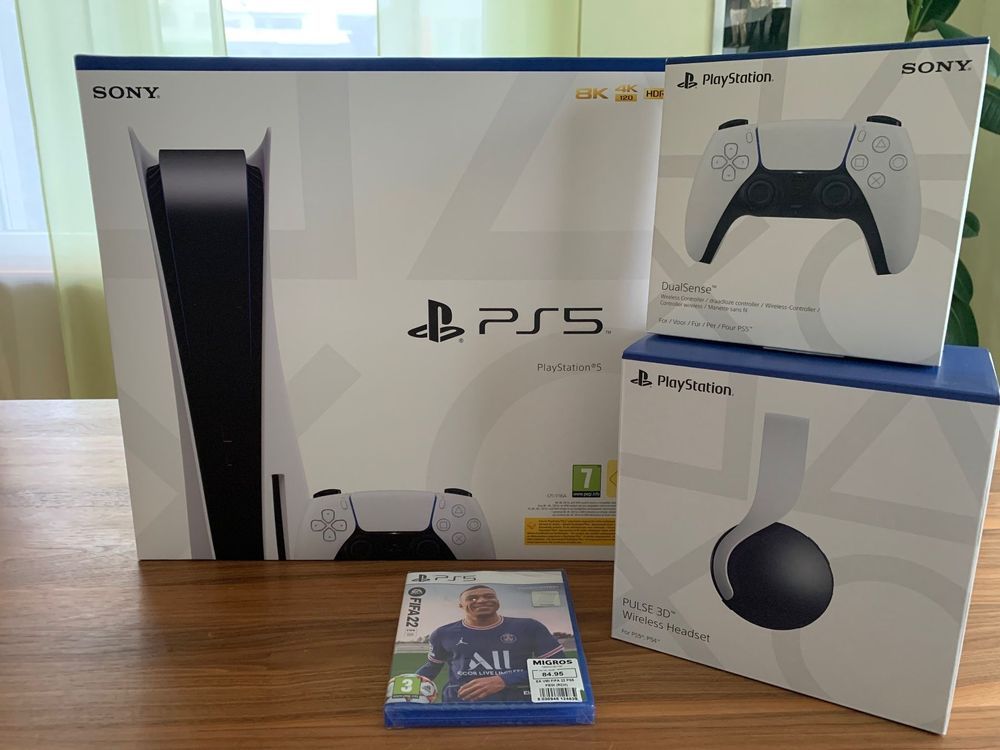 Une Playstation 5 avec lecteur est à vendre. Le bundle comprend une autre manette (2 au total), la nouvelle Fifa 22 et le casque Pulse 3D de Sony. Le paquet a une garantie de 2 ans.