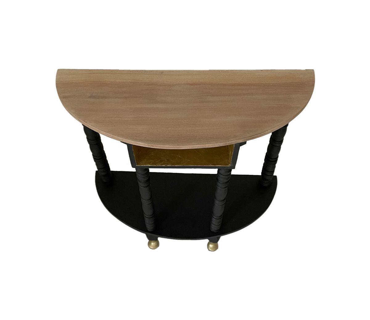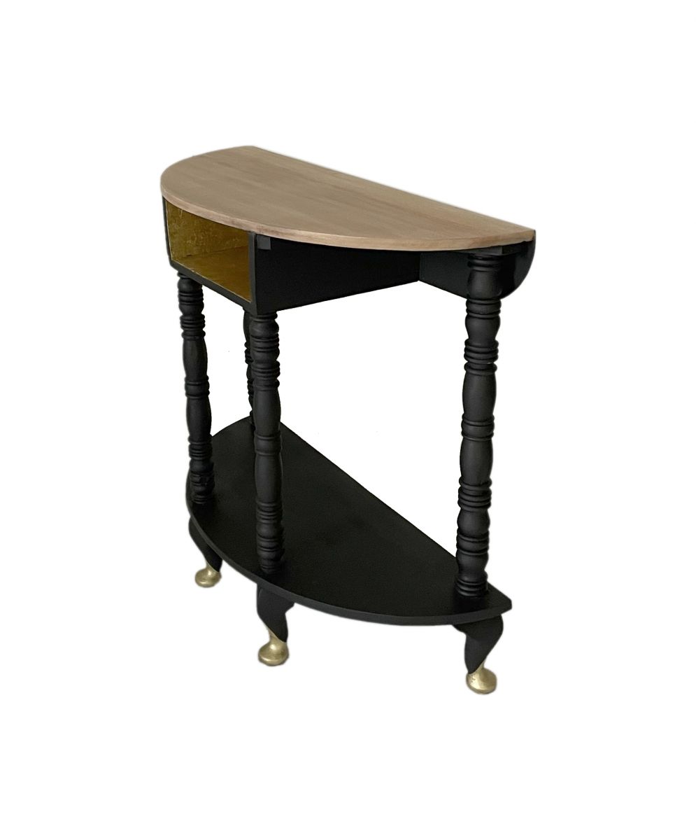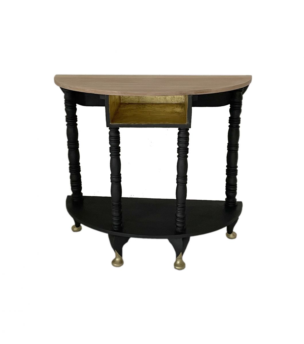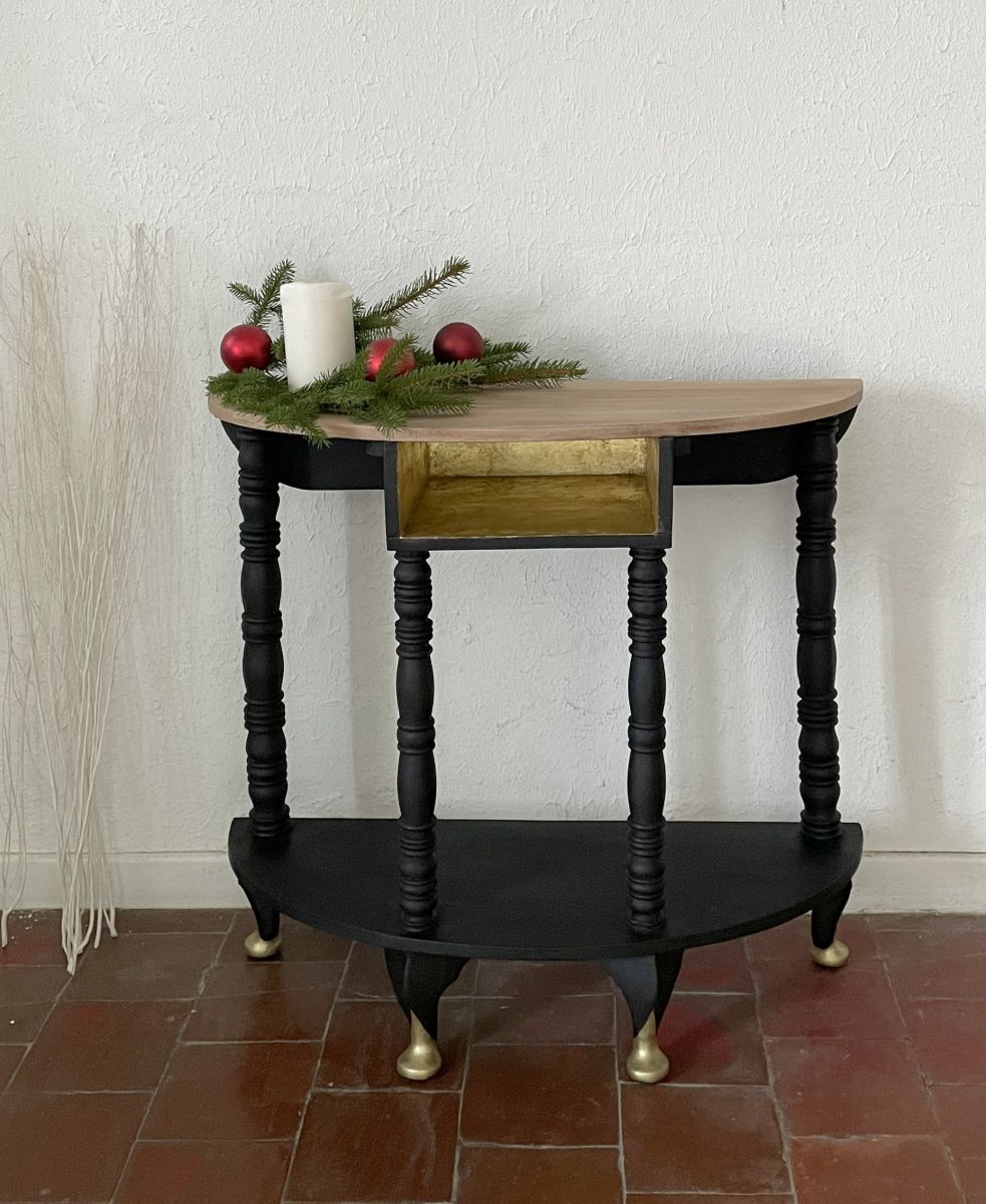 Une console en bois massif. Rafraîchie avec de la peinture à la craie Athenian Black et cires noires et dorées.
