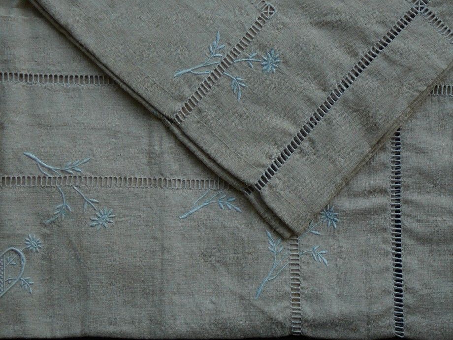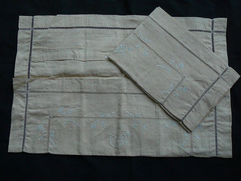 vends une paire de taies d'oreillers début XX ème siècle lin coton couleur coquille d'oeufs avec monogramme CD jamais servi ni lavé de 75 x 78 cm provenance tissage de la ville d'armentières 59 cité de la toile des années 30 avec 2 rangs de broderie jour, fleurs brodées et monogramme brodé CD de 6 x 6 cm fermeture par boutons poids des 2 taies 0 kg 800 voir les 6 photos