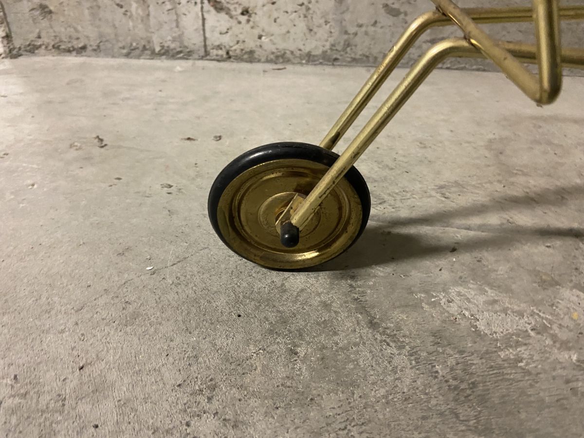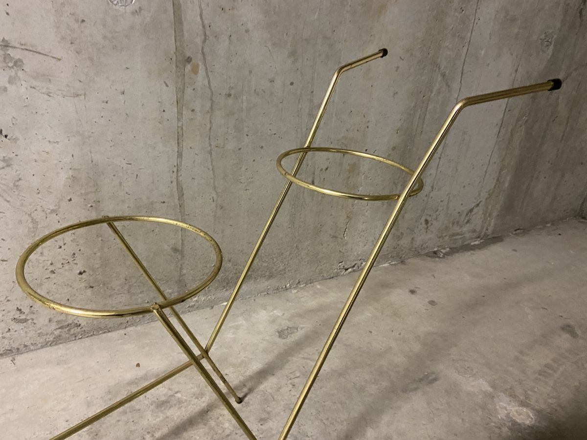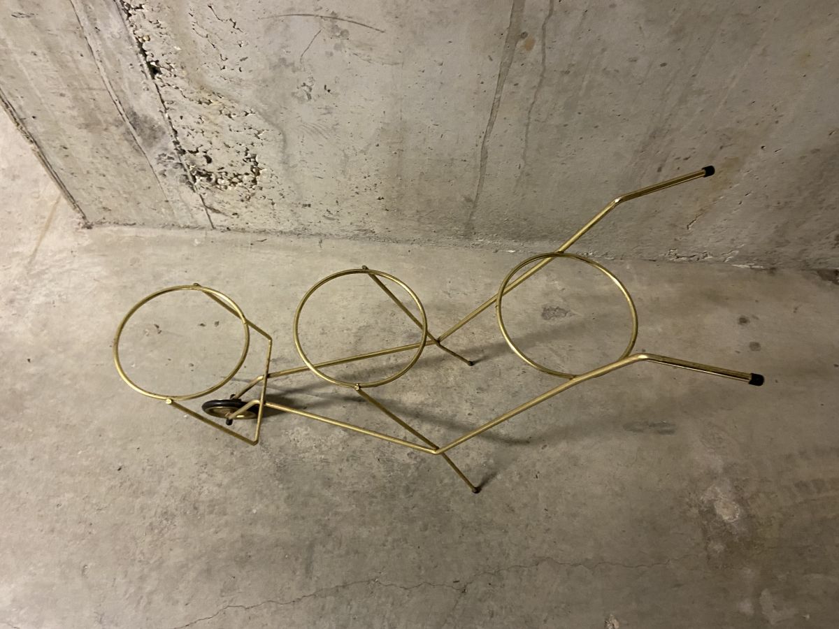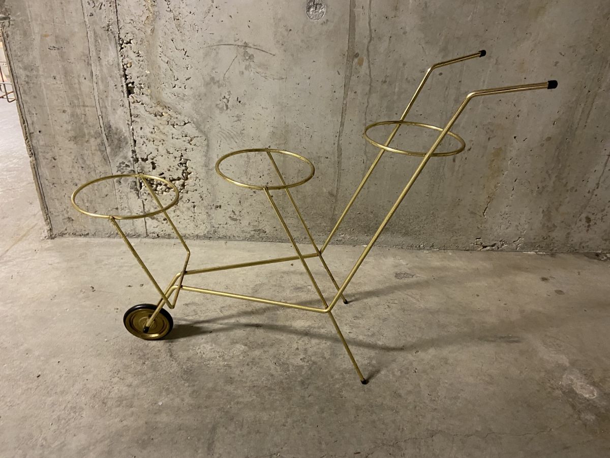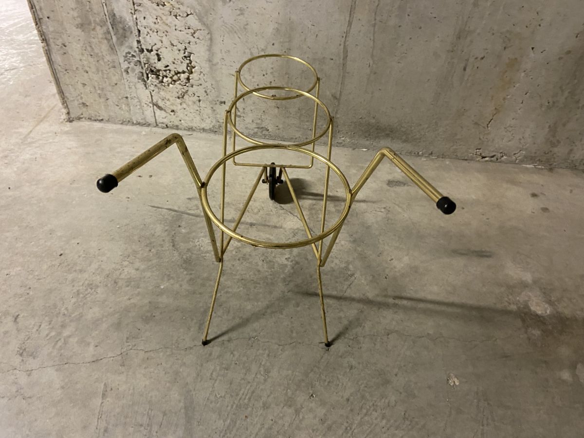 Porte-plantes des années 50 en métal tubulaire doré, design type brouette avec une roue à l’avant, 3 emplacements pour pots de 16cm de diamètre, quelques traces d’usage normal, dimensions (cm) : L.74xH.58xP.25, bon état.