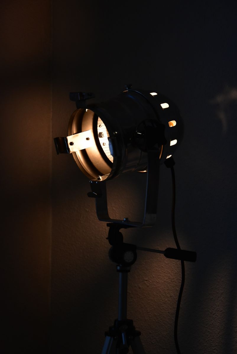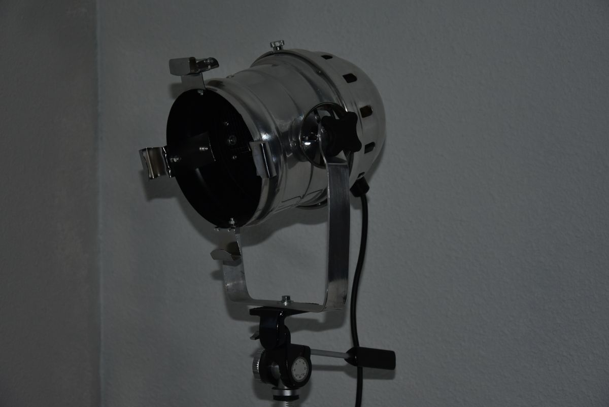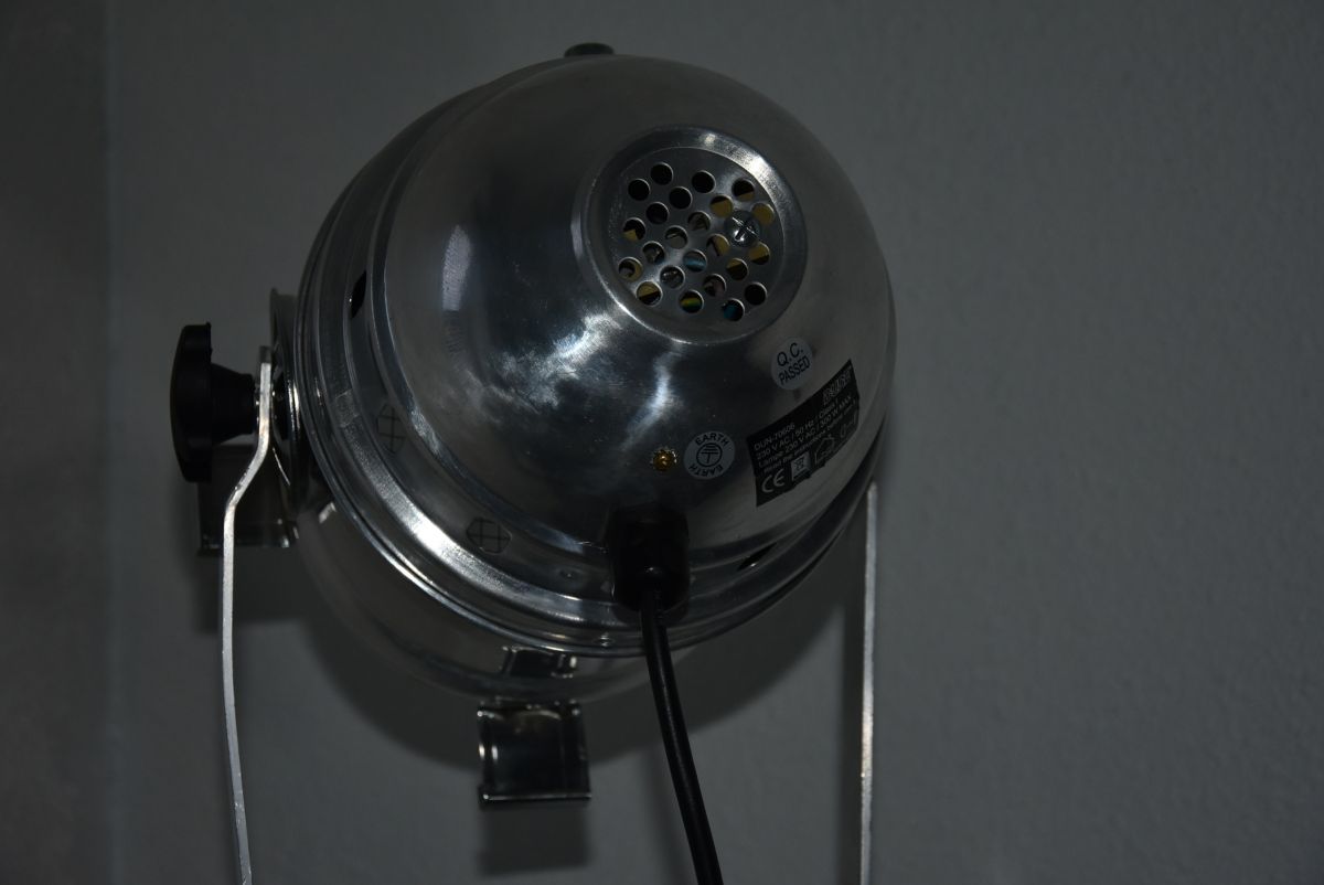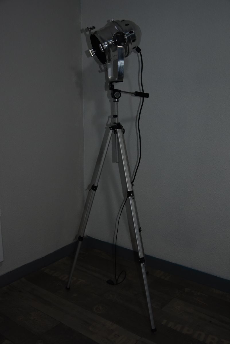 Joli projecteur de scène transformé en lampe de salon ou de chevet, réalisée à partir d'un "par56" chromé en bel état malgré ses nombreuses années de bons et loyaux services doté d'une douille E27 et d'une ampoule led , surmonte un trépied photographe authentique tout métal en très bon état, cela crée une jolie lampe de caractère