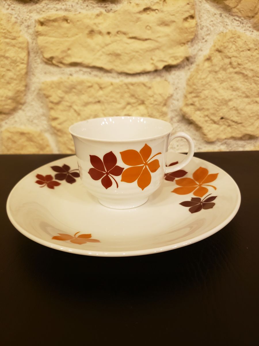 Beau service de café / / petit déjeuner de Seltmann Weiden Bavaria des années 70 en porcelaine blanche avec une feuille de châtaigniers marron orange .