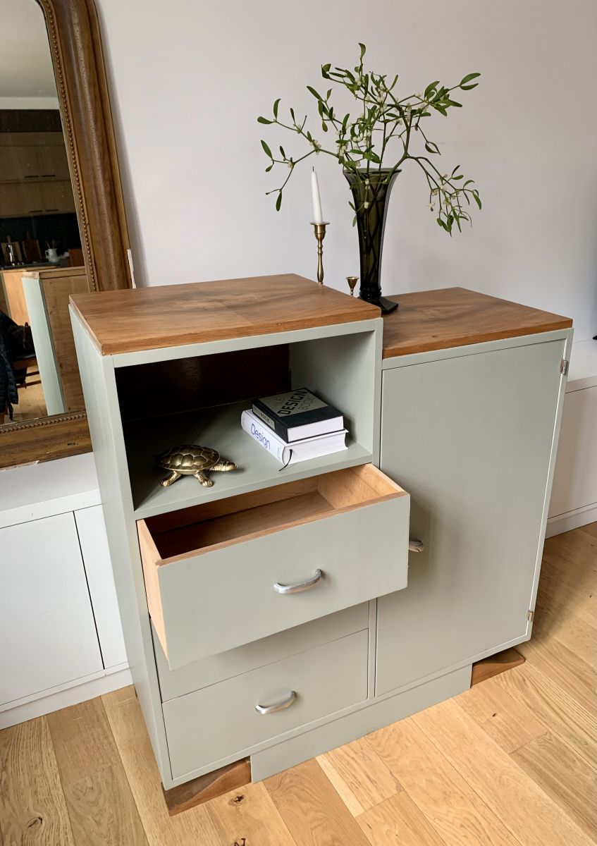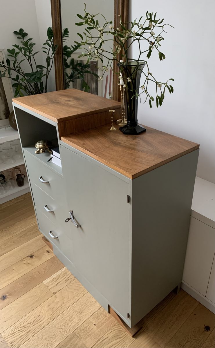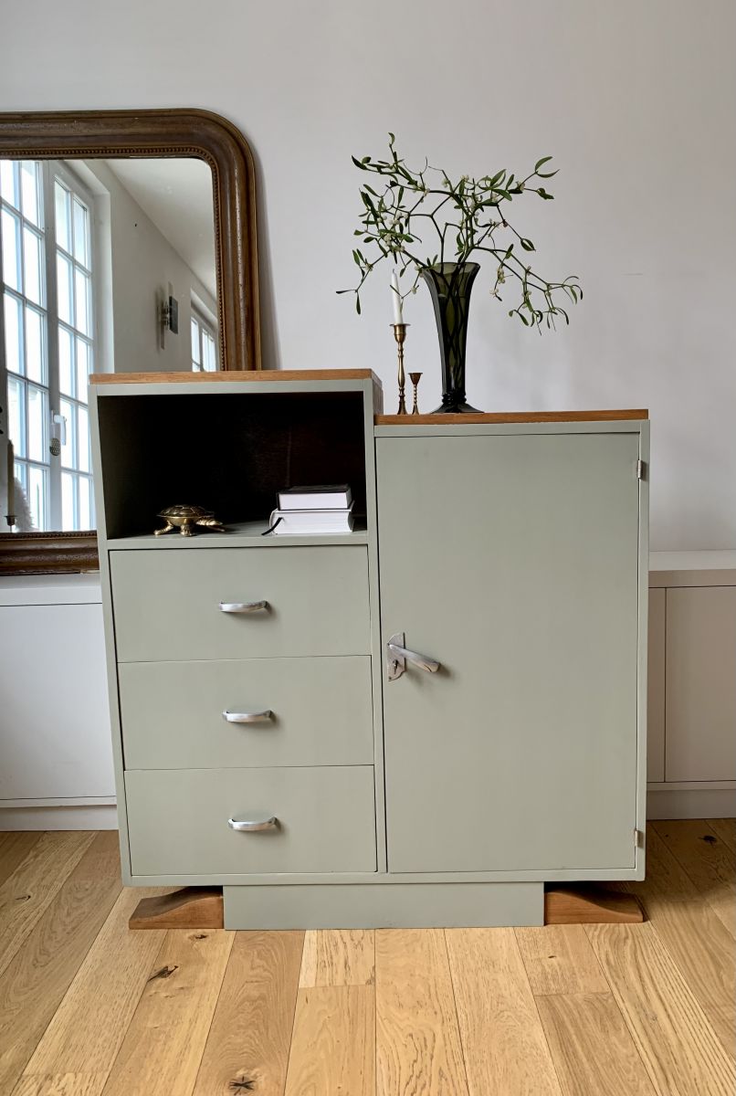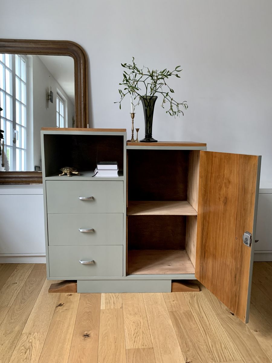 Elégante commode/buffet asymétrique en bois massif des années 30 avec de jolis pieds moustache.