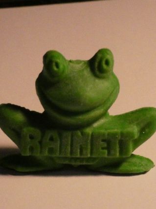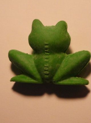 Gomme grenouille publicitaire de marque Rainett Paris (prêt à porter enfant annnées 60) avec sur le dos mode enfant en relief bon état de conservation dimensions 4.5x6cm prix 12 euros disponible 25
