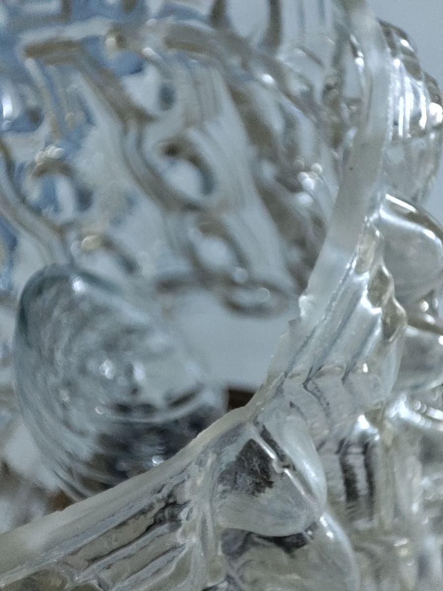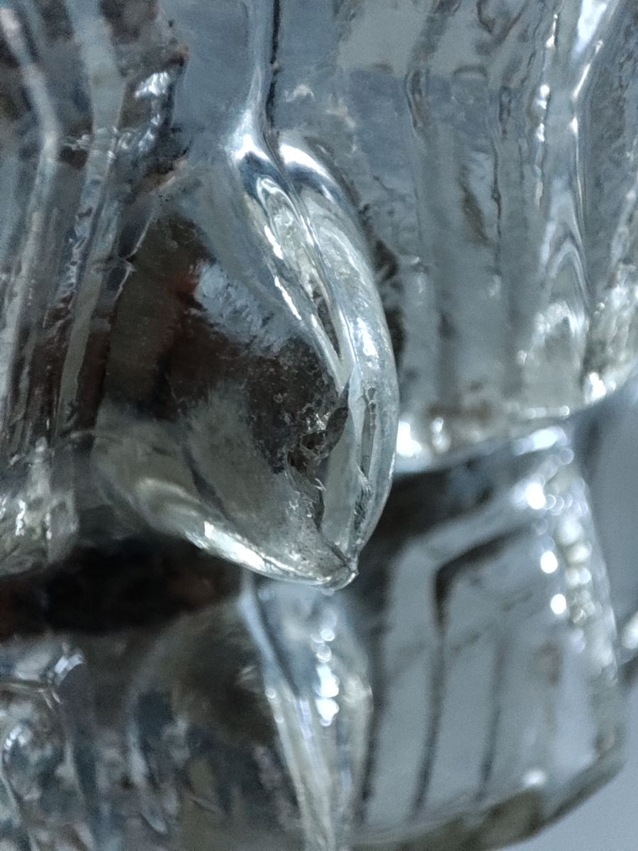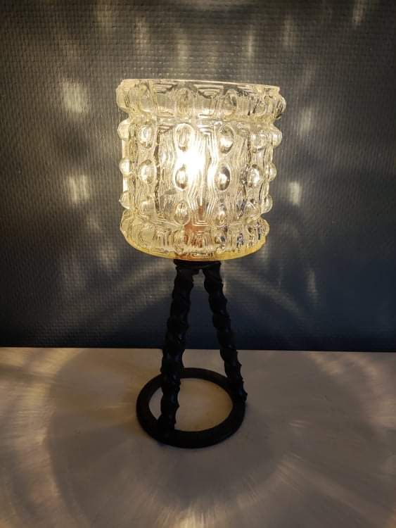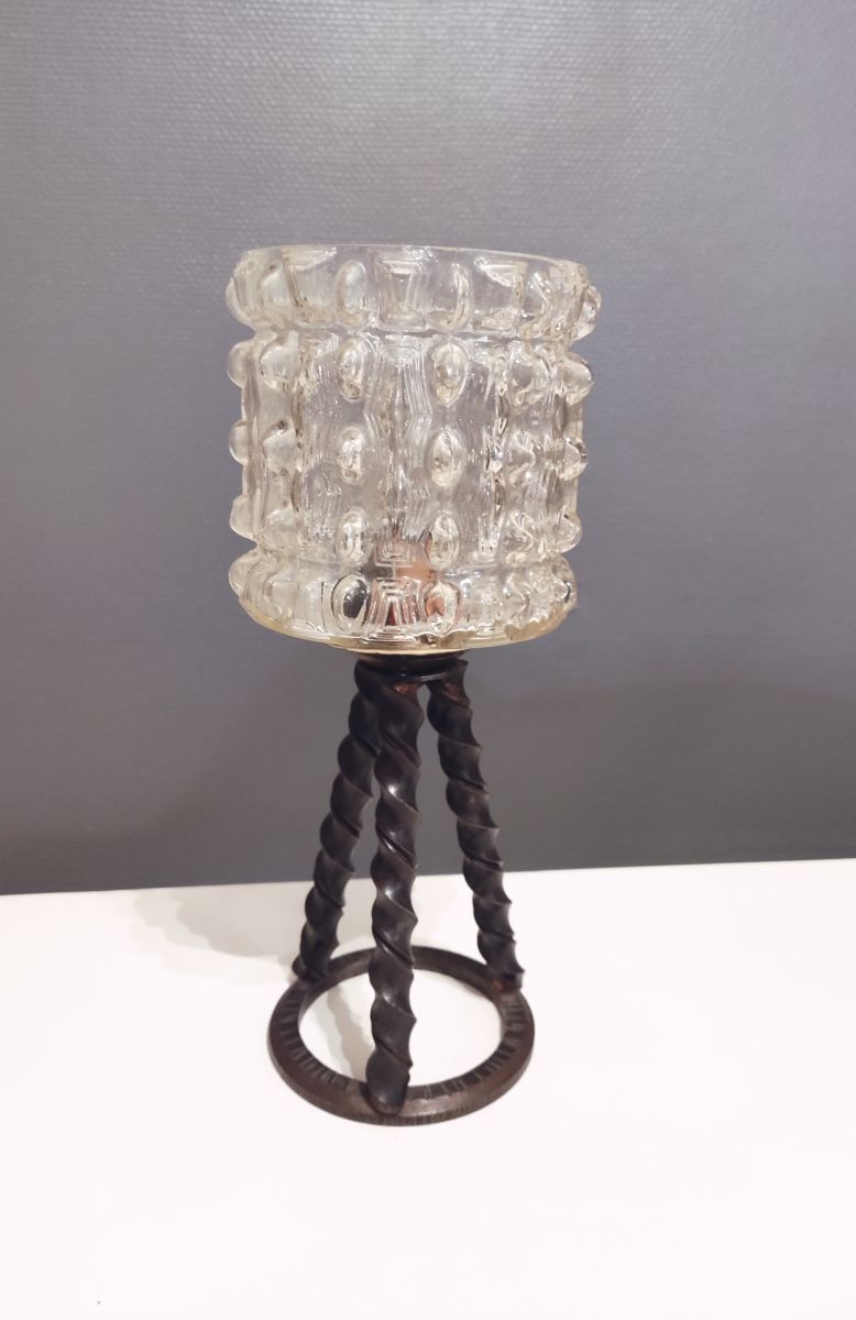lampe vintage avec pied torsadé en acier et globe en verre ciselé transparent
