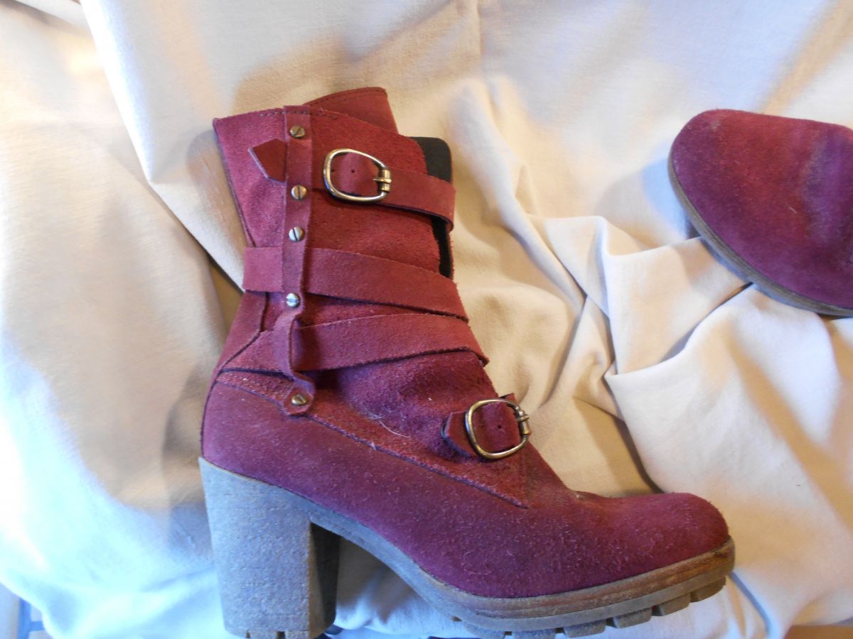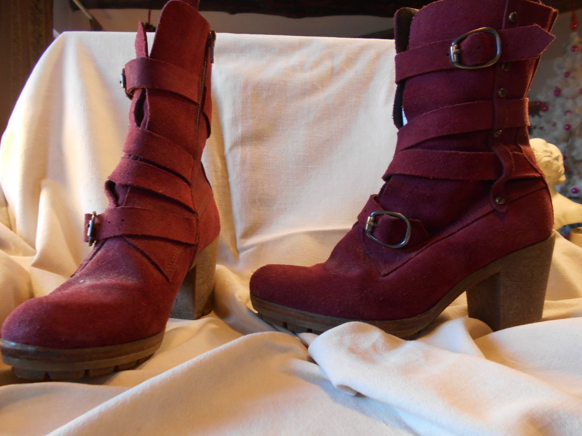 TRES BELLES BOTTINES DE LA MARQUE CONBARO COLOR DE STYLE ARCHE TRES TRES SOUPLE EN DAIM DE COULEUR PRUNE FONCE T 37-38 porte 1 FOIS S OUVRE PAR UNE GRANDE LANGUETTE DEVANT PAR FERMETURE ECLAIR TALONS DE 5 CM TRES CONFORTABLES HAUTEUR A PARTIR DU TALON 17 CM