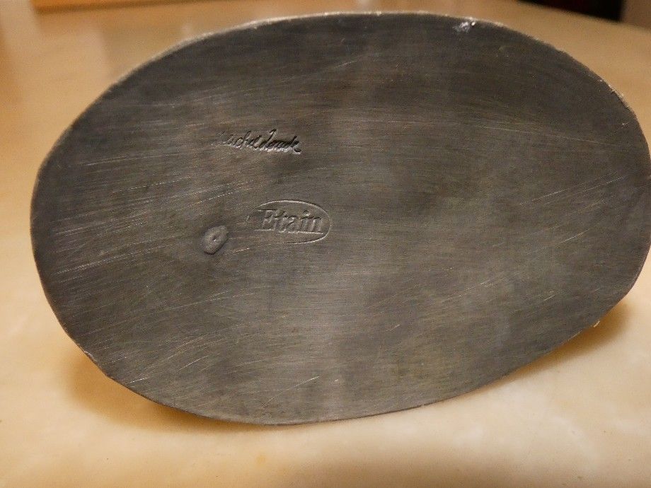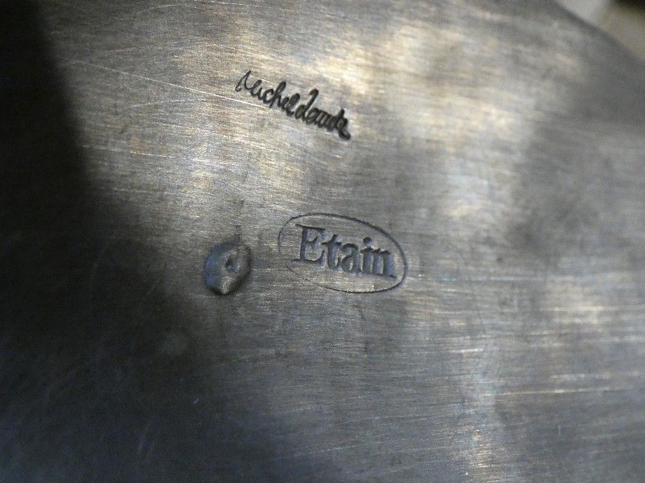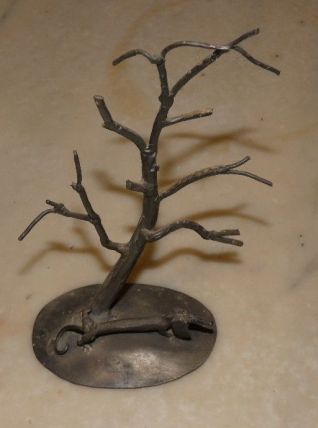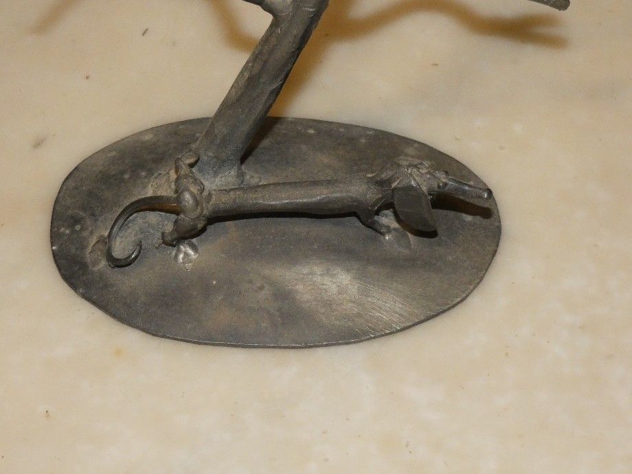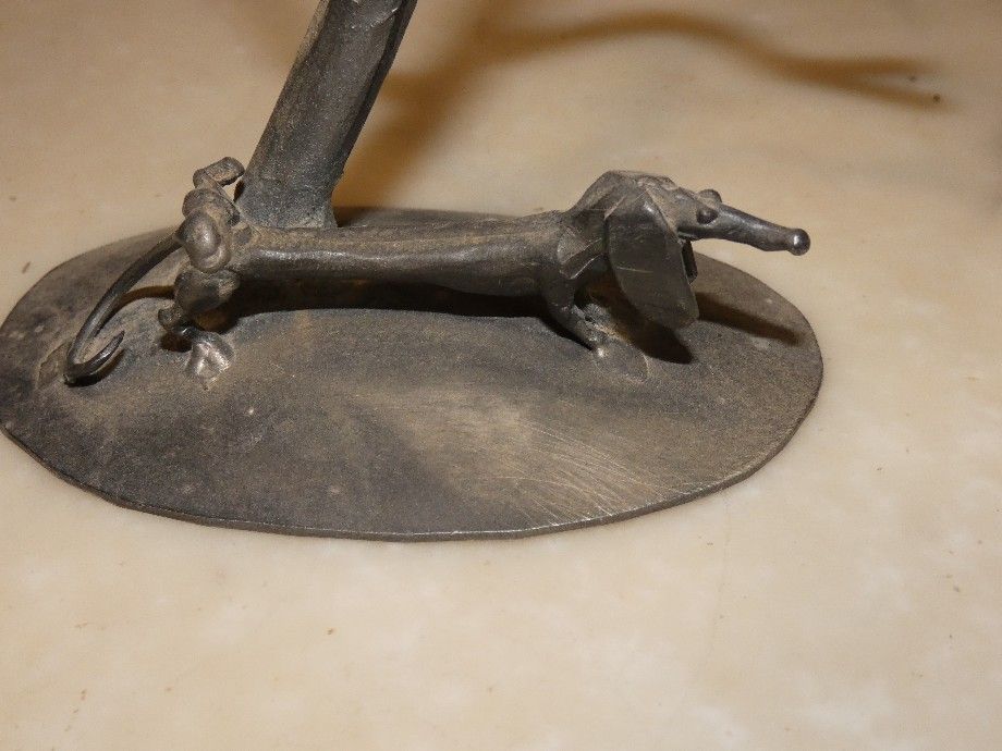 sculture en étain arbre et chien de michel laude représentant un teckel faisant pipi au pied de l'arbre en très bon état hauteur 18 cm socle 9 cm signée michel laude sous le socle voir les photos prix 90 euros