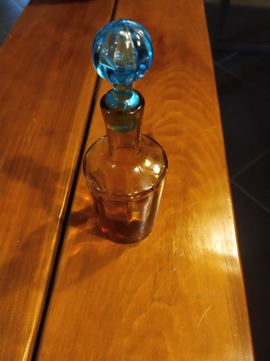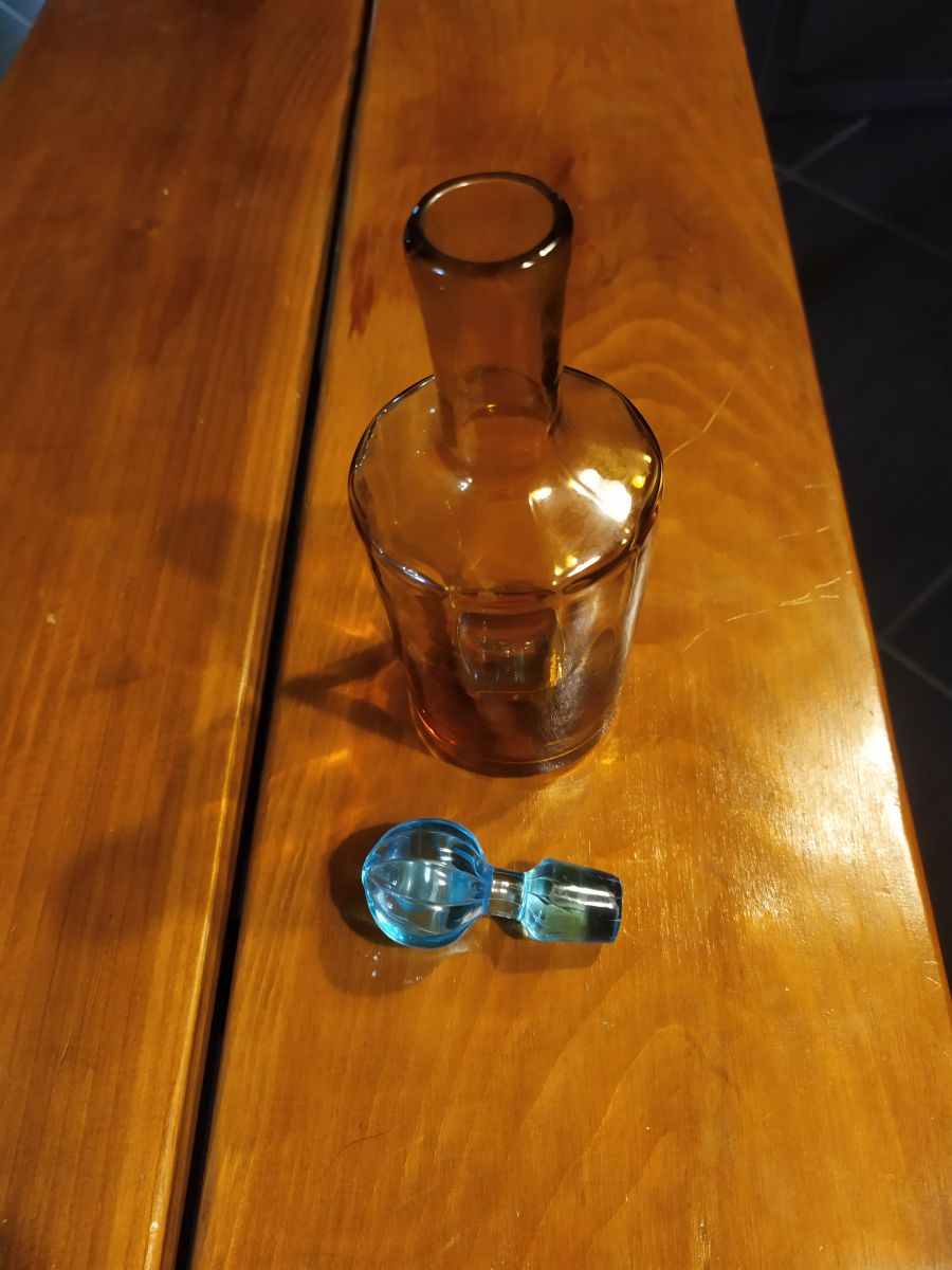 Jolie petite carafe verre ambré et son bouchon bleu.