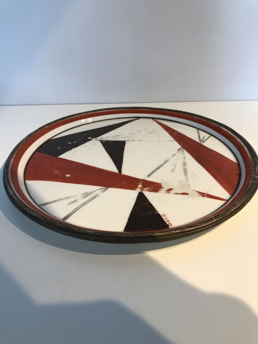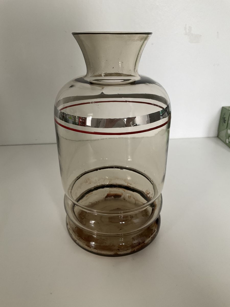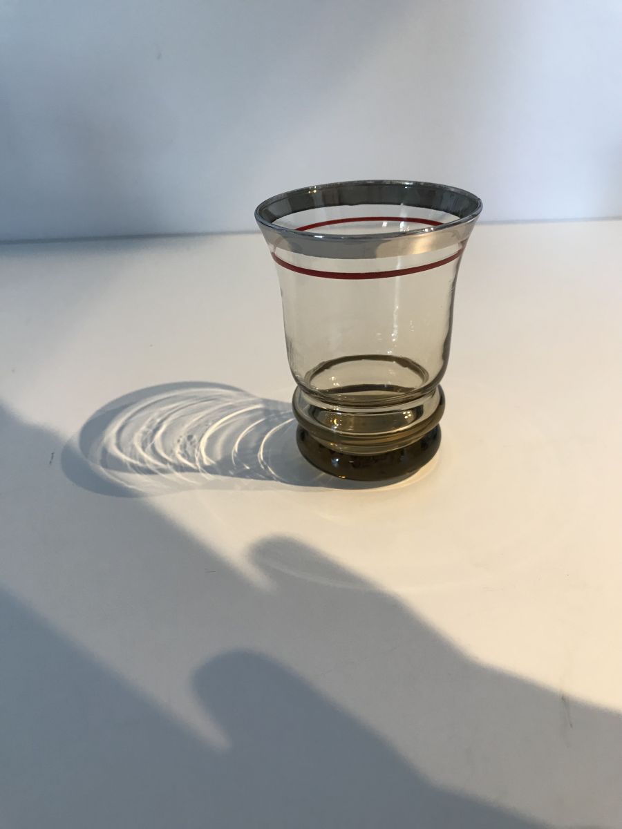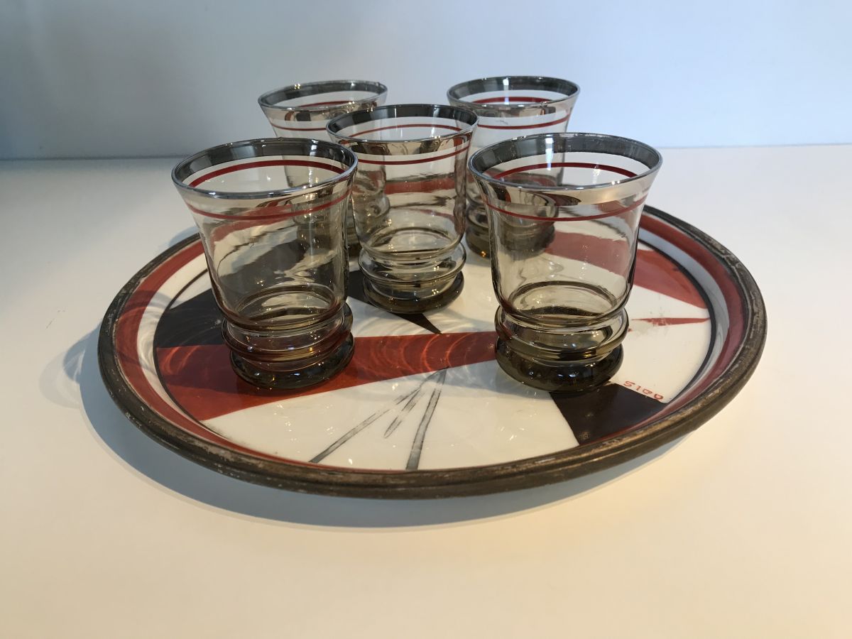 Plateau de service art deco cerclé de métal et son carafon et ses verres raffinés.