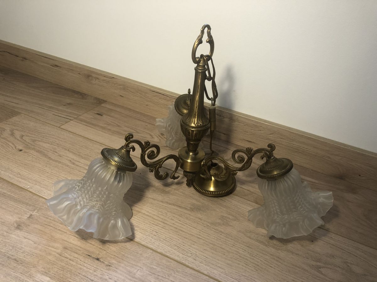 - 1 lustre hauteur 40cm, diamètre 45cm composé de trois bras lumineux avec abats jour en verre sablé