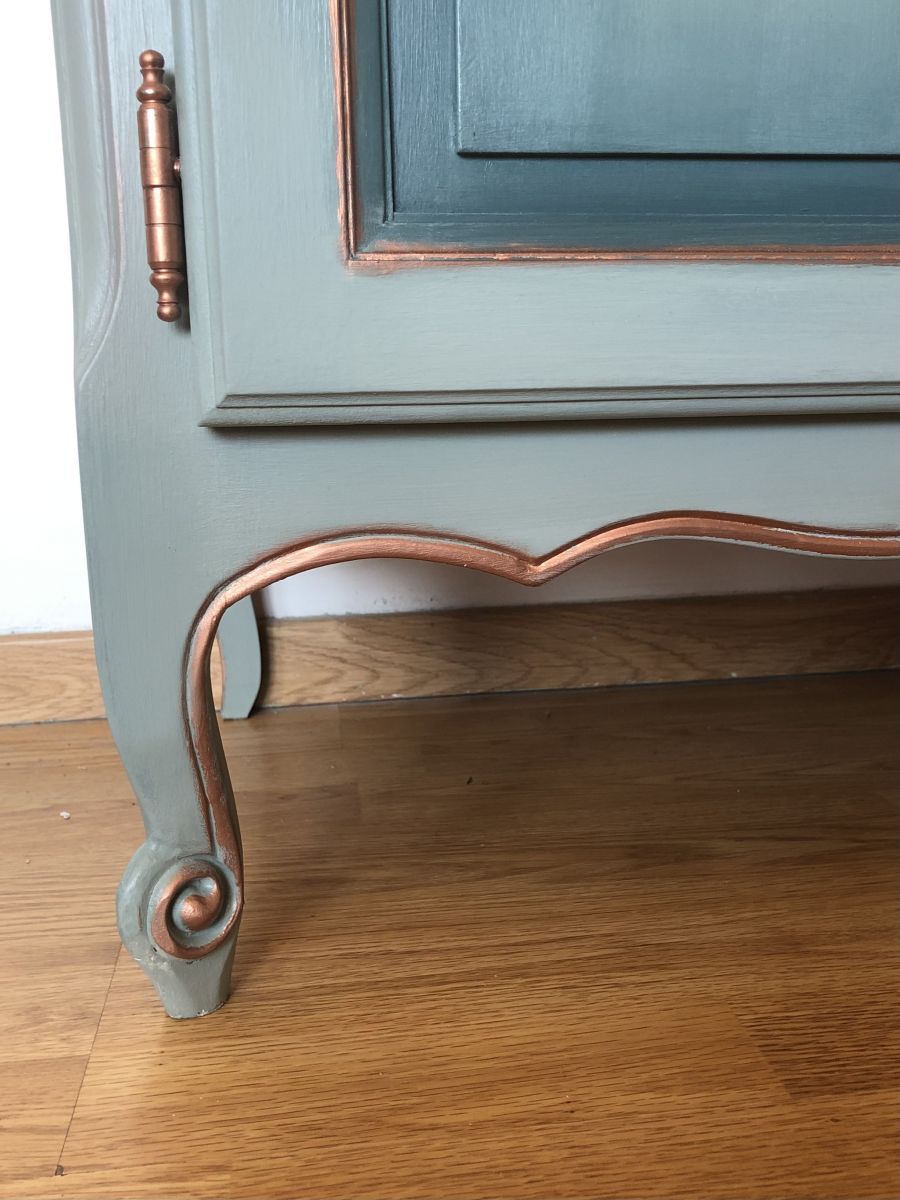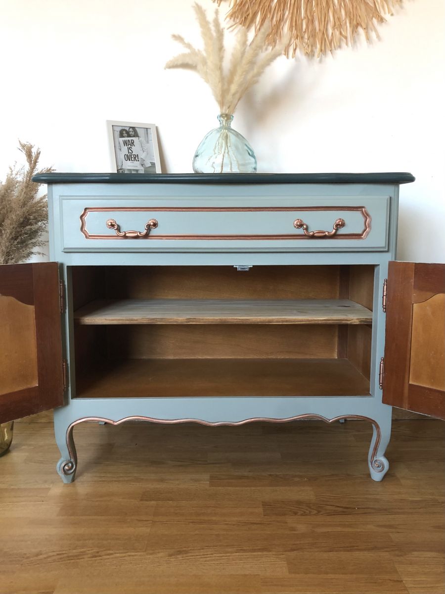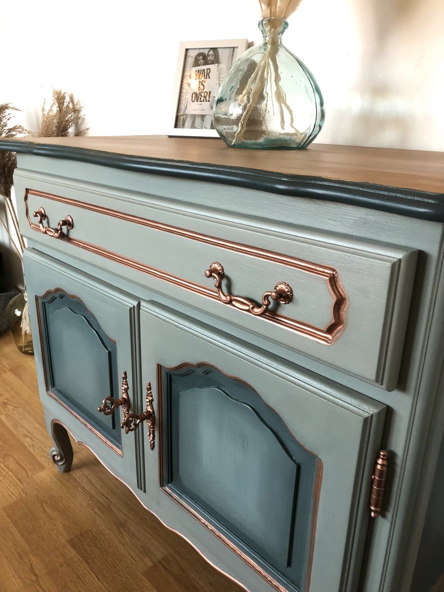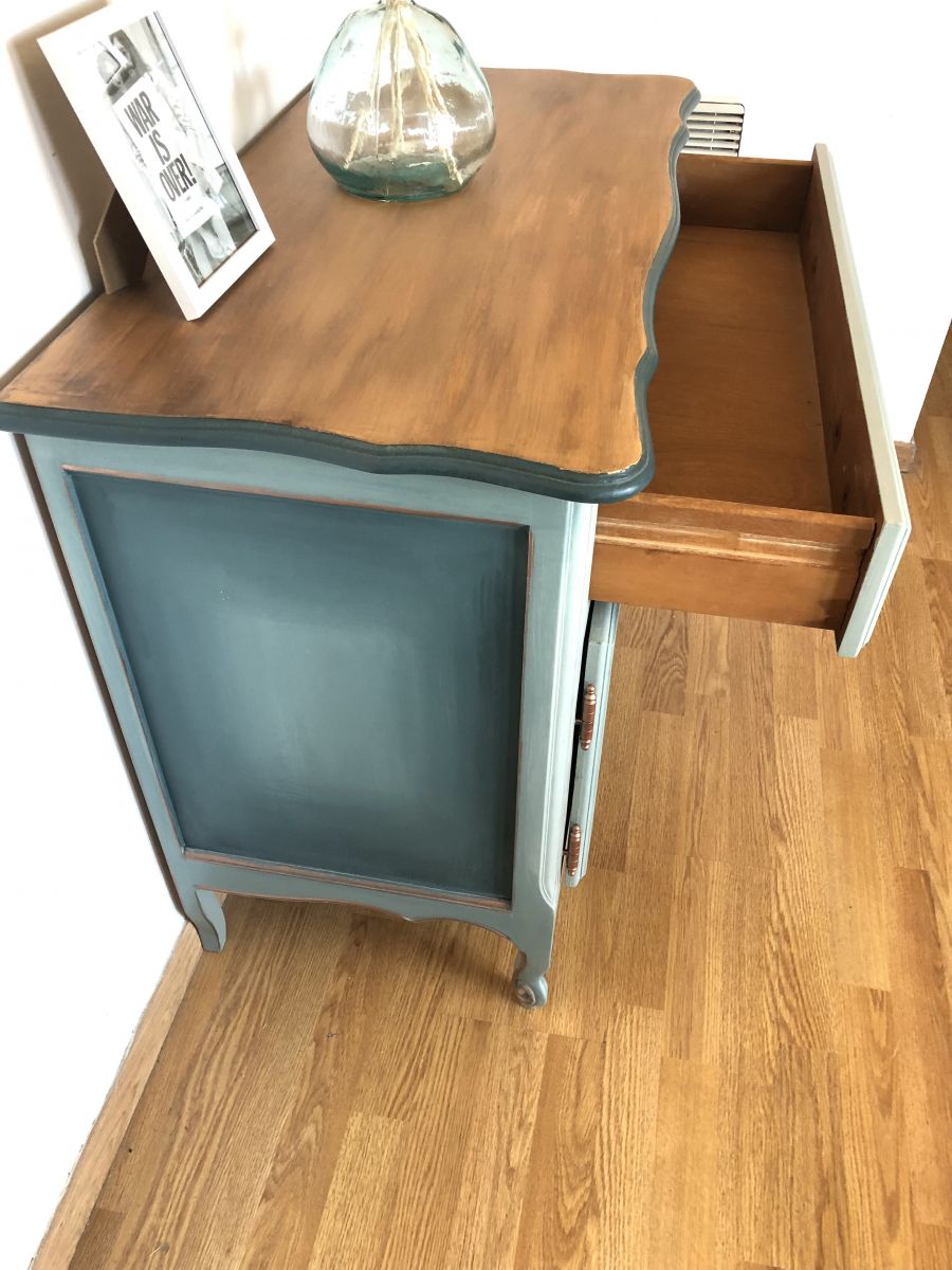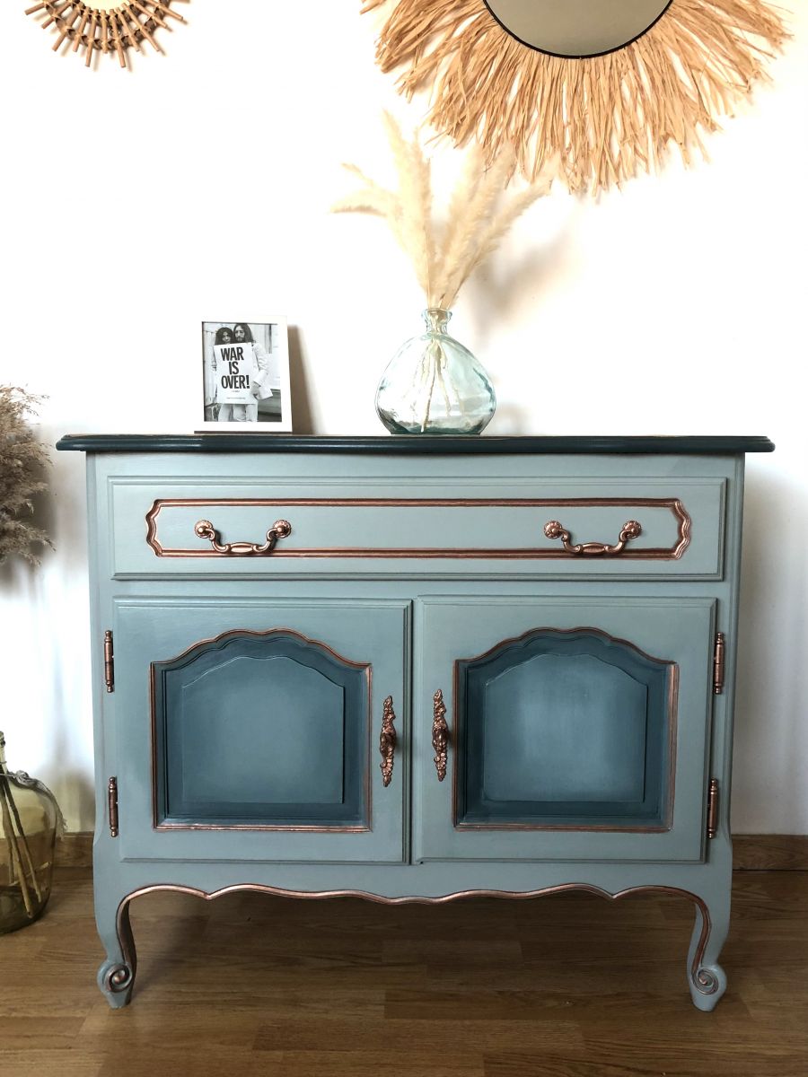 Les façades les portes et les côtés du meuble la technique de “blending” a été utilisée avec la couleur bleue sarcelle mate de chez liberon.