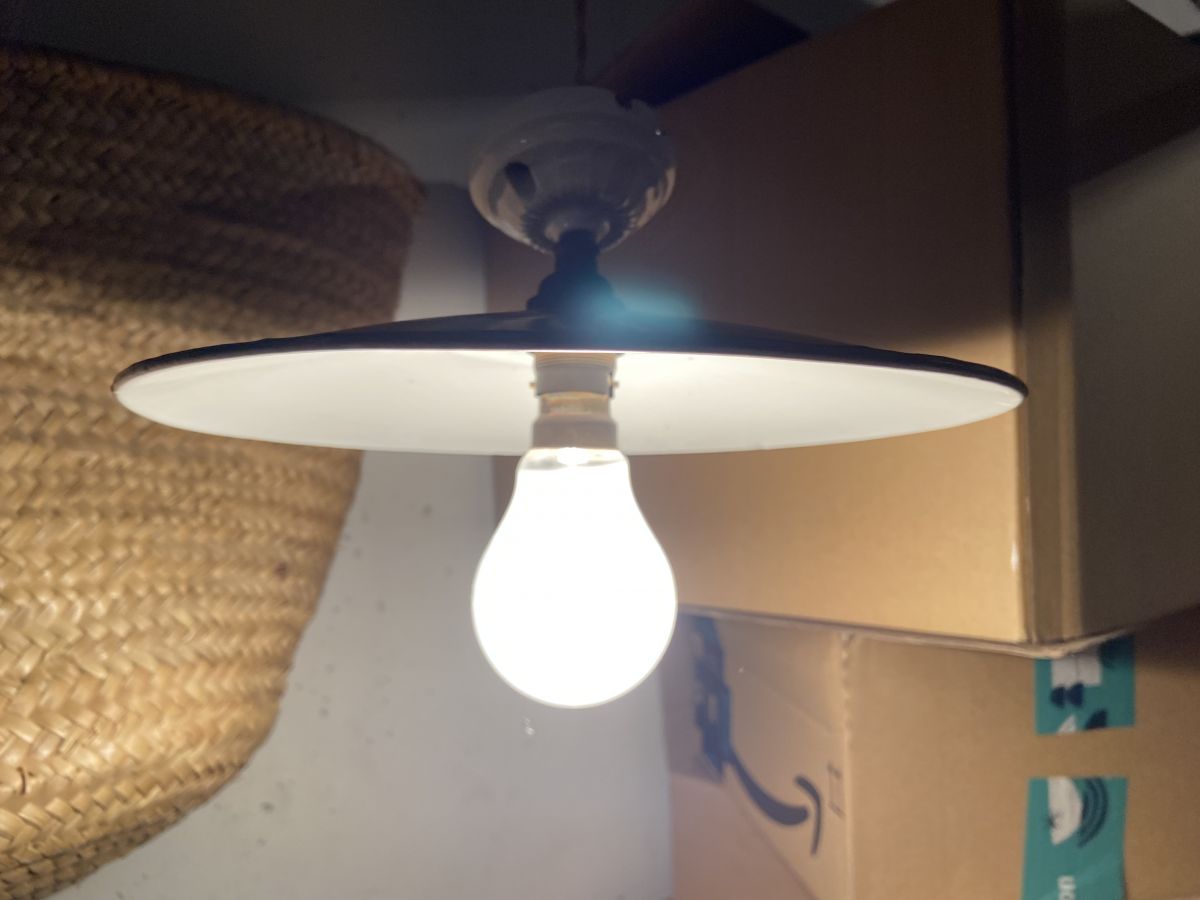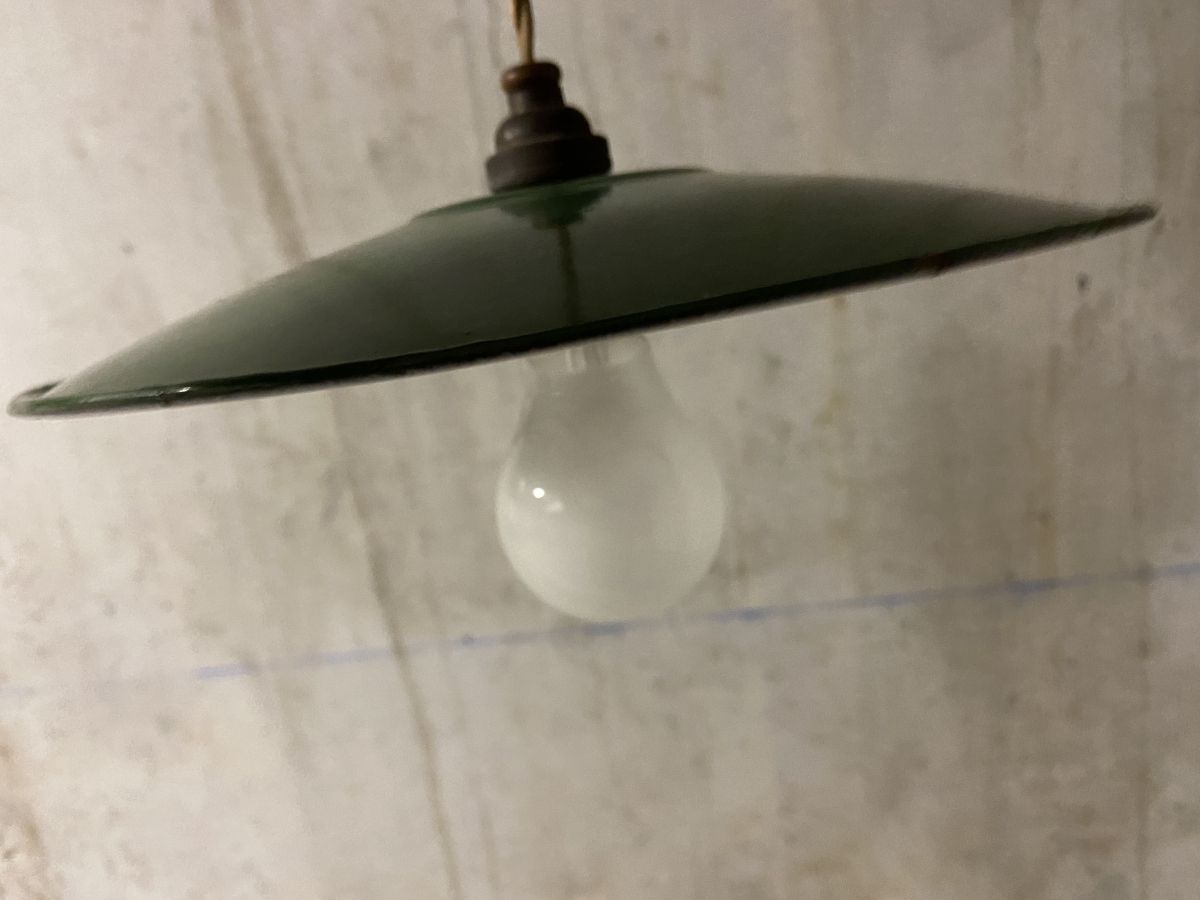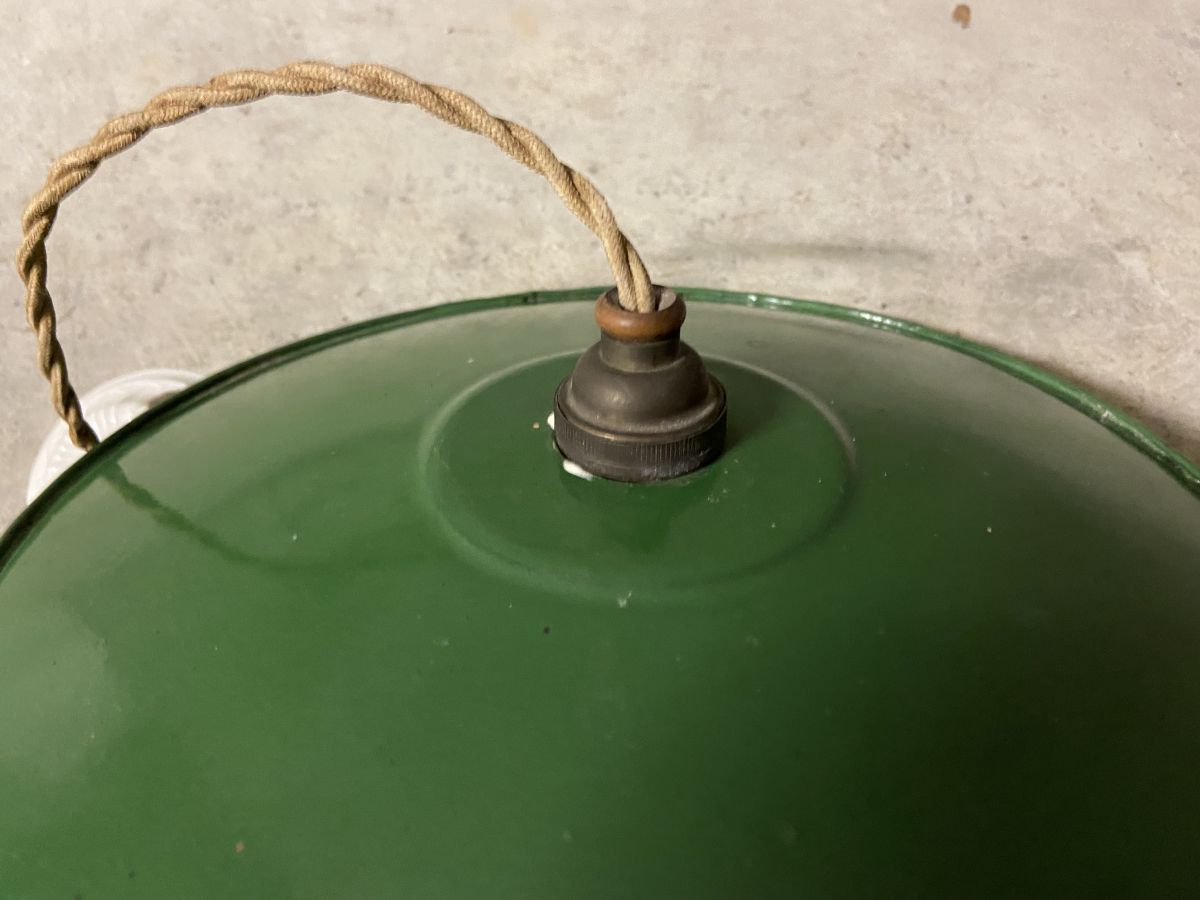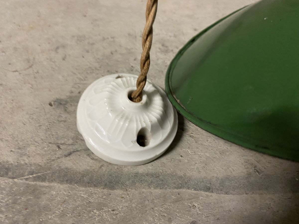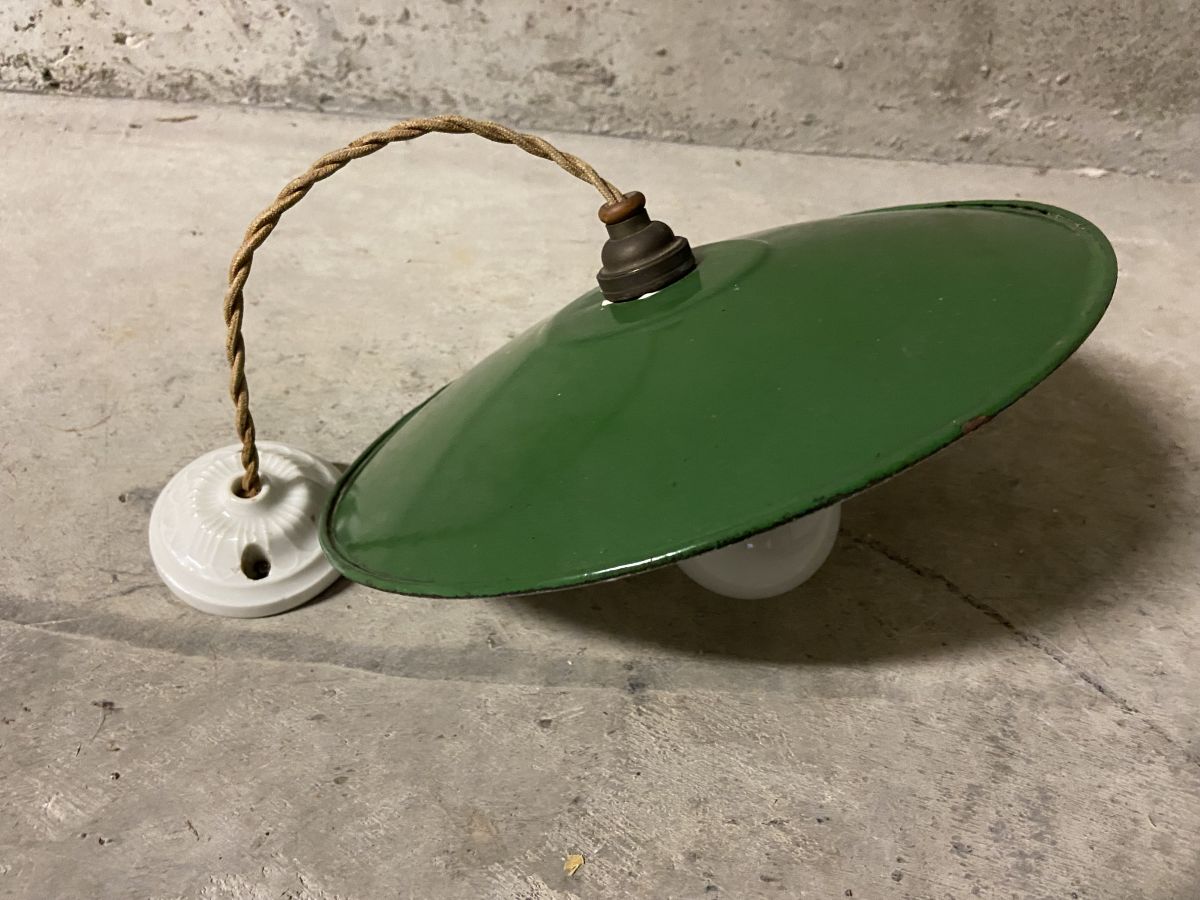 Suspension d’usine gamelle en tôle émaillée verte, quelques petites traces du temps sur l’émail participant au charme et au vécu de la lampe, fonctionne parfaitement, douille en laiton, fil électrique gainé de tissu d’origine, plafonnier en porcelaine, diamètre 24cm, hauteur 5cm, bon état.