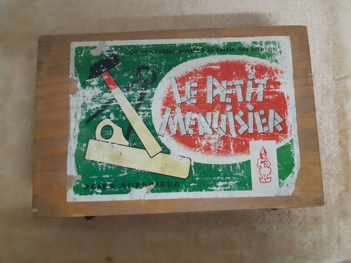 Coffret bois des années 1960 en bon état, il ne manque que la lame de la scie.