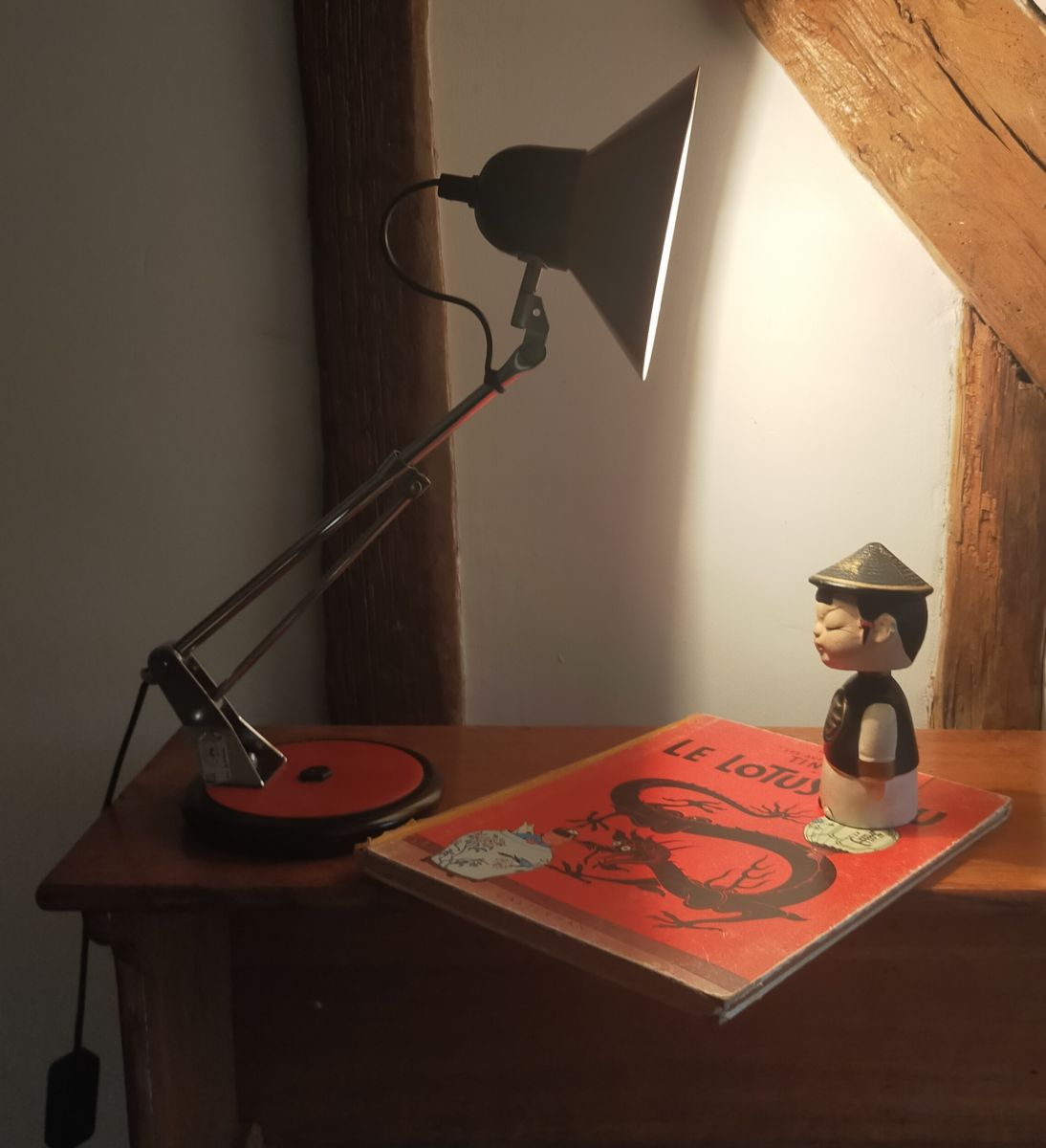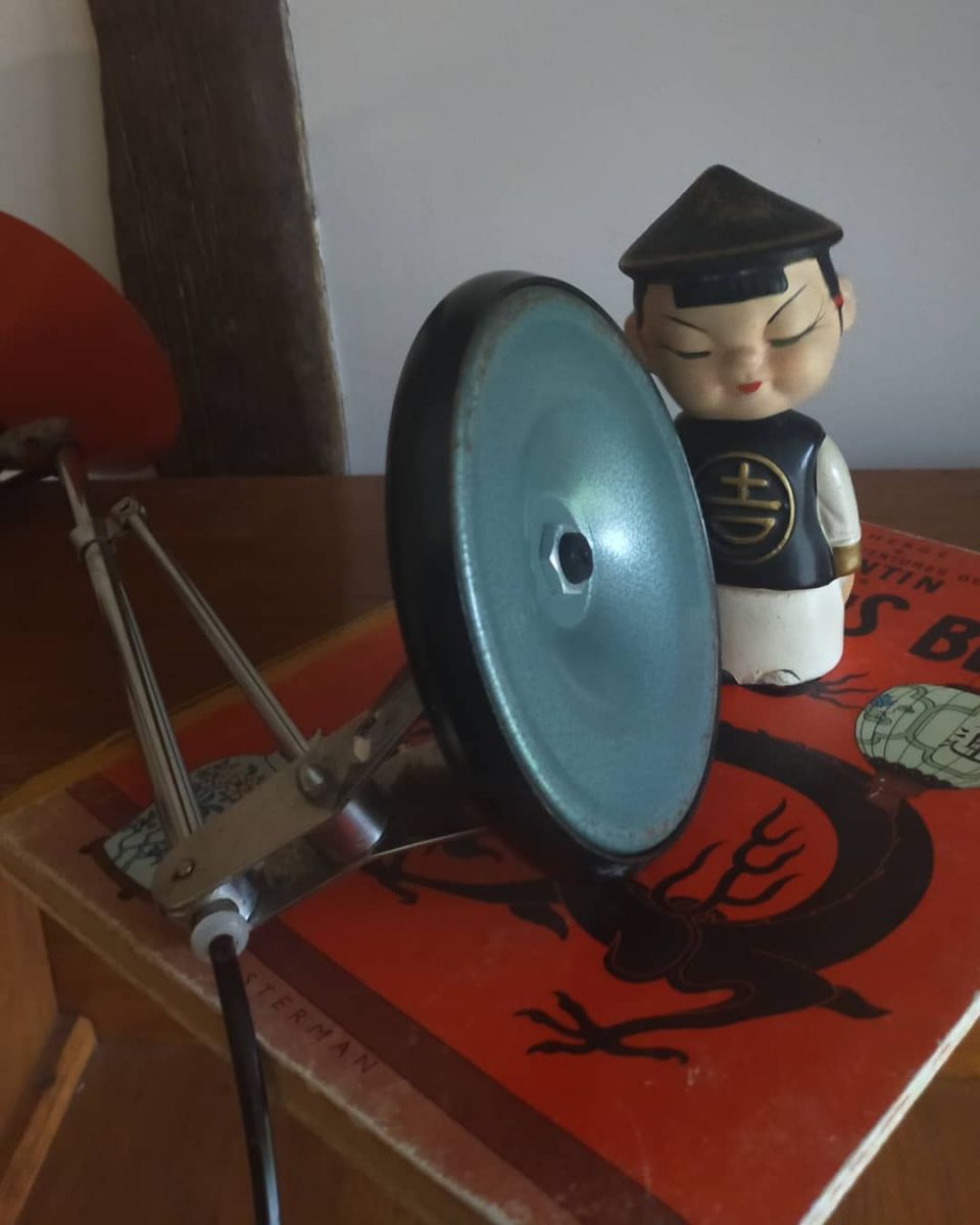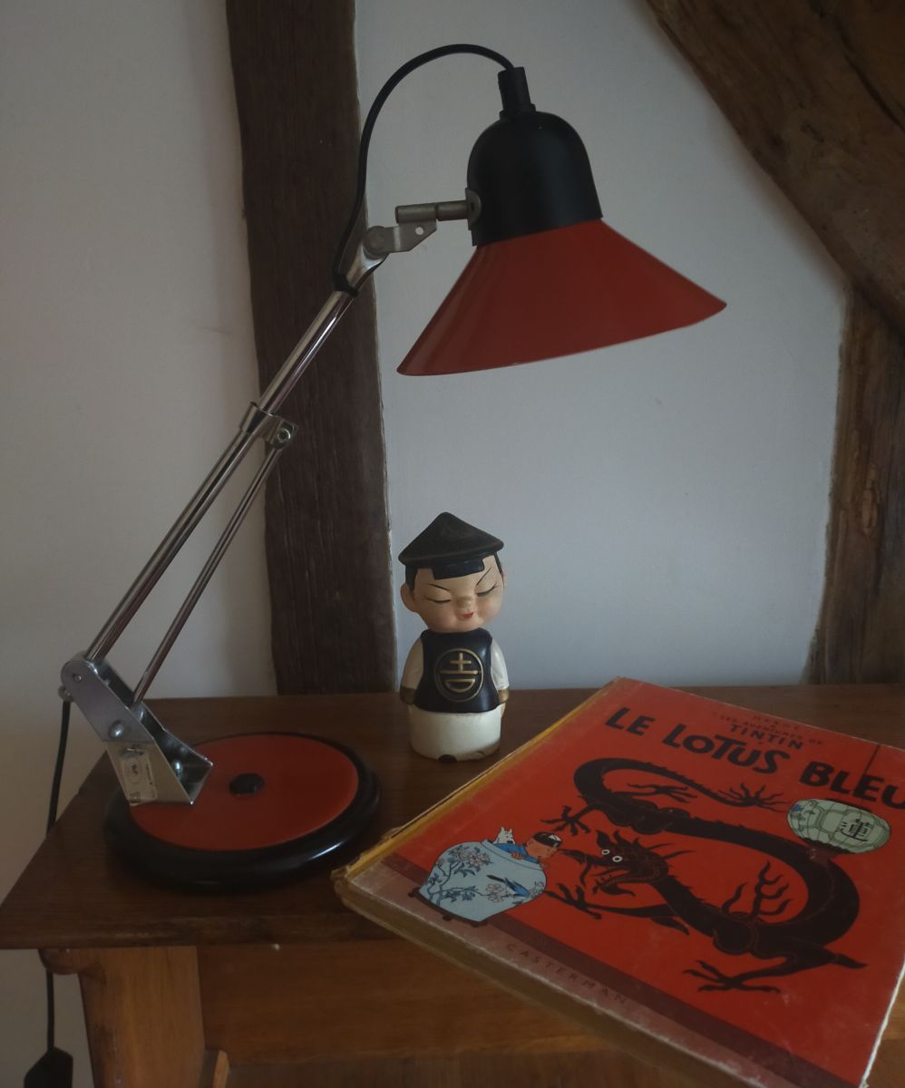 Lampe création Aluminor ( France) au design moderniste et dynamique des années 60/70. L'abat jour collerette et sa base sont en métal laqué d'un beau rouge, et sa tige articulée en métal chromé. Petit luminaire très fonctionnel, son socle rond est lourd, elle peut donc prendre toutes les positions.
