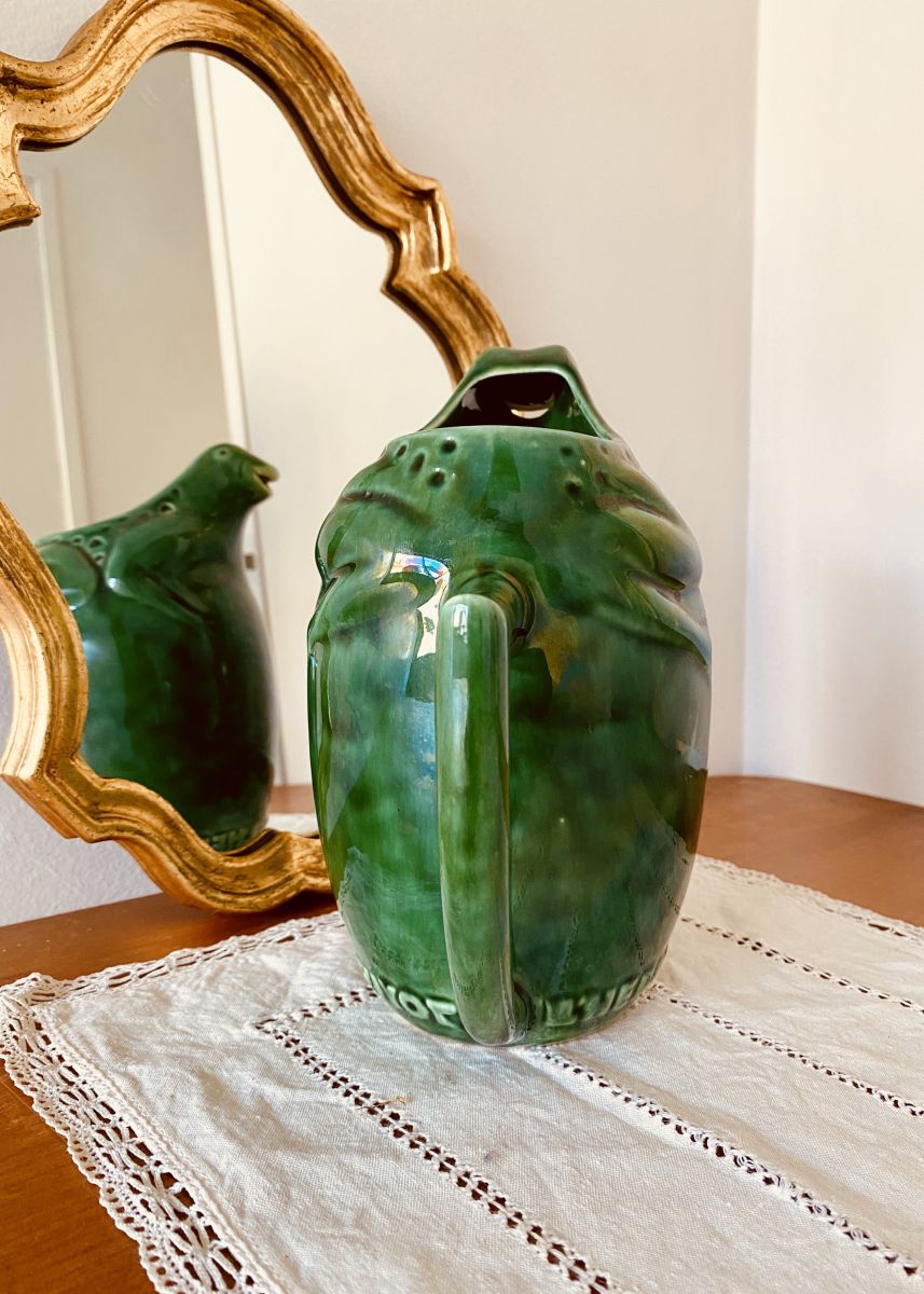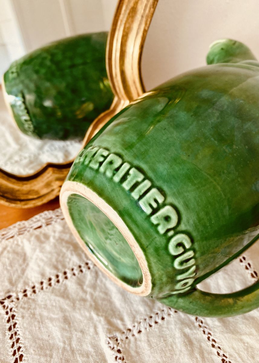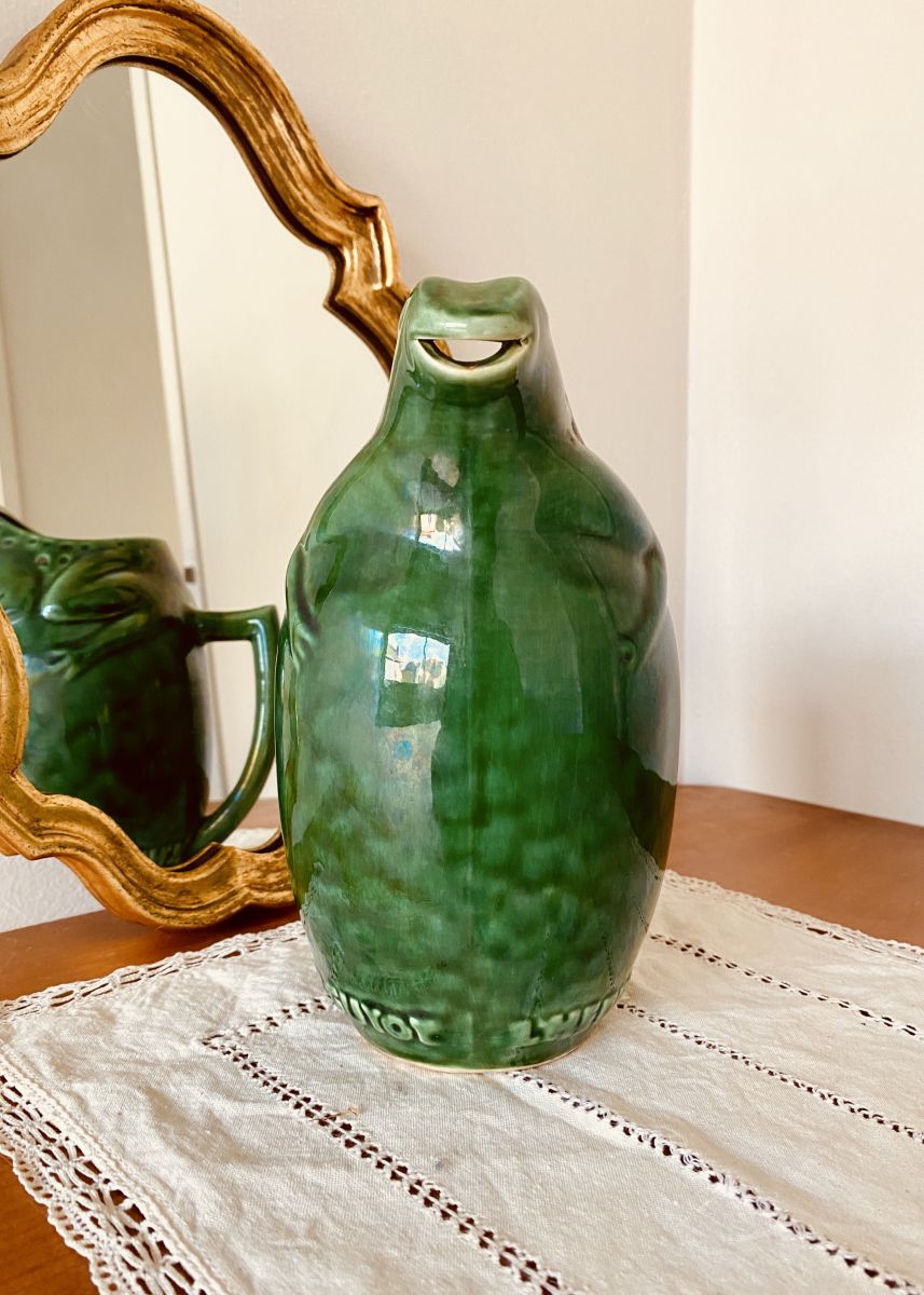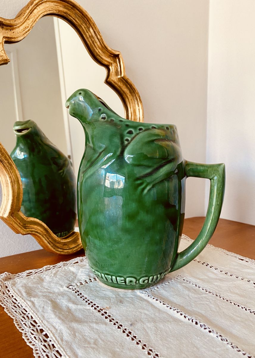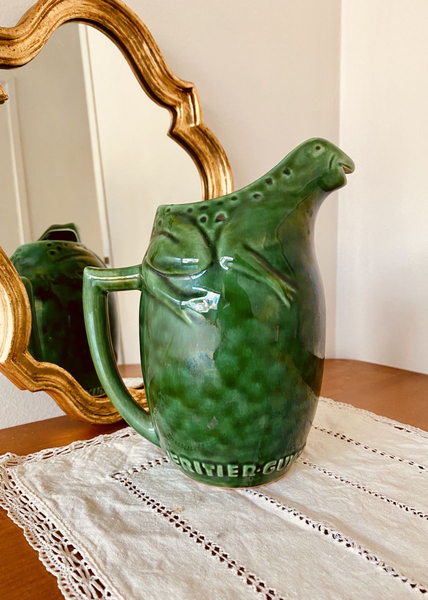 Pichet vintage en céramique, décor de grenouille, modèle publicitaire des années 50 de la marque L'HERITIER GUYOT - Dijon