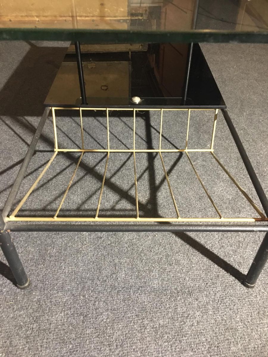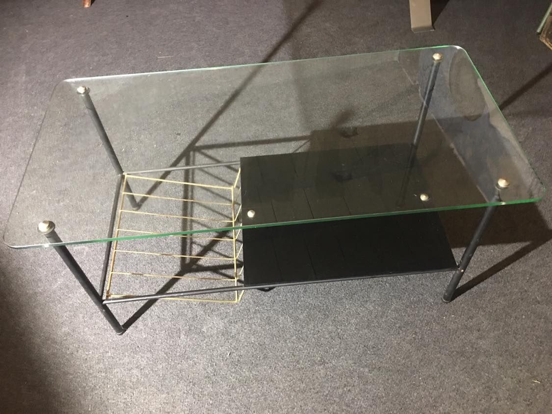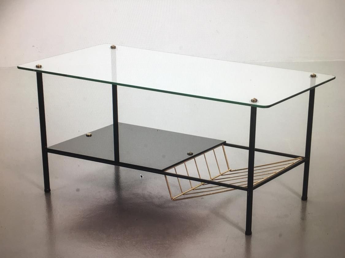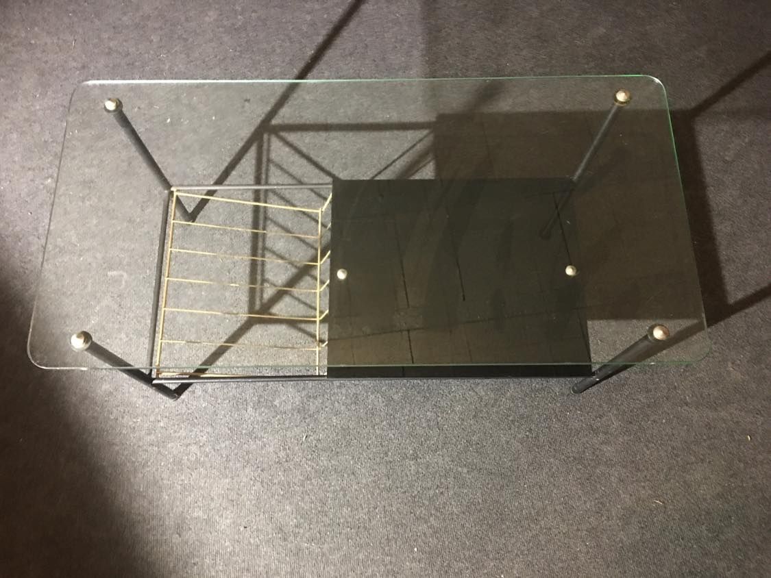 Table basse / table d'appoint élégante et minimaliste de design français du milieu du siècle. Ce petit bijou des années 50 est dessiné par Pierre Guariche pour Airborne. La table est composée d'un cadre en acier noir, d'un plateau en verre et, en dessous, d'un porte-revues. Les détails en laiton donnent à la table un aspect distingué. L'état de la table peut être considéré comme bien conservé compte tenu de sa vie antérieure avec une certaine usure correspondant à son âge et à son utilisation.