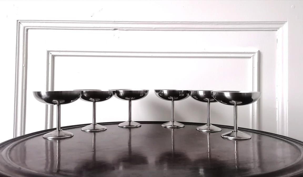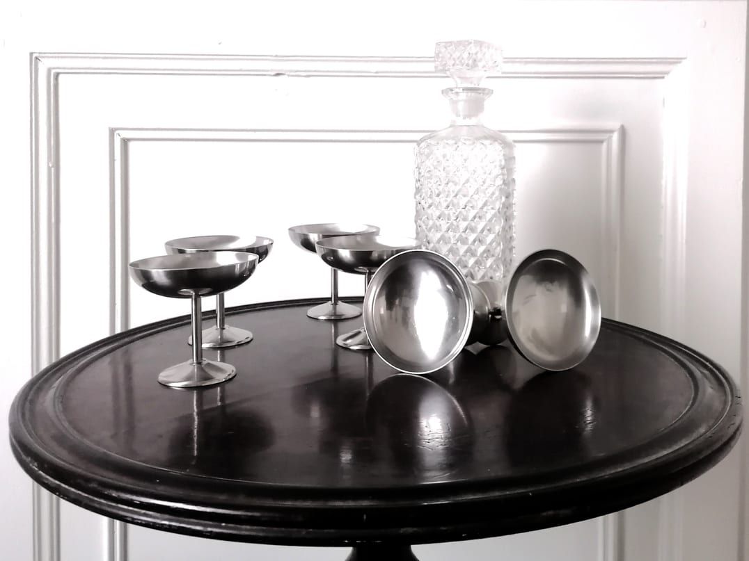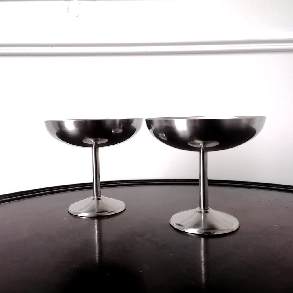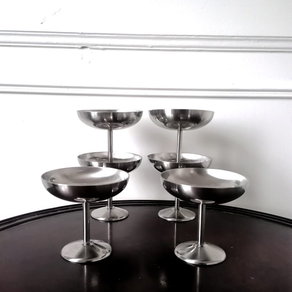 Ensemble de six coupes à glace en inox 18/6. La jambe fine et le rond parfait de la coupe leur donne une élégance particulière.