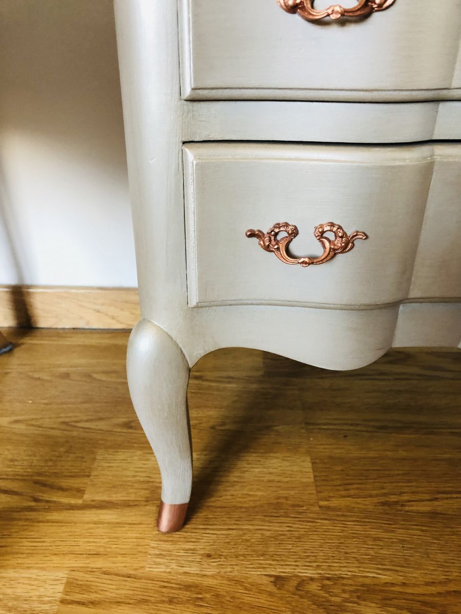 Les poignées sont cirées couleur dorée cuivre. Les bouts avant des pieds sont également dorés à la cire cuivre.
