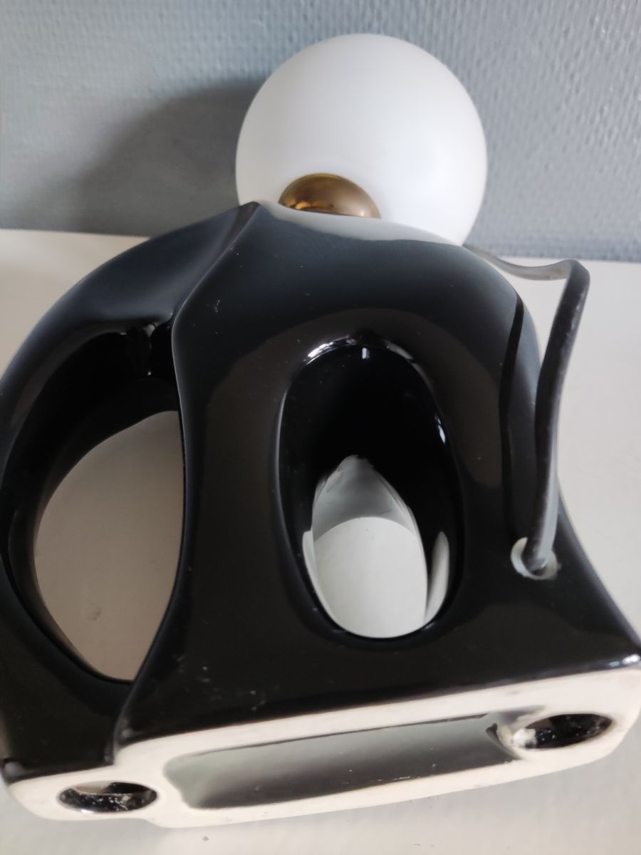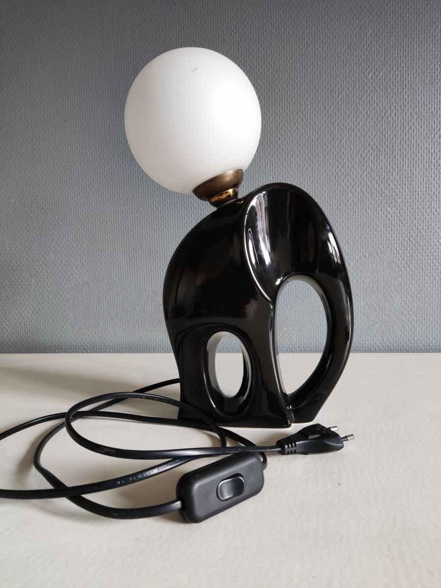 lampe éléphant en céramique noire et globe opaline blanc des années 80