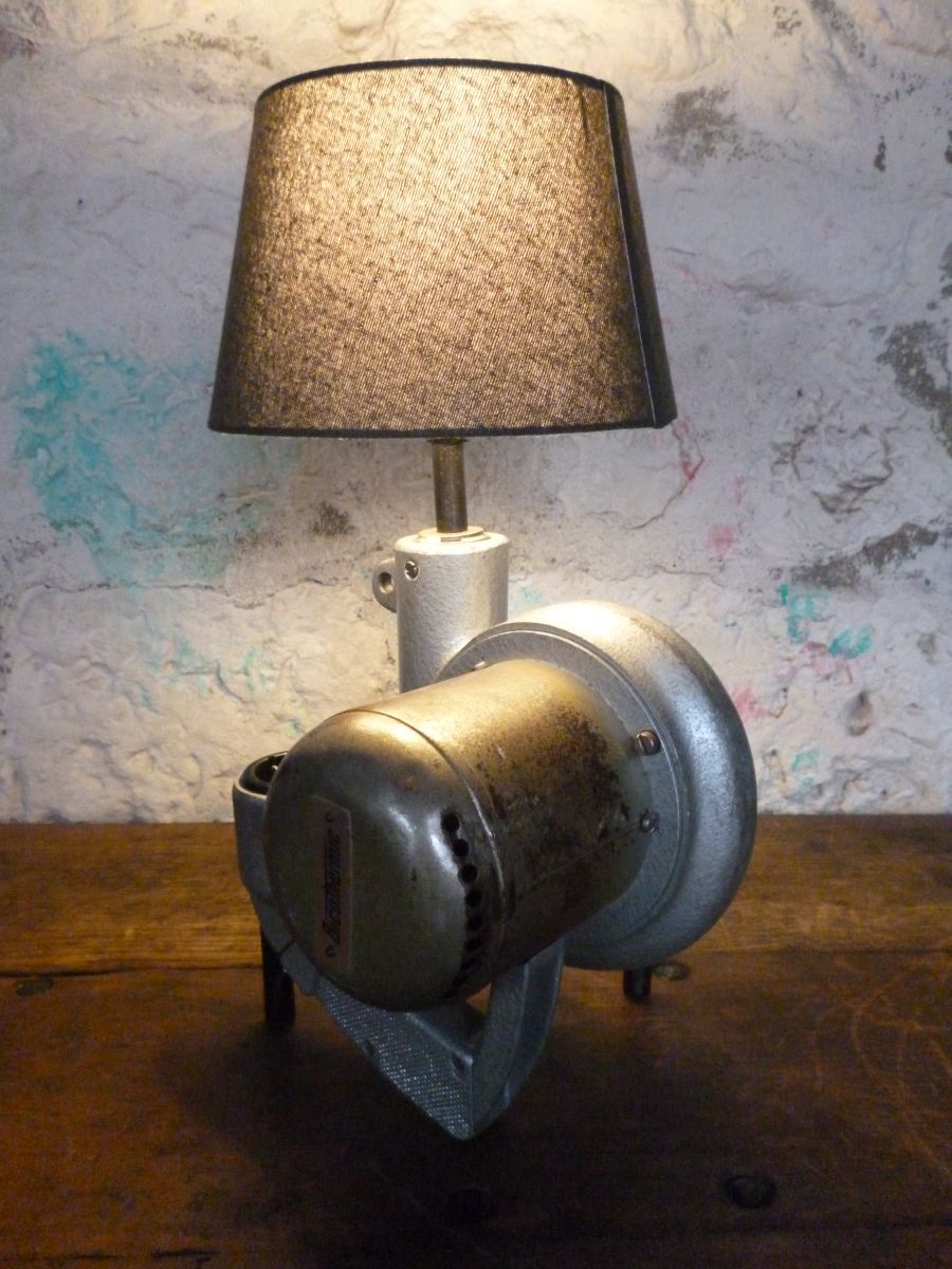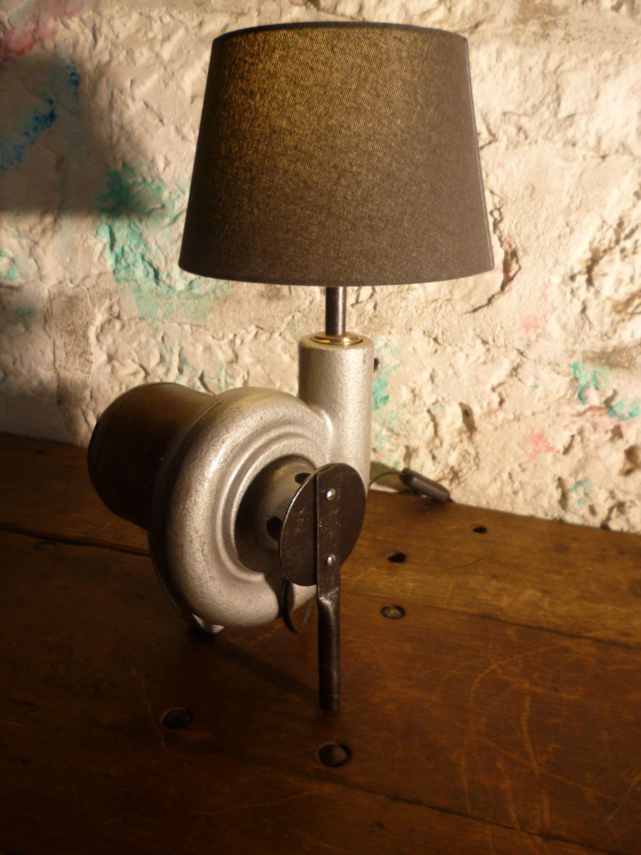Lampe design industriel realisee a partir d'une ancienne soufflerie a air chaud pour montage de garniture de rampe d'escalier . " BICOTHERMIC " .