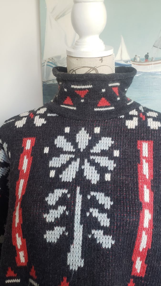 Pull vintage oversize chaud gris anthracite avec motifs jacquart bleu clair et rouge. Col roulé avec bordure roulottée. Pull pouvant être utilisé au ski pour faire du snow. Très facile d 'entretien, ne contient pas de laine. Ce pull est unisexe. Taille S homme de chez boga boo's mais peut aller jusqu'à taille L femme. Largeur d'épaules 60cm, taille 56cm et longueur du pull 65cm. Pull porté mais en très bon état