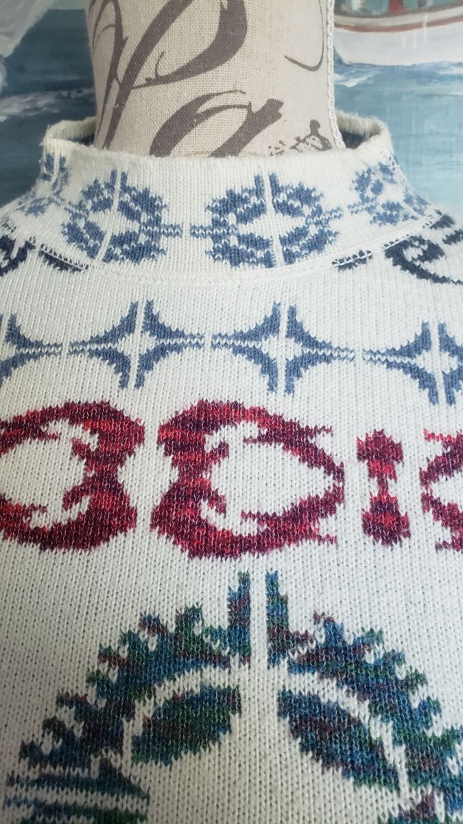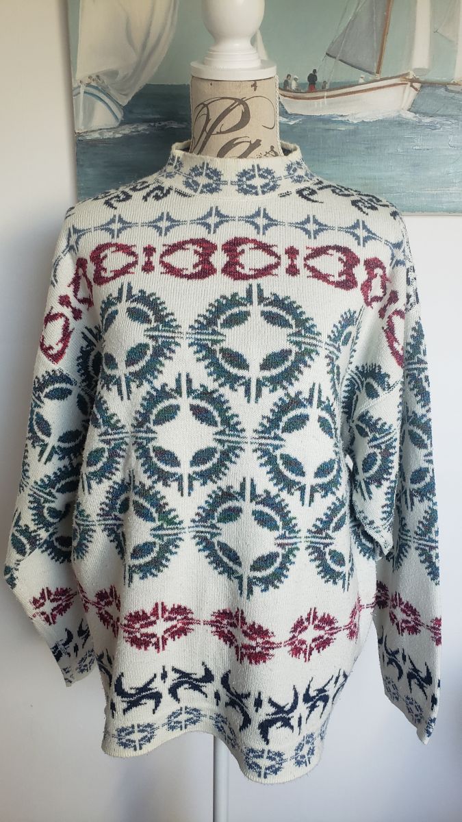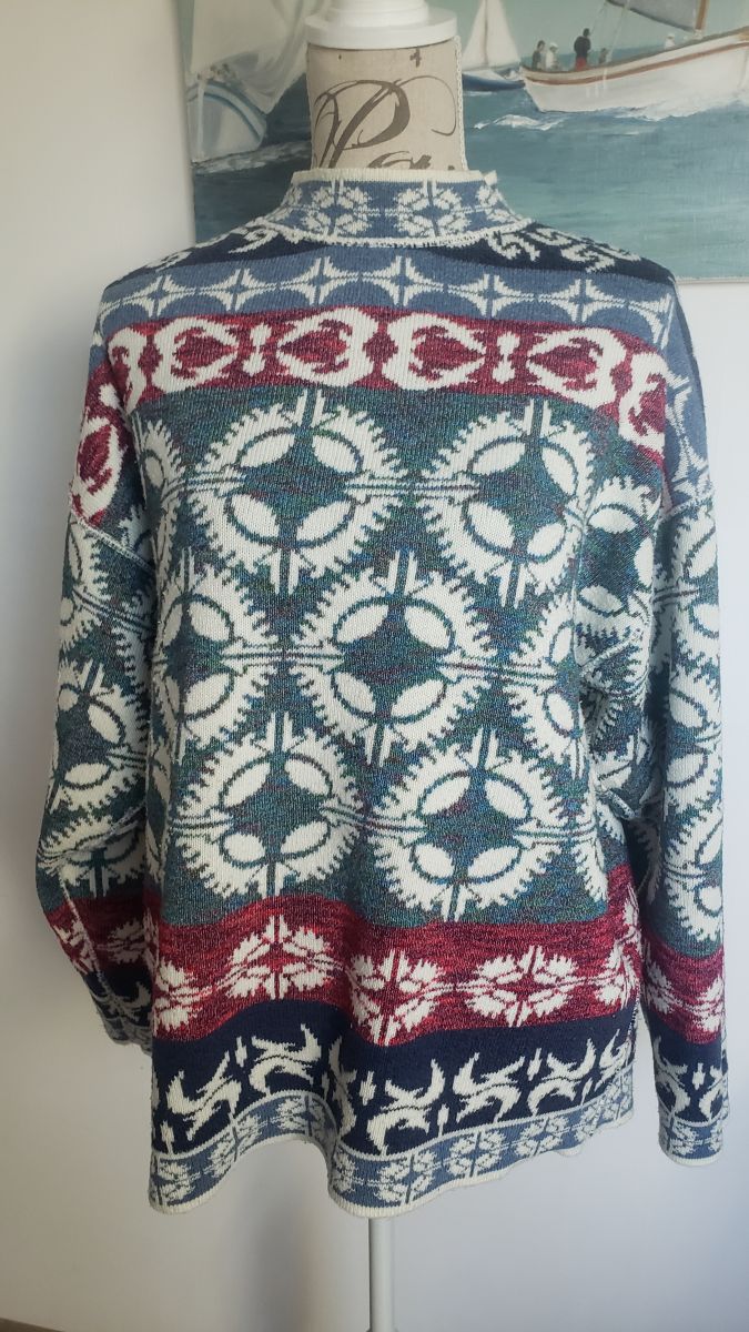 Pull vintage oversize coloré réversible. D'un coté: motifs bleus et rouges sur fond bie (blanc cassé), de l'autre: motifs blancs sur fond vert, rouge et bleu marine. Col cheminée. Etiquette dans le dos "make dream" Très chaud et agréable à porter. Se porte large. Taille M/L. Pull porté mais en très bon état.