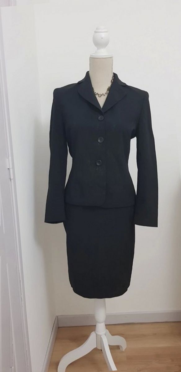 Jupe : courte droite, toute doublée, ceinture haute pincée, fente arrière, fermeture par zip milieu dos