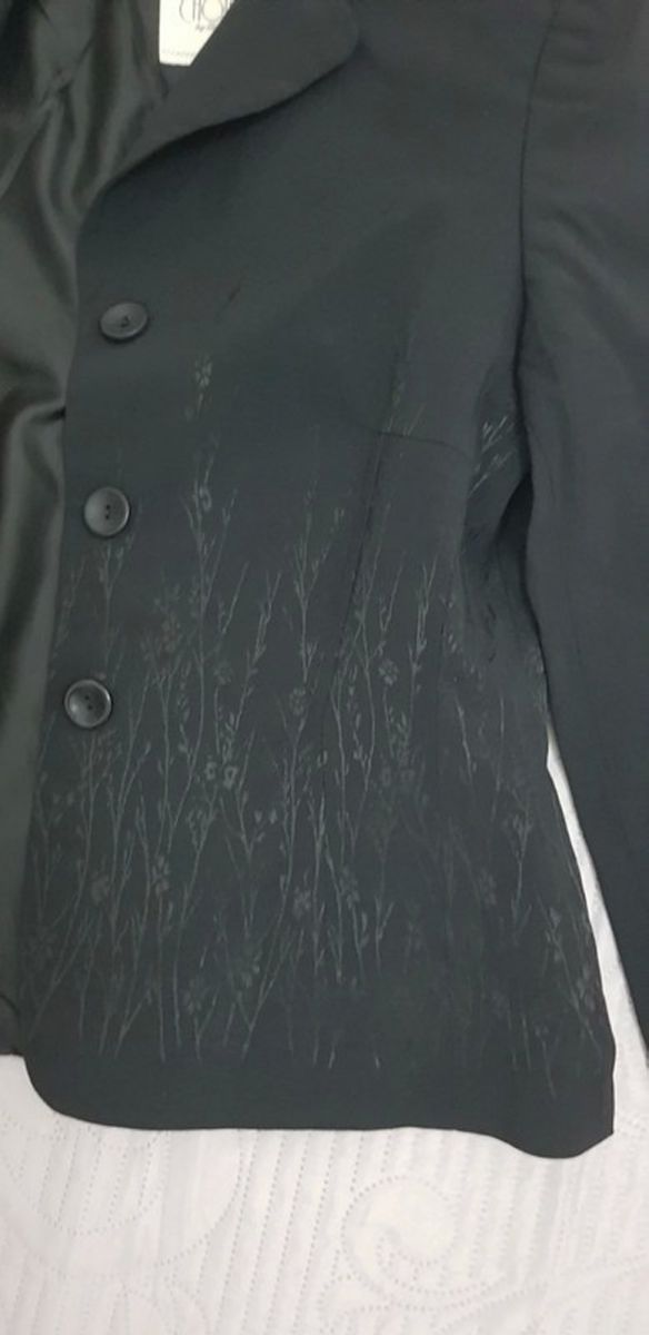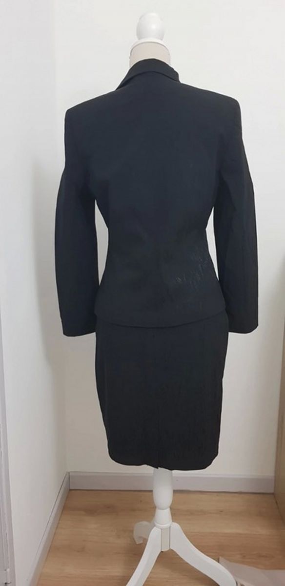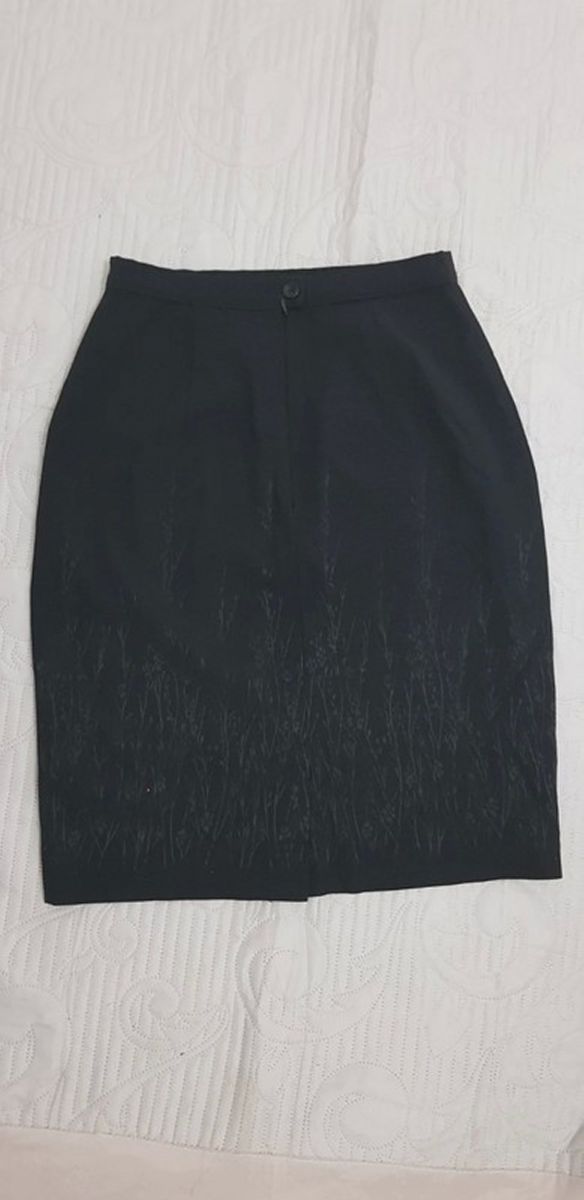 Bel ensemble jupe vintage coloris noir, orné de discrets motifs floraux légèrement irisés sur les 2 pièces.