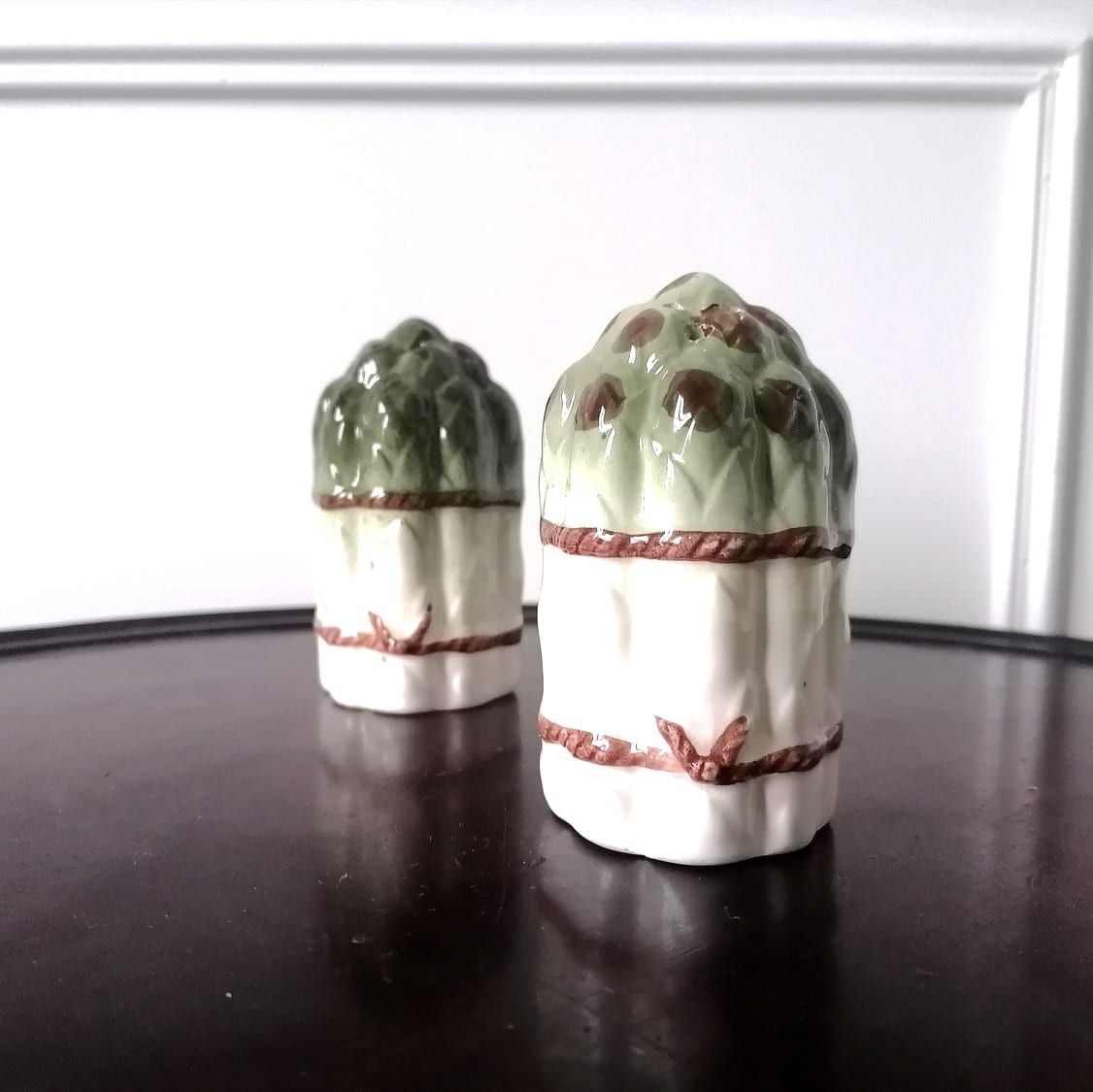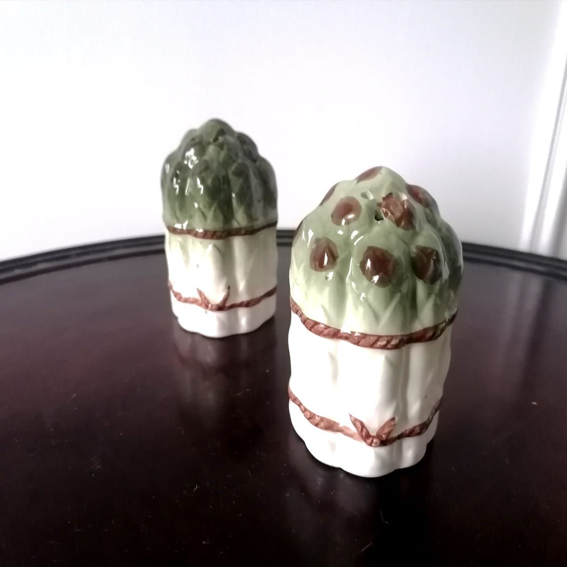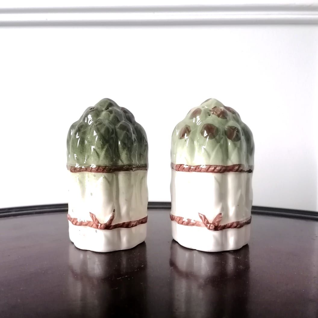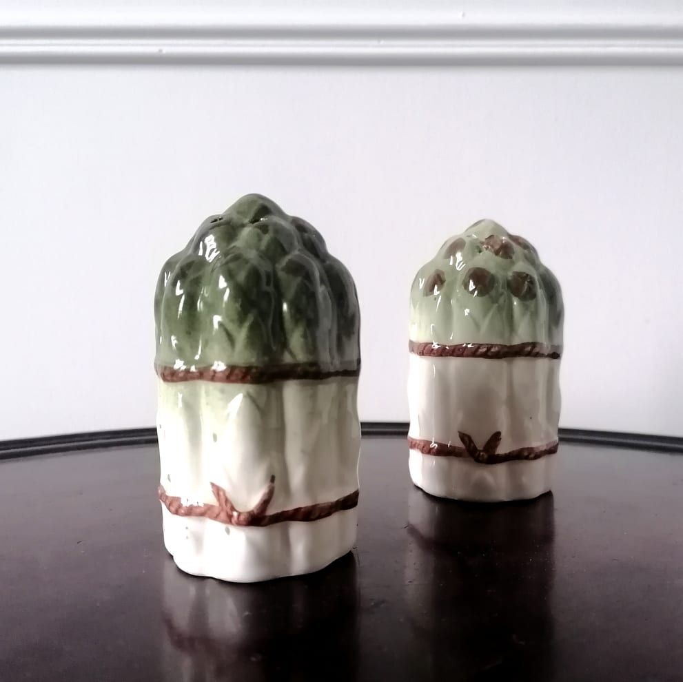Salière et poivrier en arbotine vintage, années 1960. En forme de bottes d'asperges.