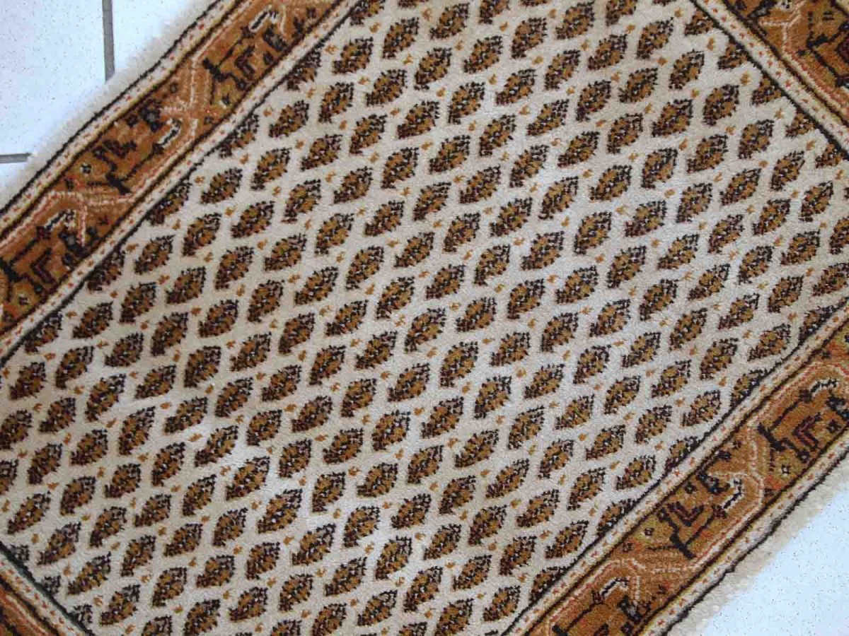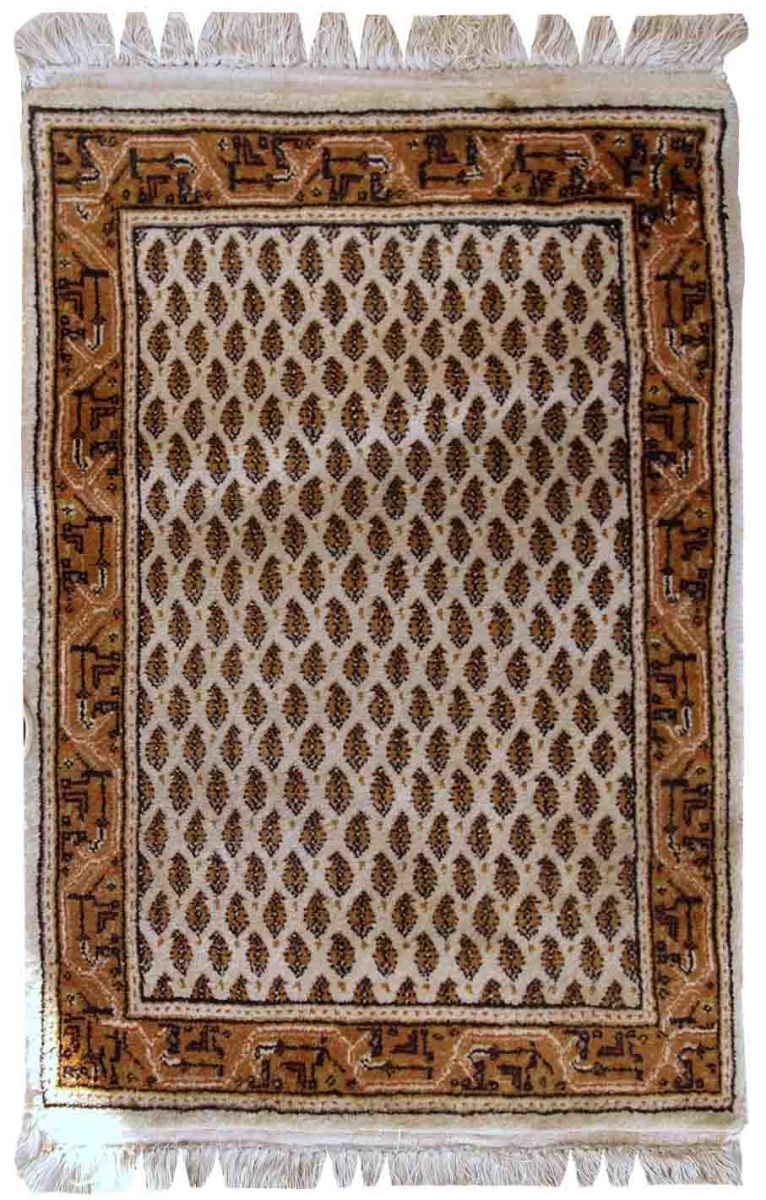 Vintage Indian rug in the style of Persian Seraband. Repeating pattern on the white field, the border is geometric in brown and olive shades. it is in original good condition with full thick pile.