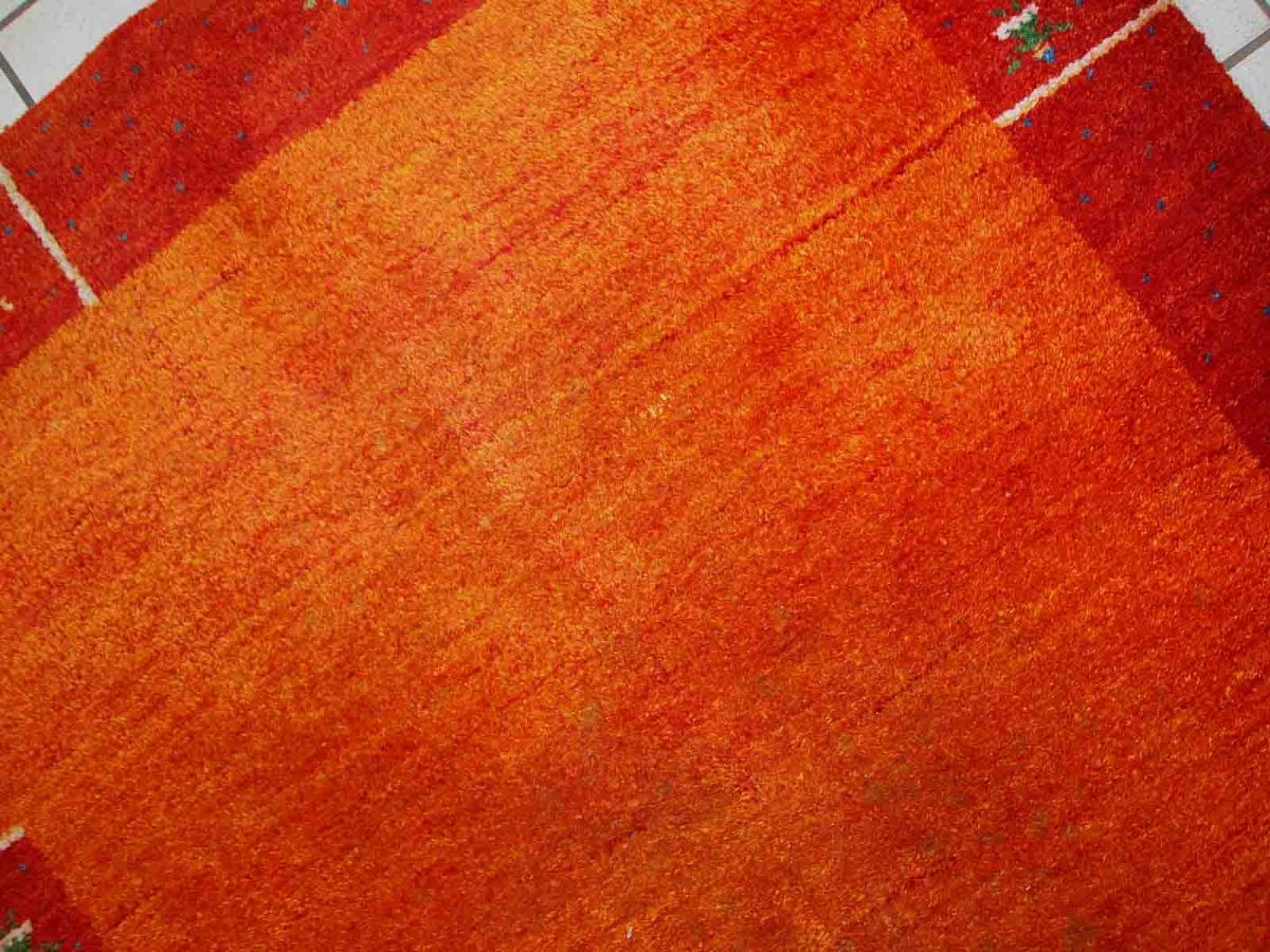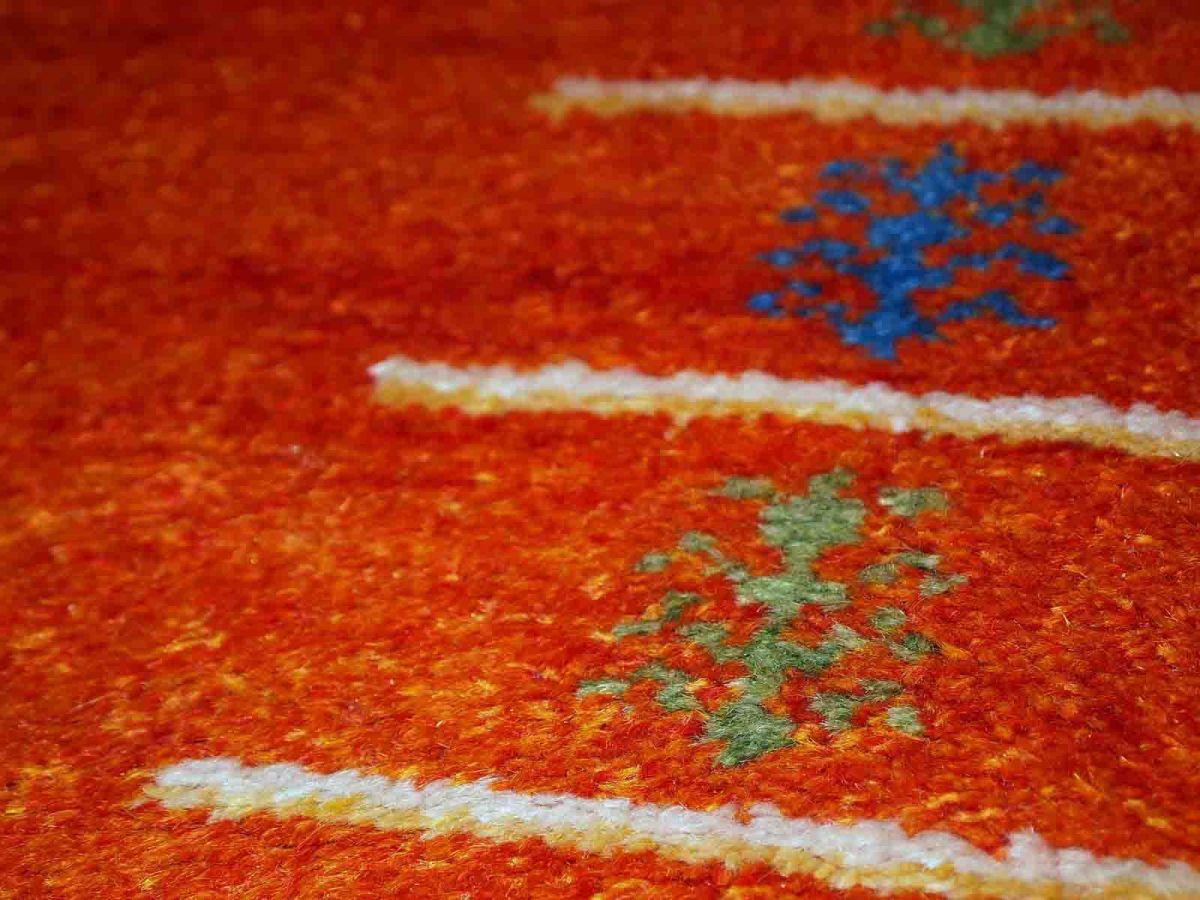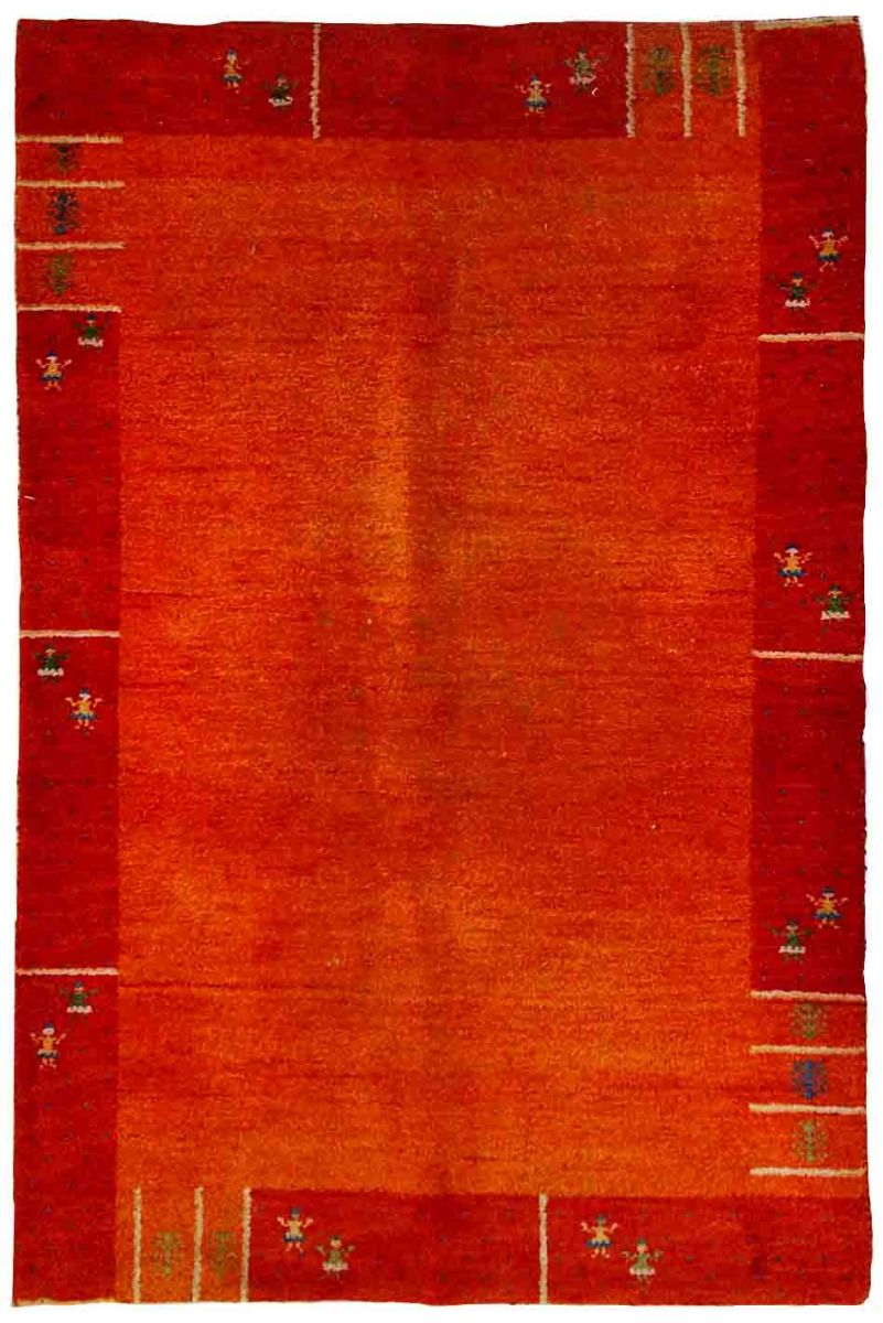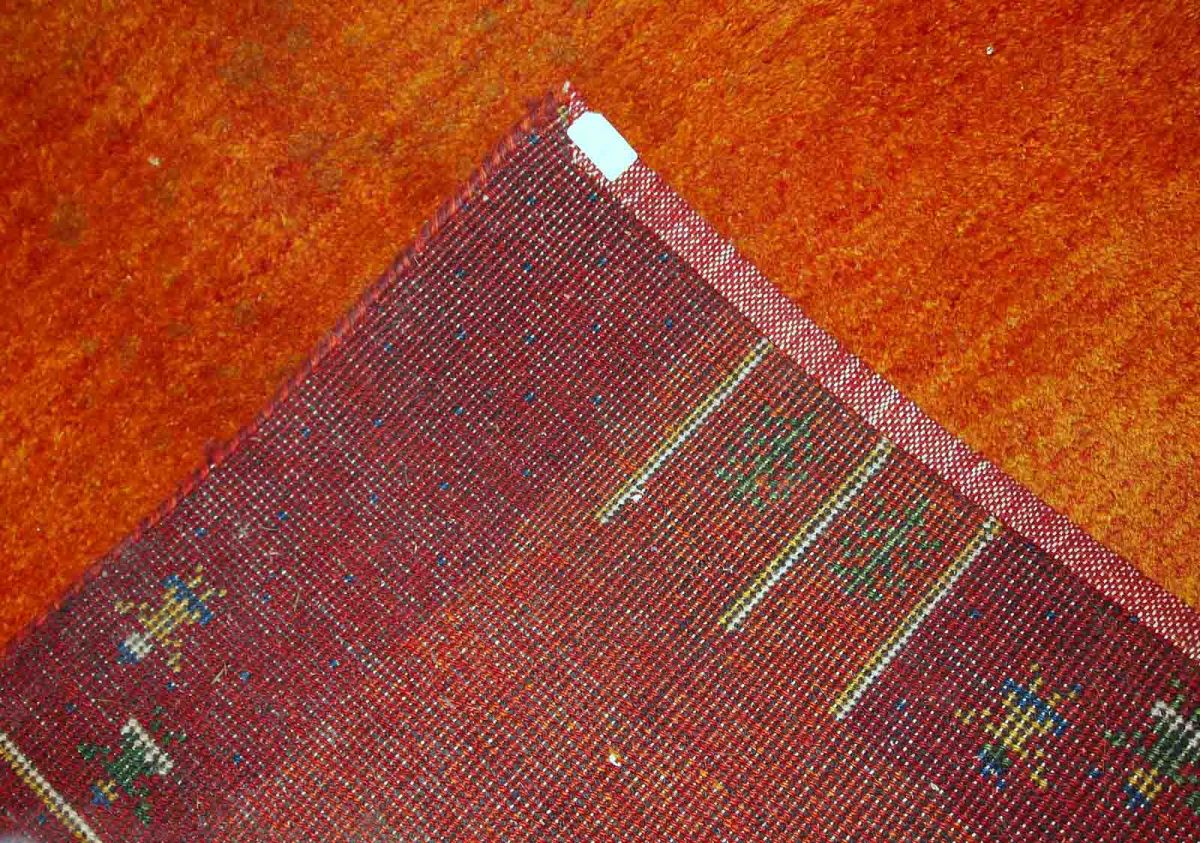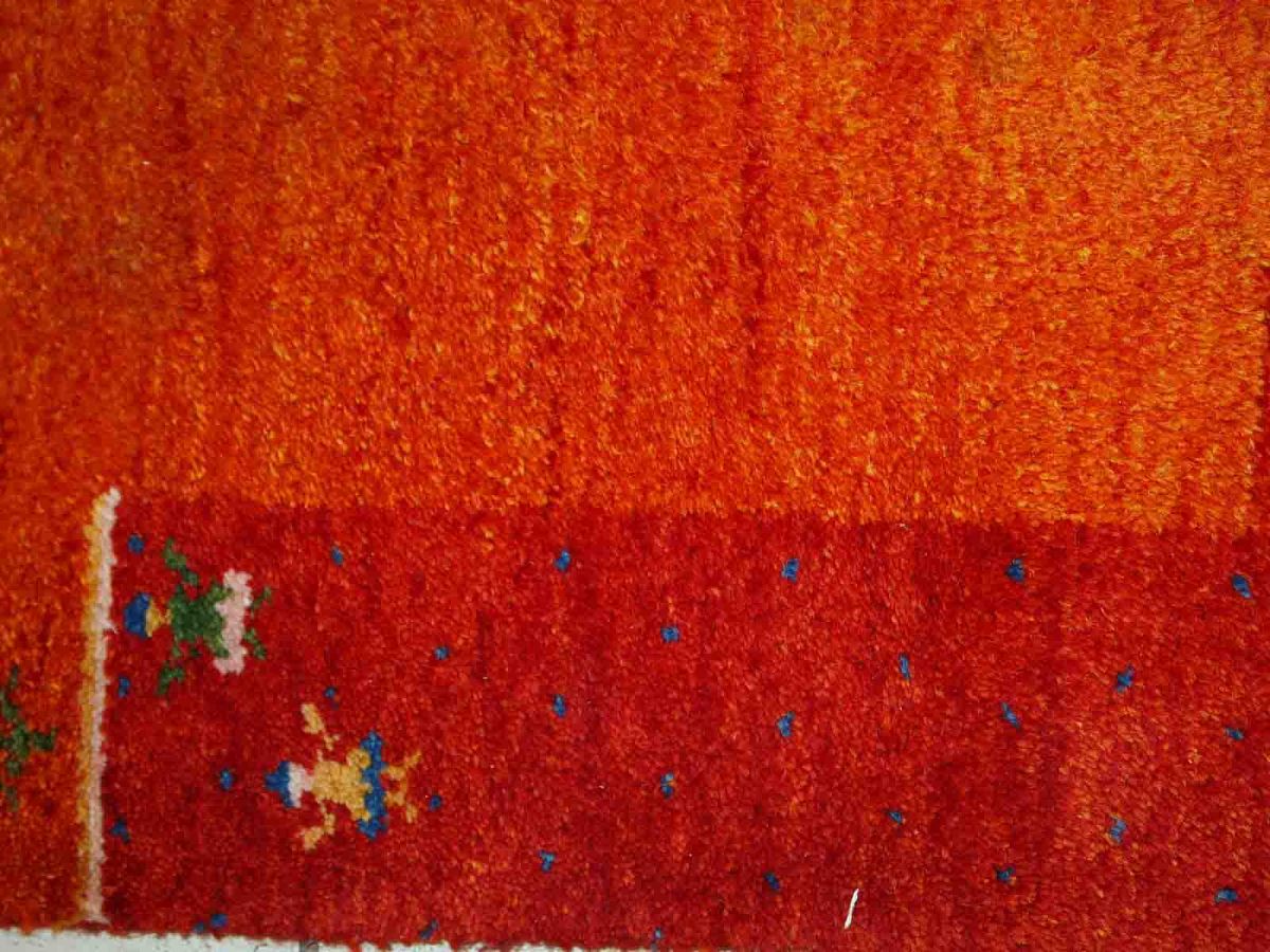 Handmade vintage Gabbeh rug in bright red (almost orange) shade with all-over design. The border has minimal decor. The rug is in original good condition.