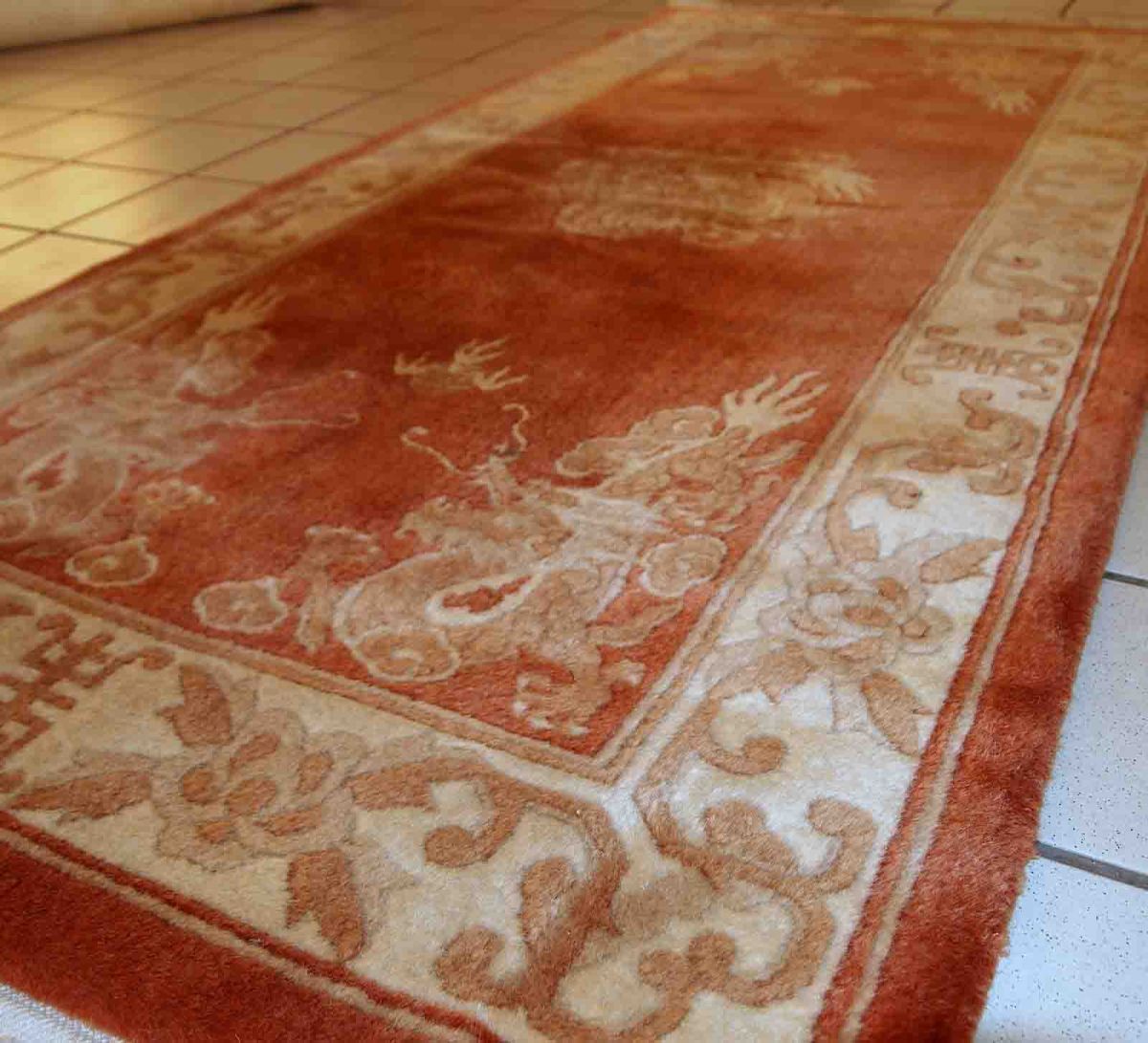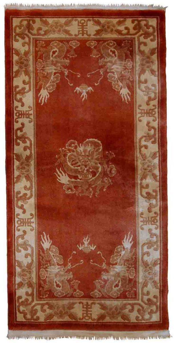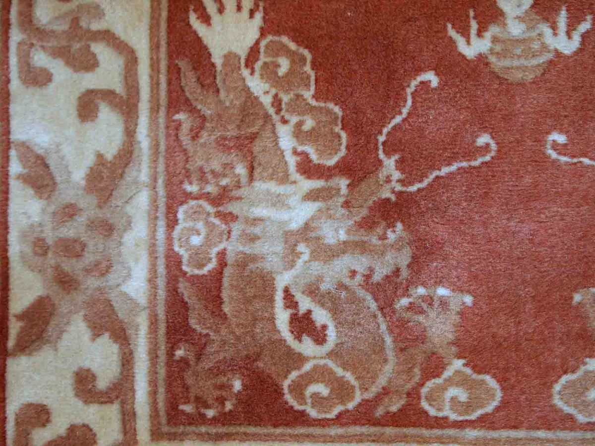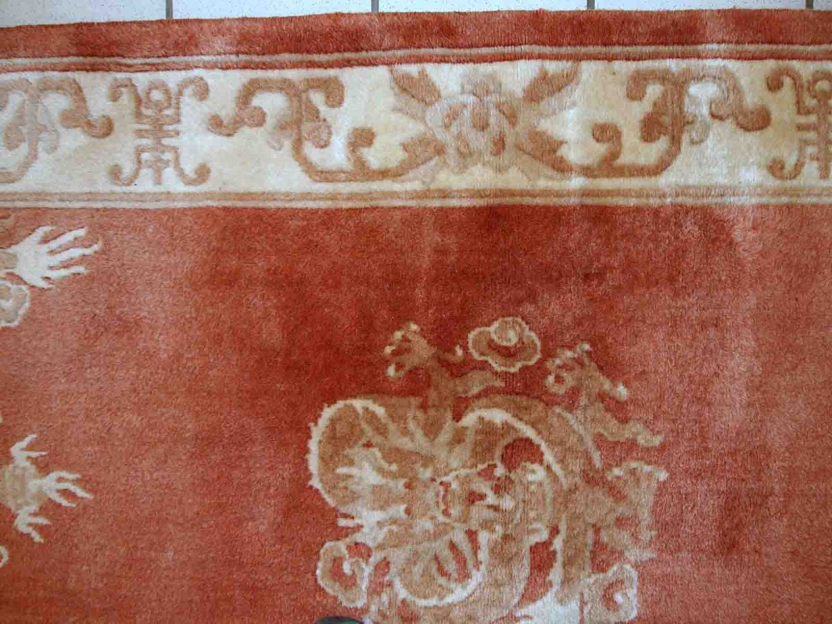 Handmade vintage Chinese Dragon rug in peach shade with beige border and brown ornaments and dragons. The rug made out of soft wool. It is in original good condition with full pile.