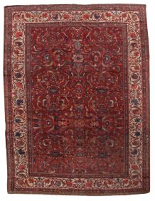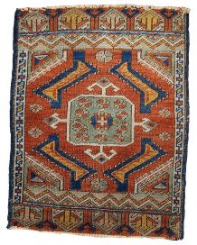 Handmade antique Khamseh rug from the beginning of 20th century with symetric design and deep shades. The rug has some low pile.