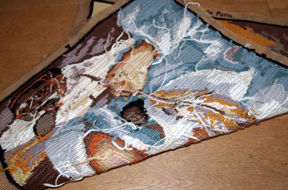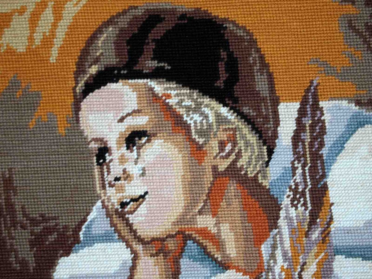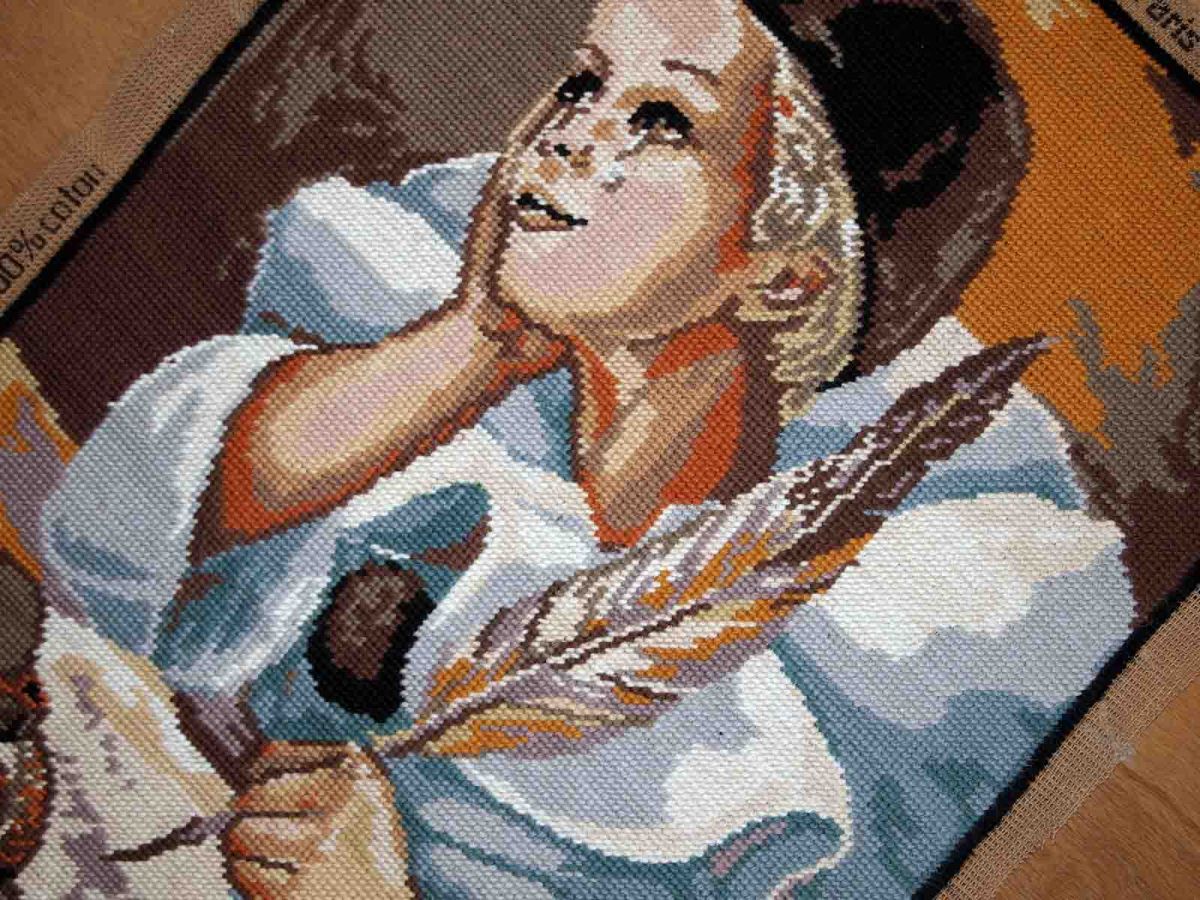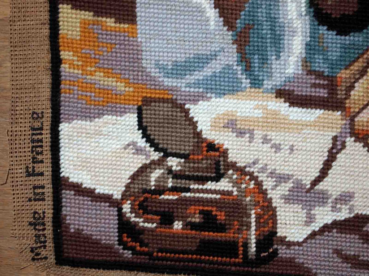 Vintage French handmade tapestry from the end of 20th century. It can be framed or used as a pillow case. The size is including the frame, without frame: (37cm x 50cm = 1.2' x 1.6').